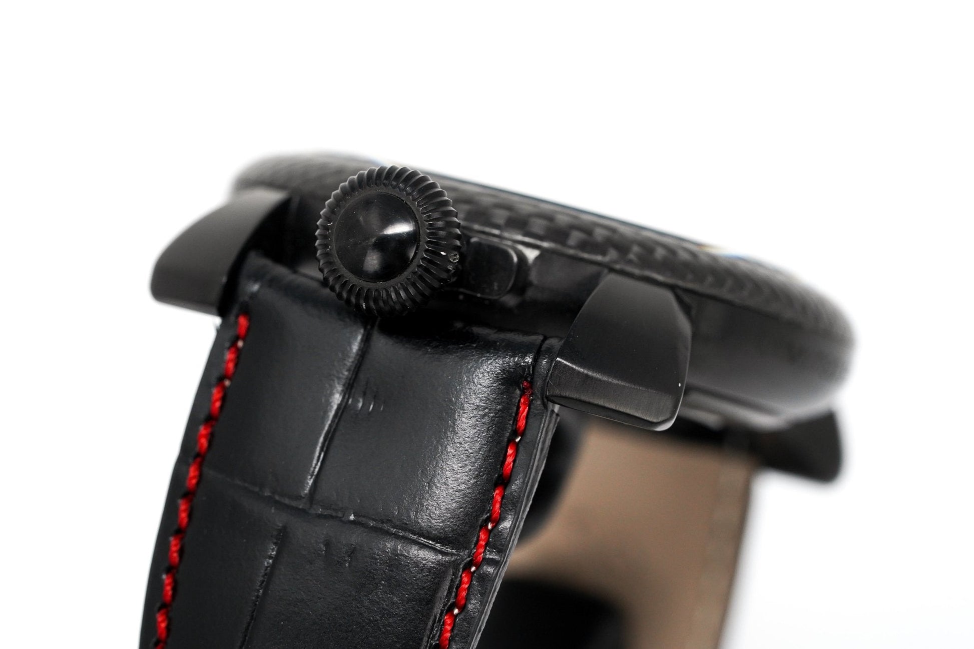 Black Carbon Fibre Dial with Red Arabic Hour Markers - Stainless Steel Luminous White Hour and Minute Hands - Small Seconds at 6 O'Clock.