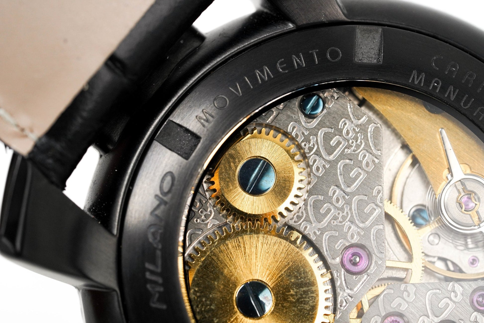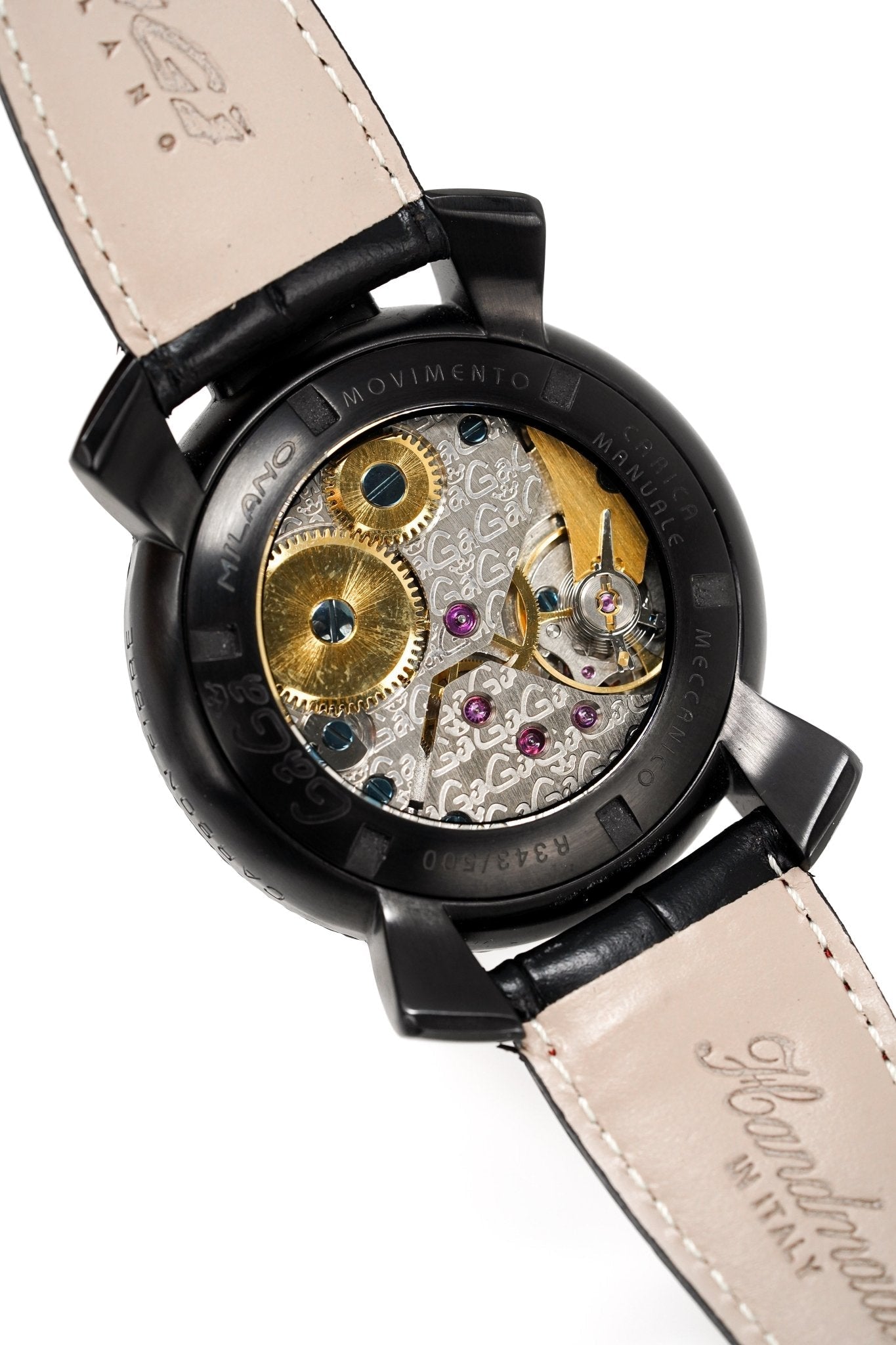 48mm x 16mm Black PVD 316L Stainless Steel Case - Black Carbon Fibre Bezel - Sapphire Crystal - Exhibition Caseback which Shows off the Balance Spring, the Wind Mechanism, and The GaGà Milano craftsmanship - Push-Pull Crown.