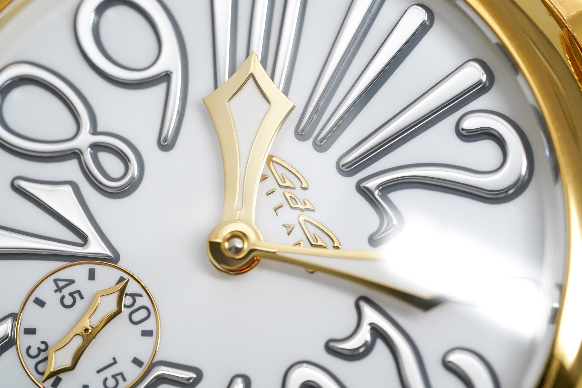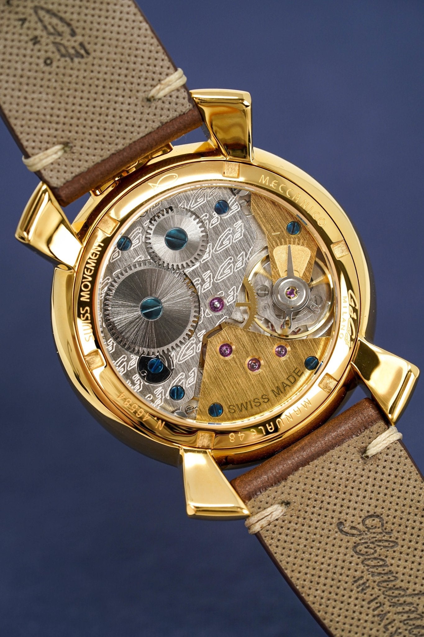48mm x 16mm Yellow Gold 316L Stainless Steel Case - Sapphire Crystal - Exhibition Caseback which Shows off the Balance Spring, the Wind Mechanism, and The GaGà Milano craftsmanship - Push-Pull Crown.