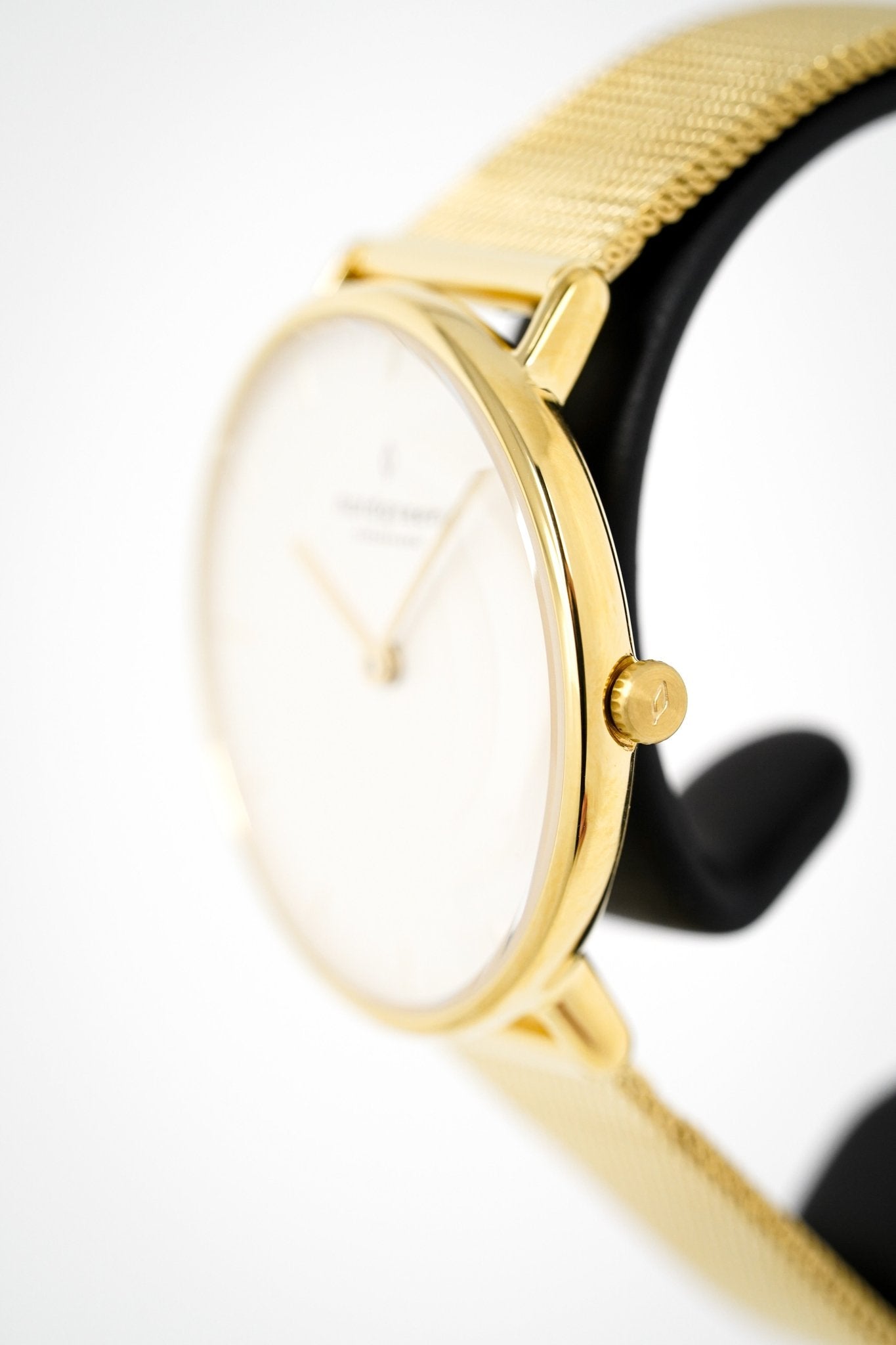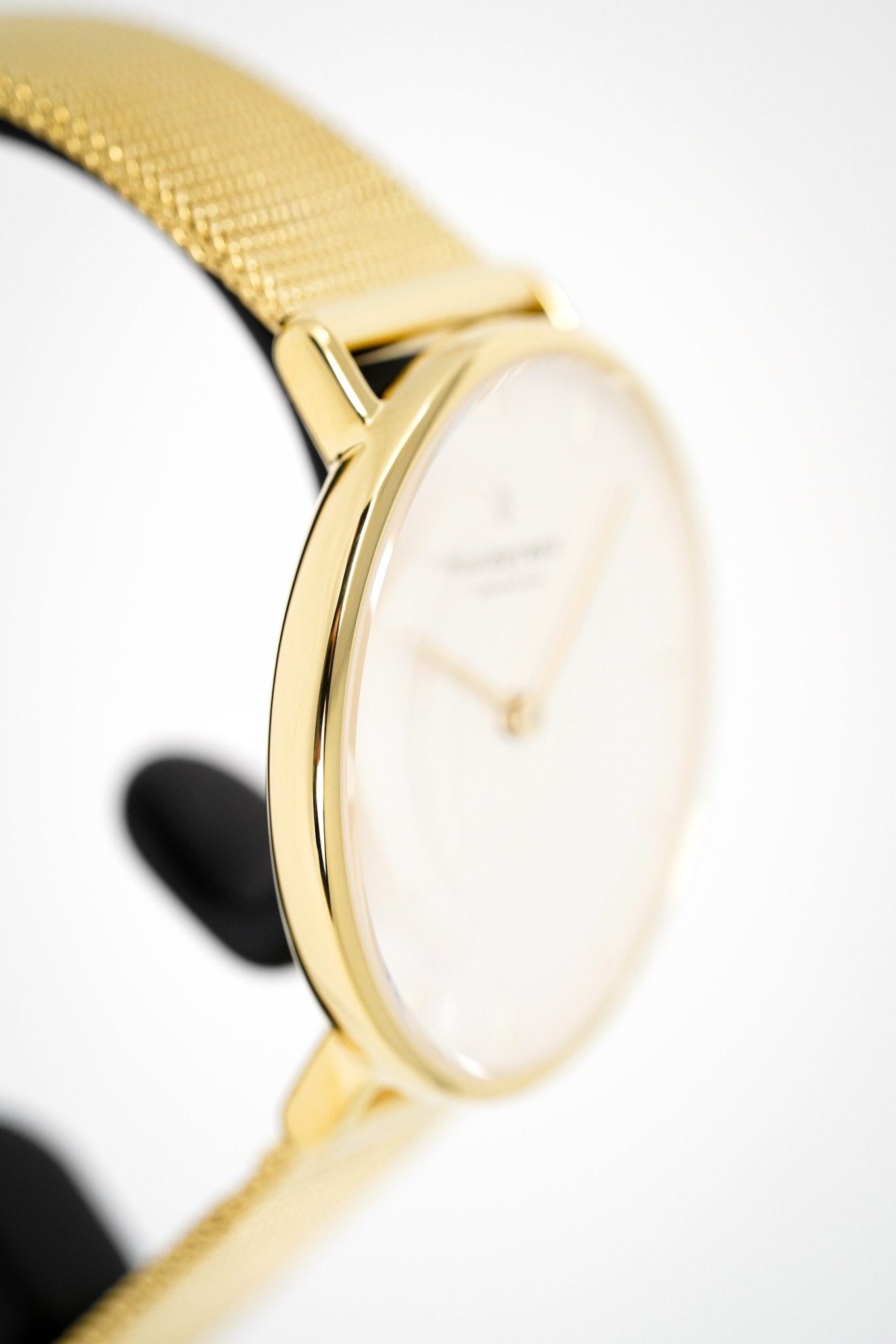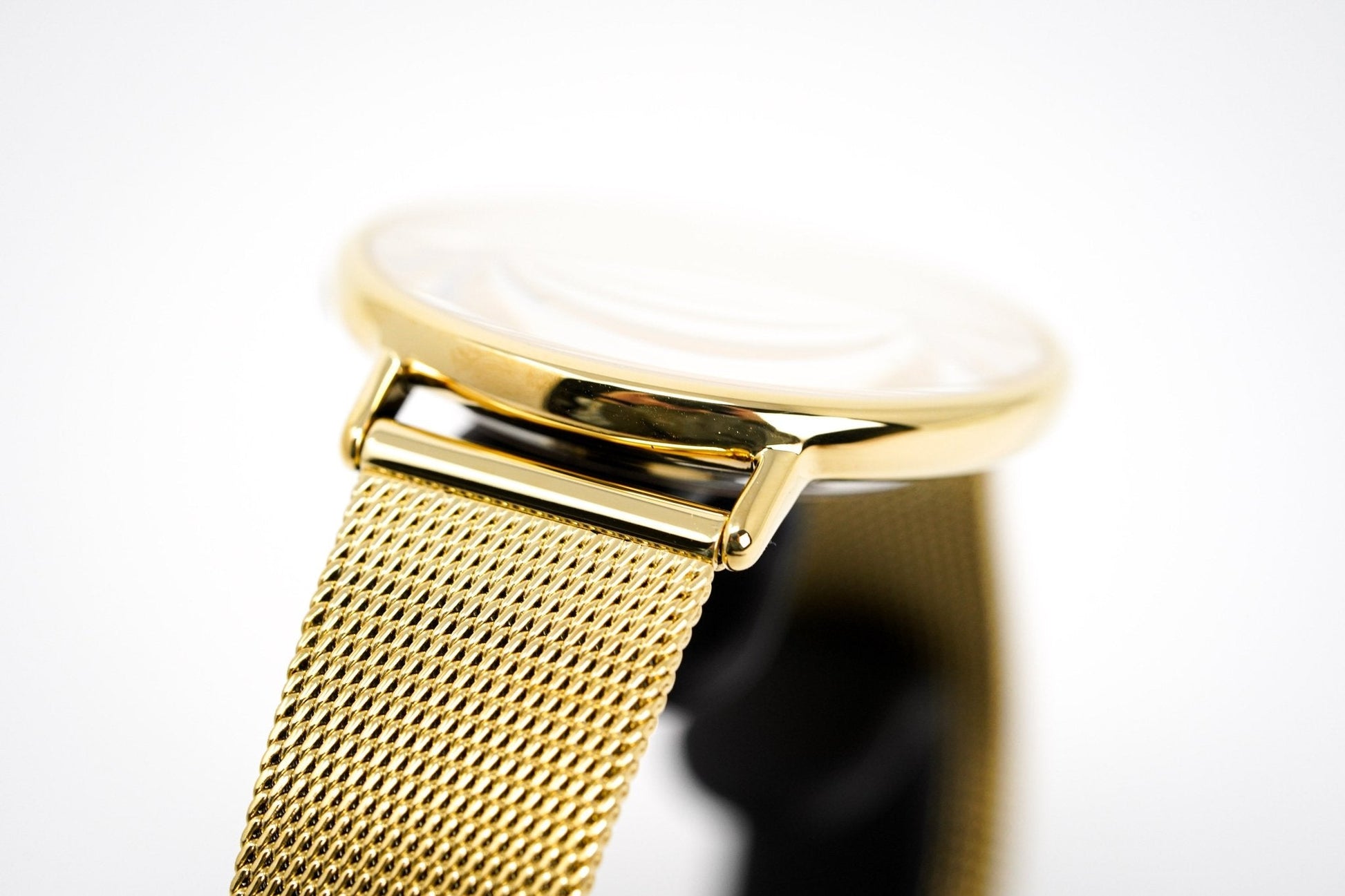 32mm x 7mm Yellow Gold Plated 316L Stainless Steel Case. Hardened Mineral Glass.
