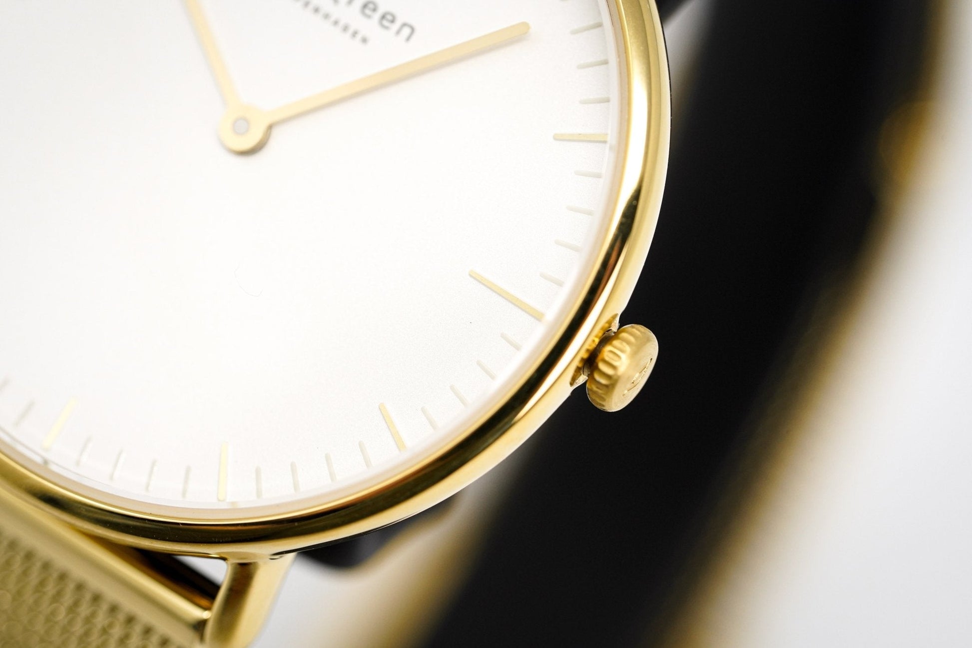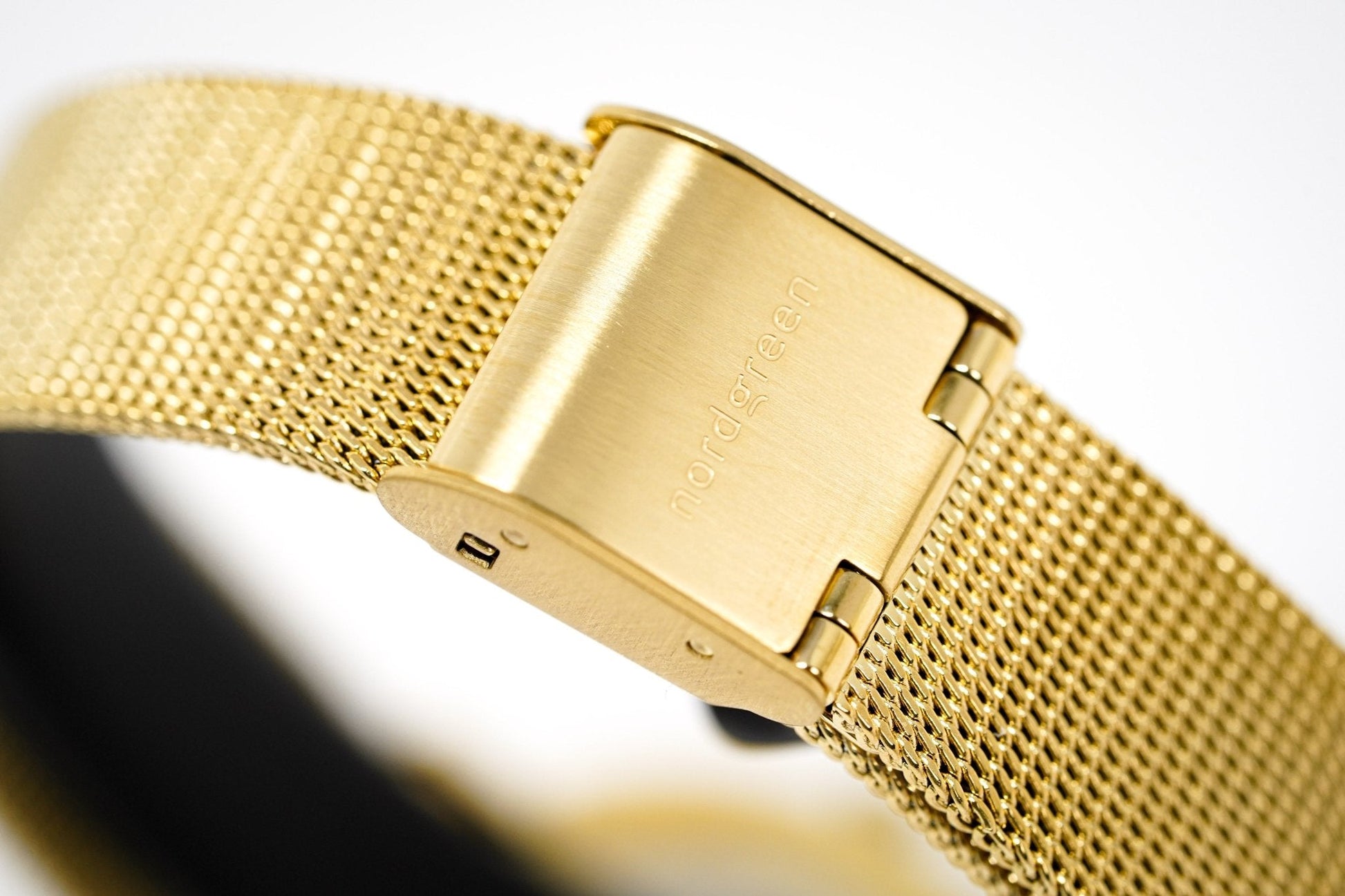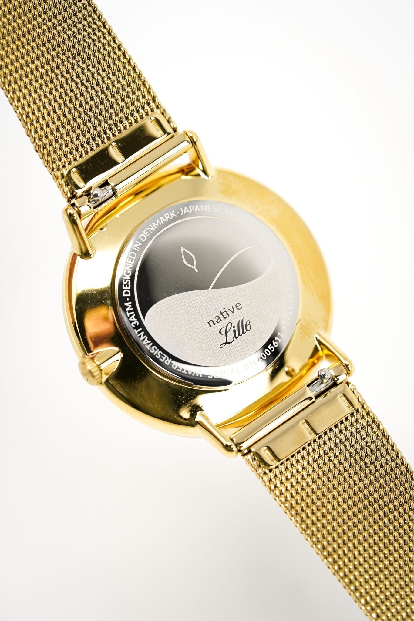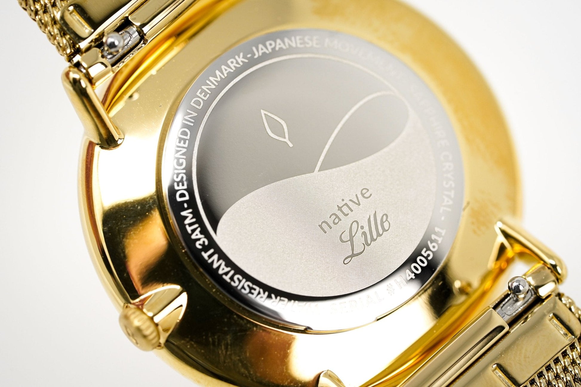 32mm x 7mm Yellow Gold Plated 316L Stainless Steel Case. Hardened Mineral Glass.