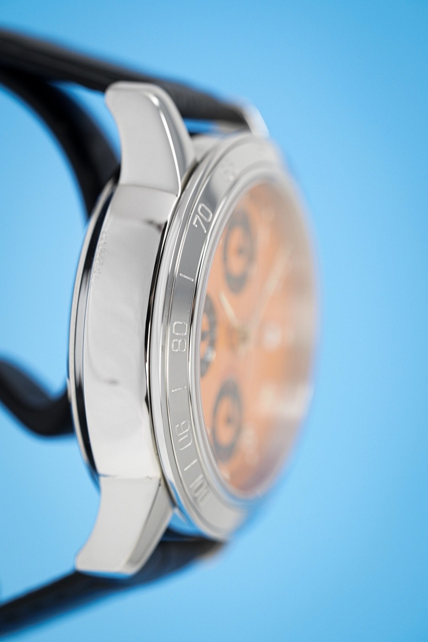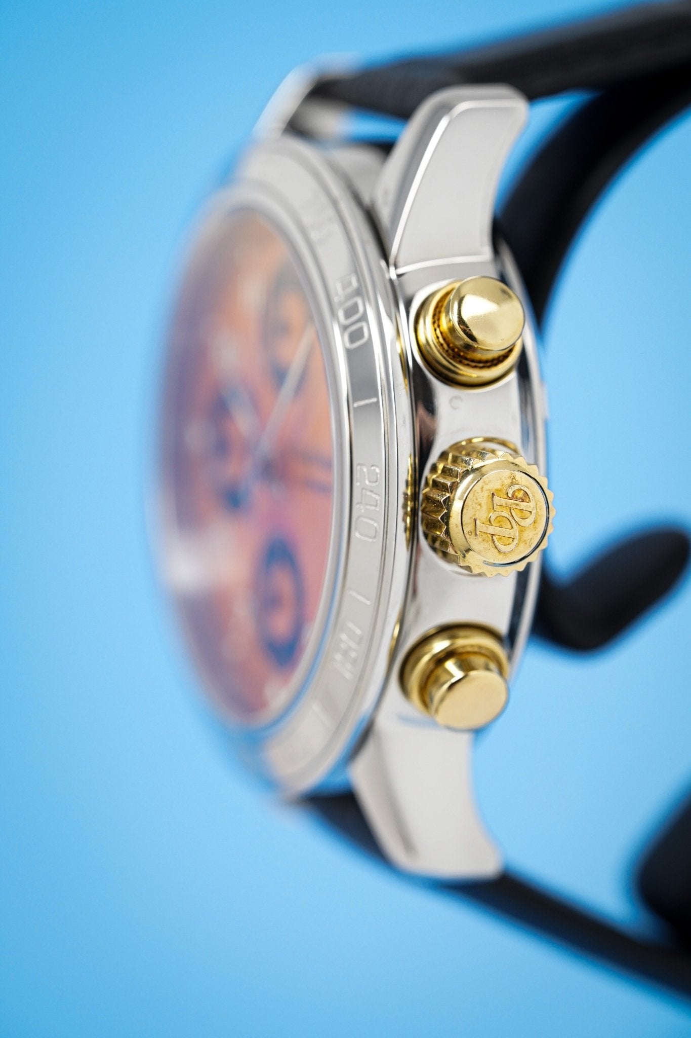 Orange Dial. Applied Yellow Gold Luminous Indexes. Polished Yellow Gold Hands. 30 Minute Counter at 12. Small Seconds at 9. 12 Hour Counter at 6. Date Window at 3.