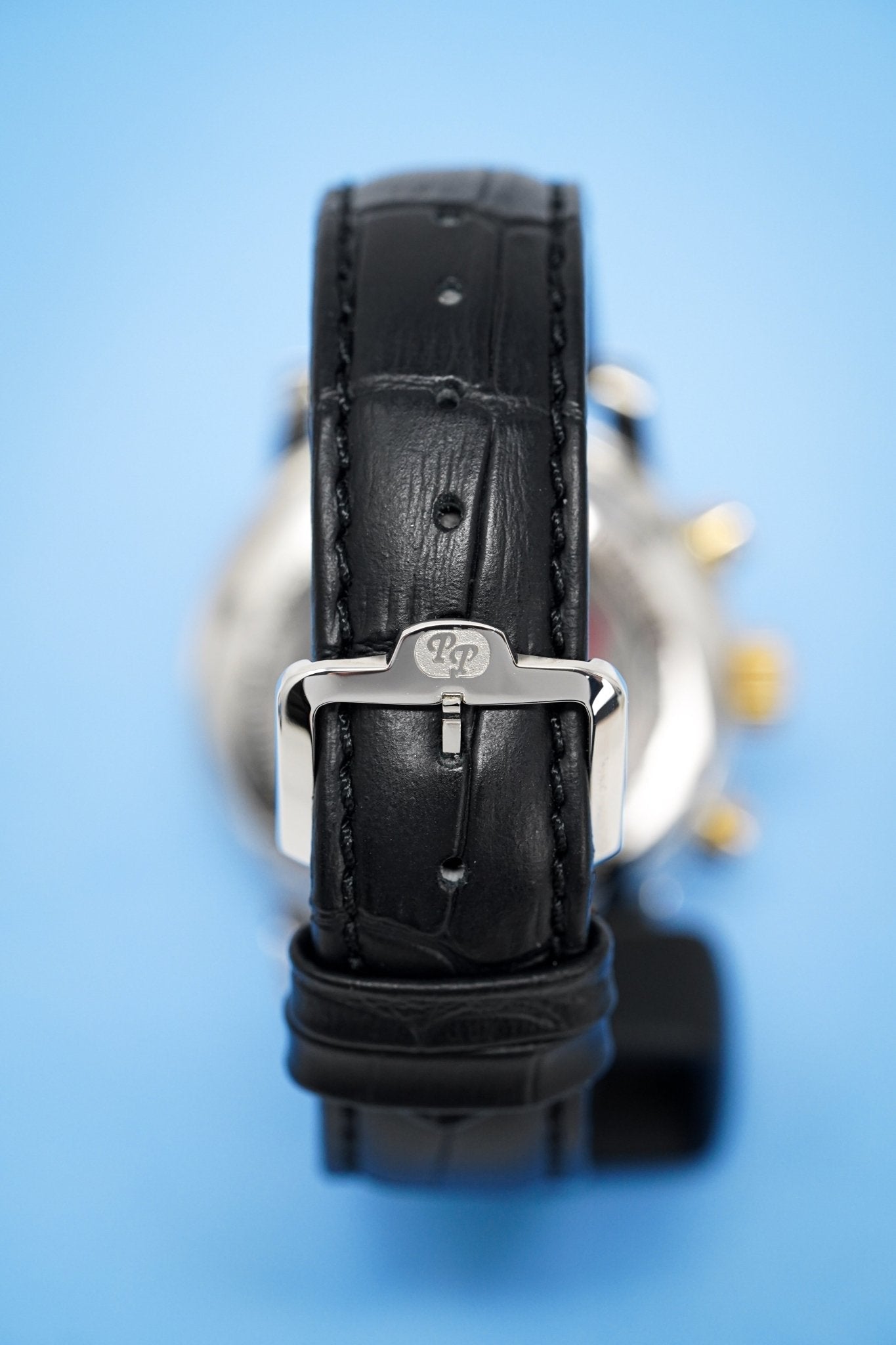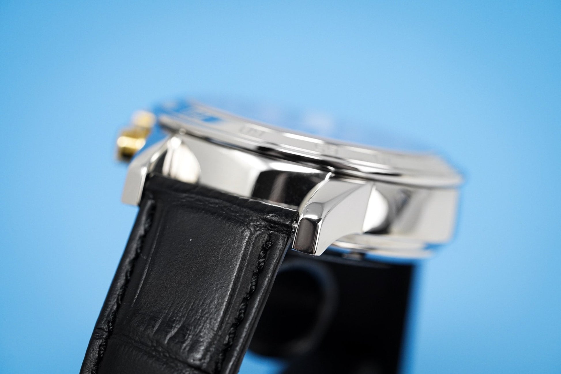 38mm x 14mm Polished 316L Stainless Steel Case. Stainless Steel Tachymeter Bezel. 18kt Yellow Gold Plated Steel Crown and Pushers. Screw Down Caseback