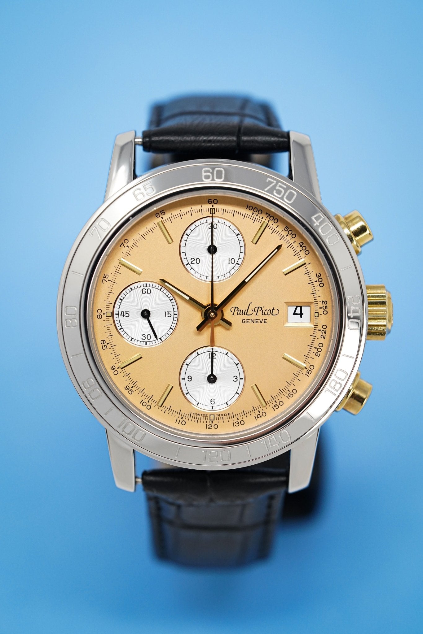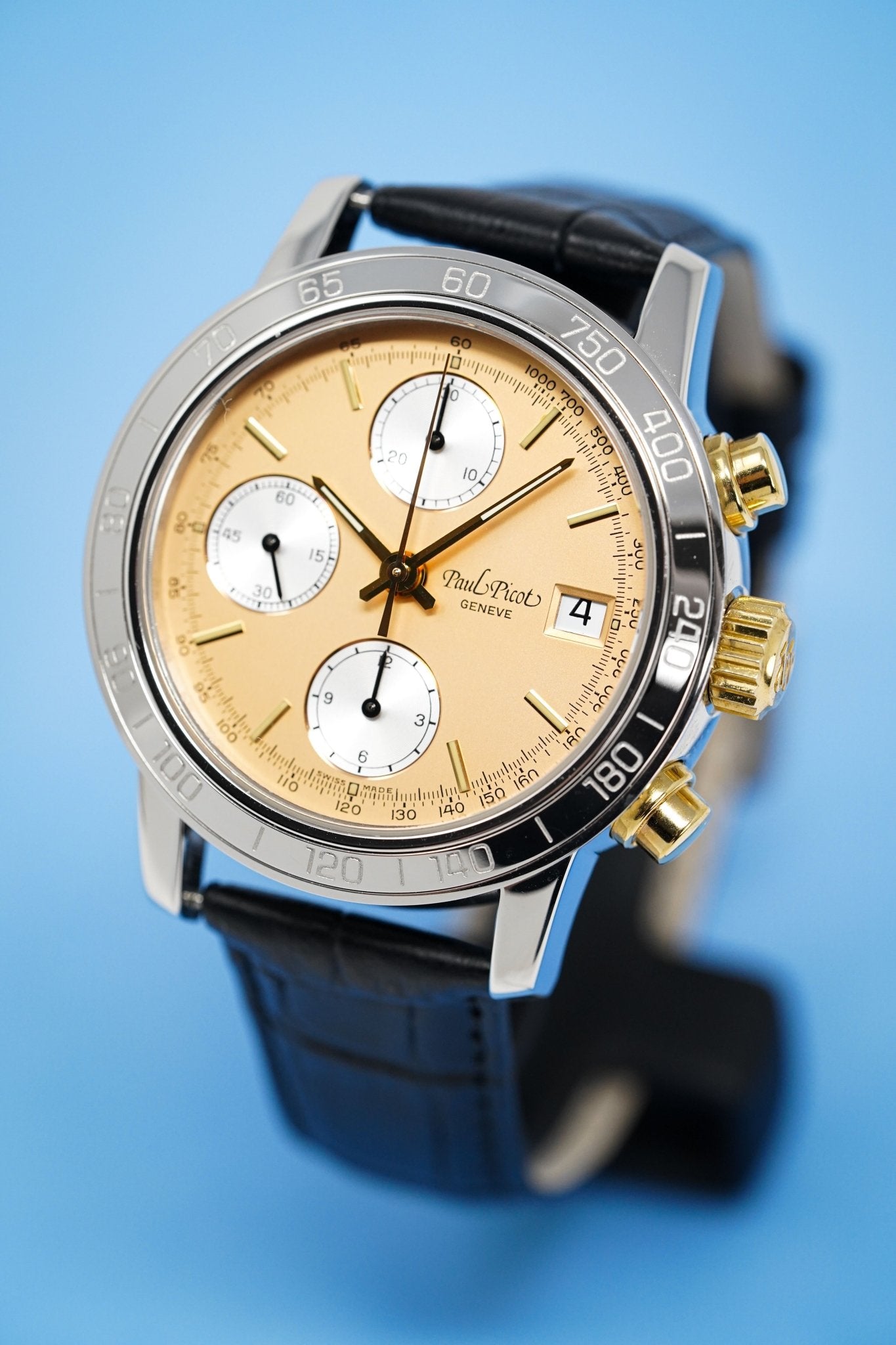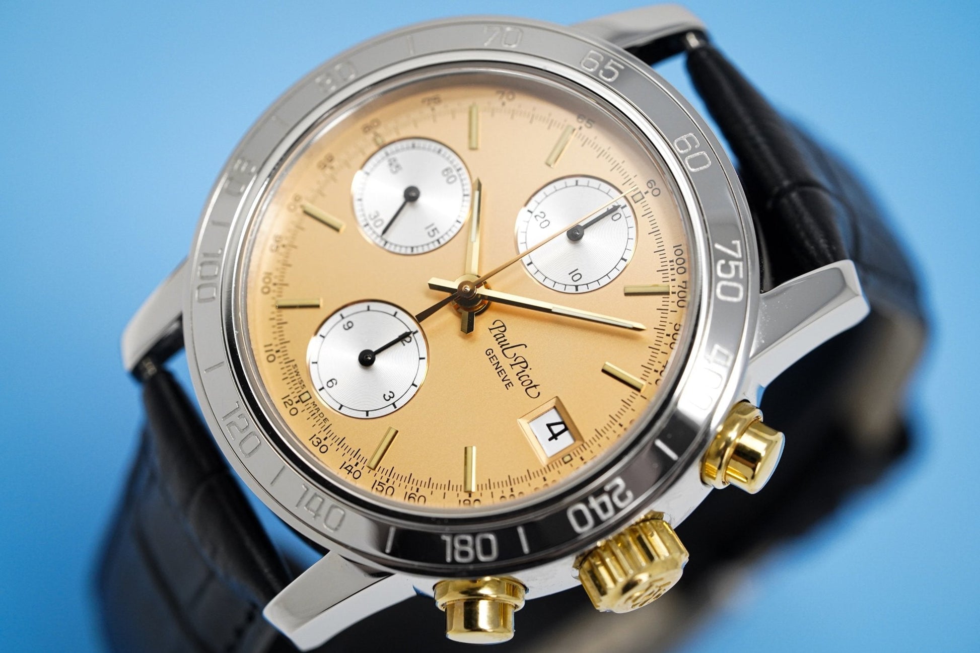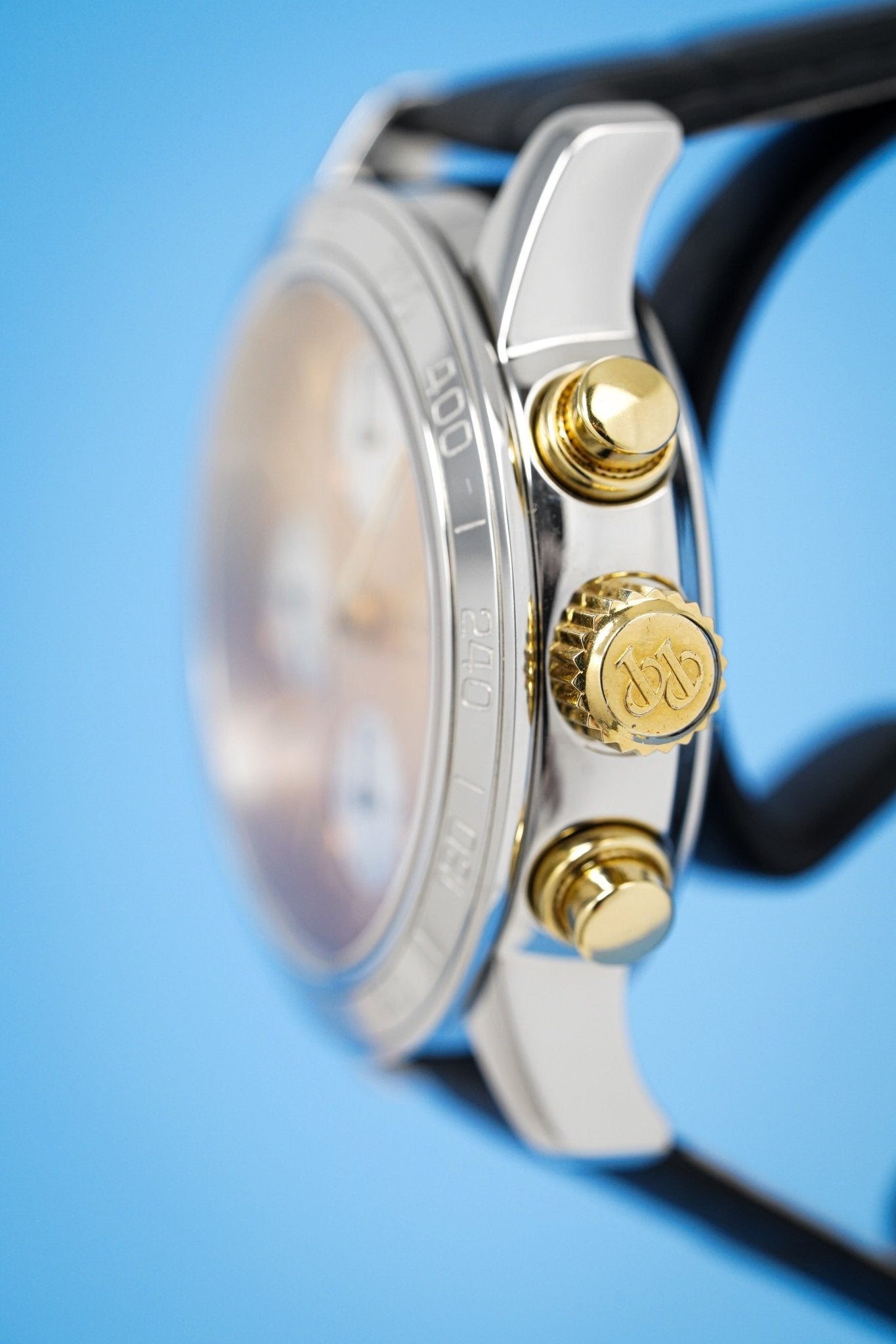 38mm x 14mm Polished 316L Stainless Steel Case. Stainless Steel Tachymeter Bezel. 18kt Yellow Gold Crown and Pushers. Screw Down Caseback