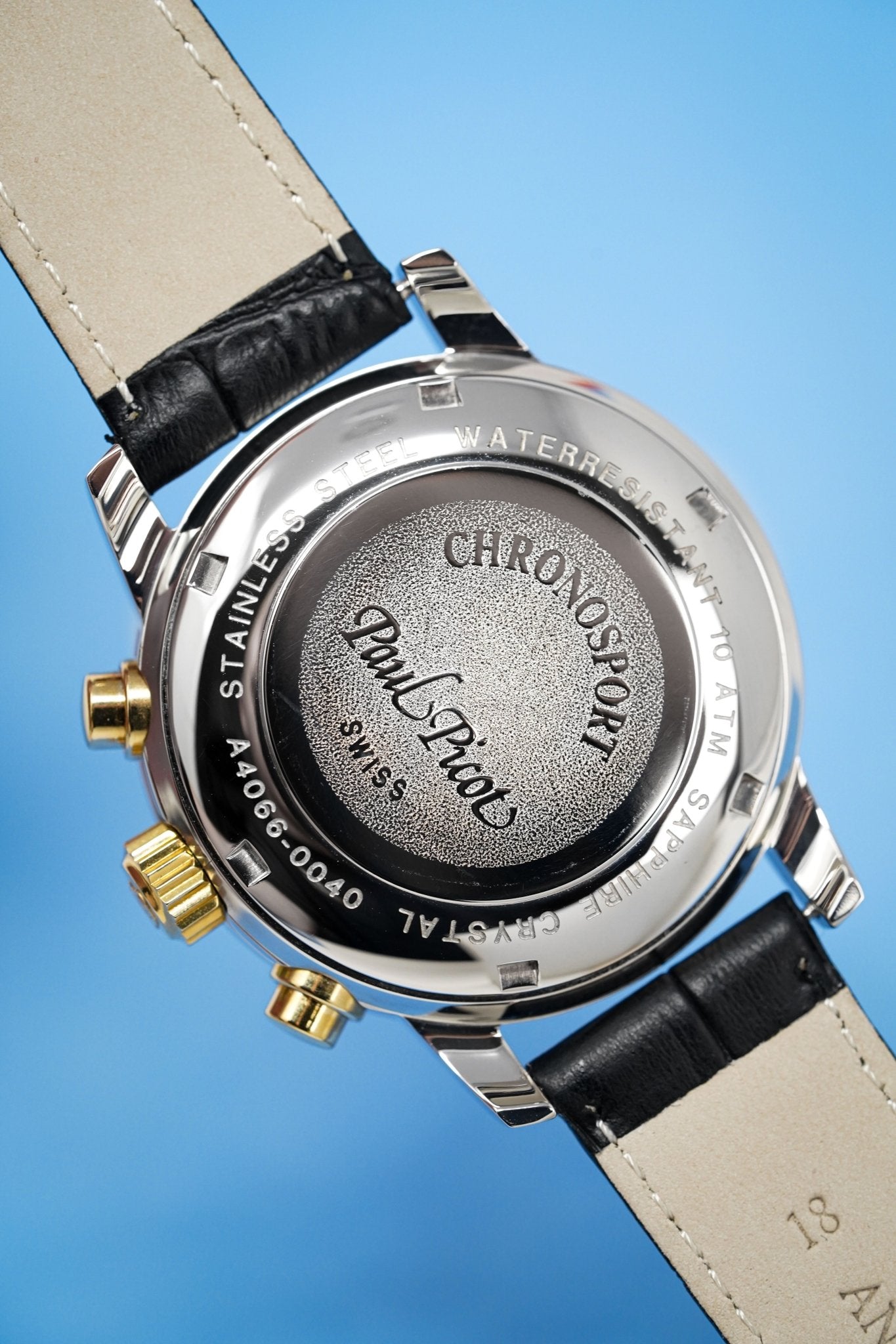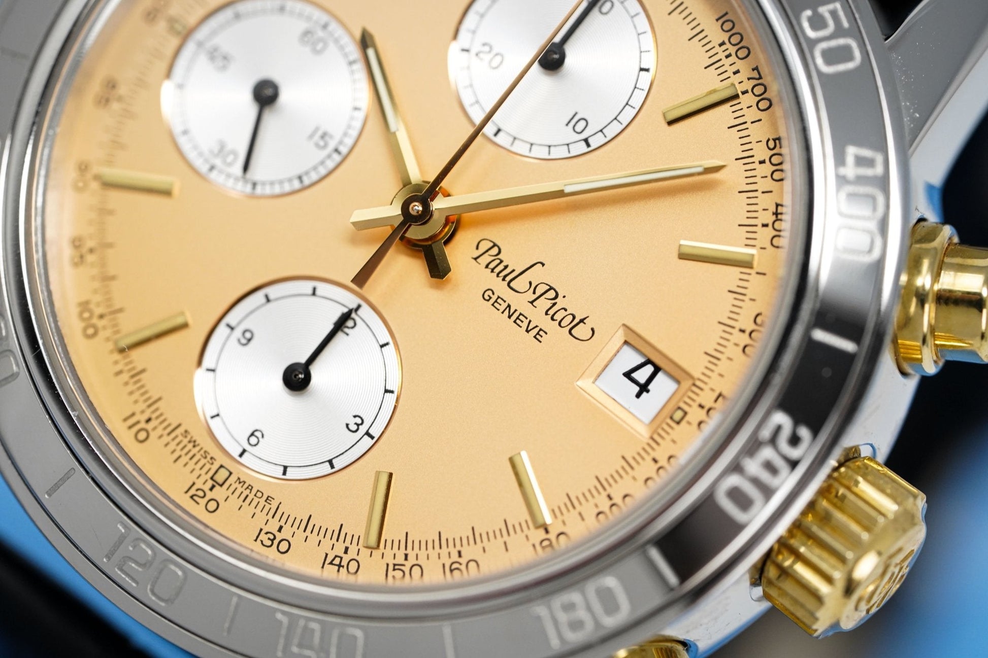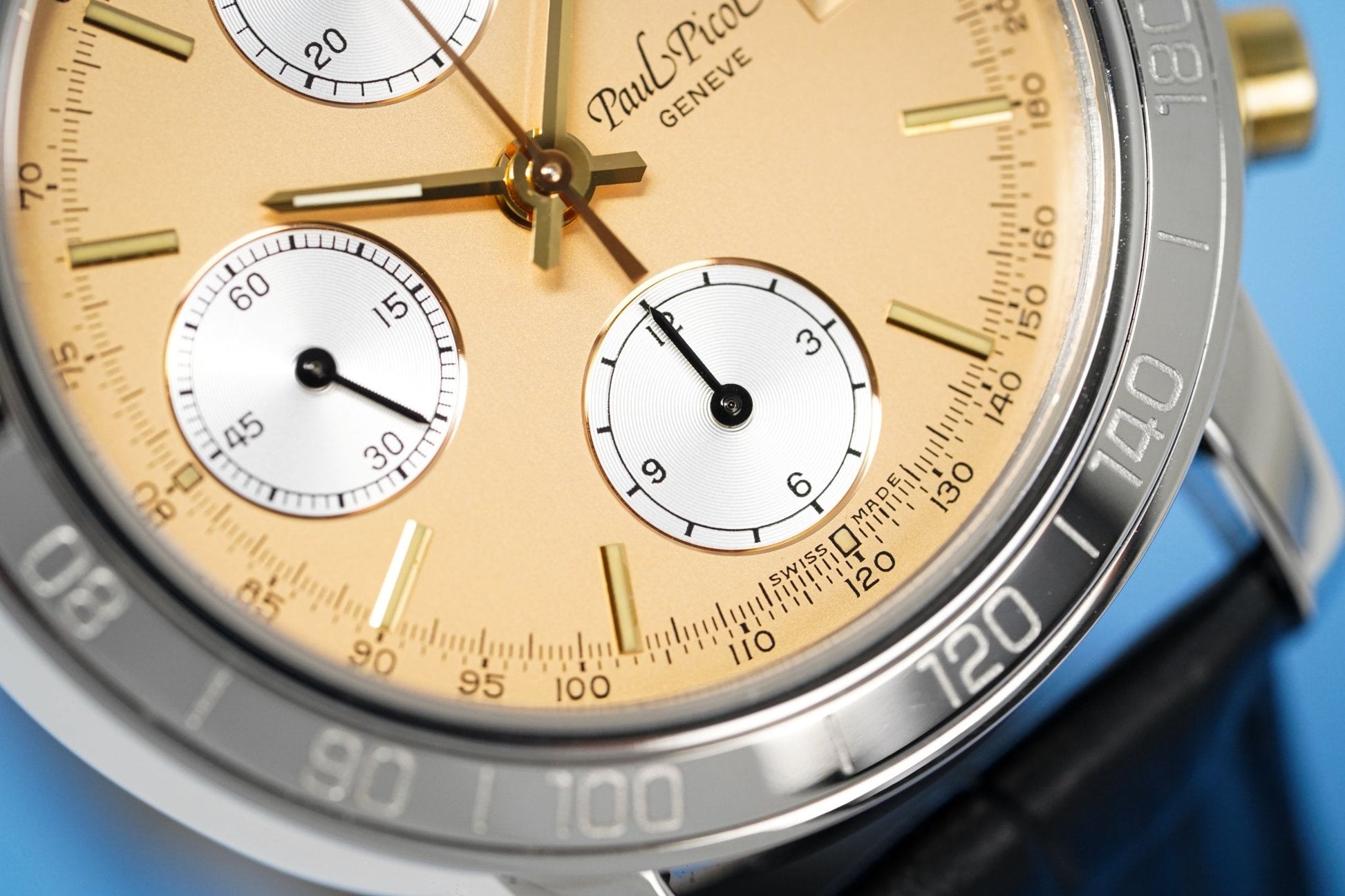 38mm x 14mm Polished 316L Stainless Steel Case. Stainless Steel Tachymeter Bezel. 18kt Yellow Gold Crown and Pushers. Screw Down Caseback