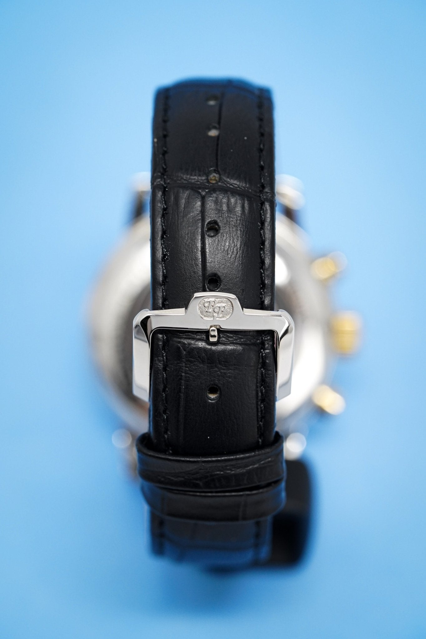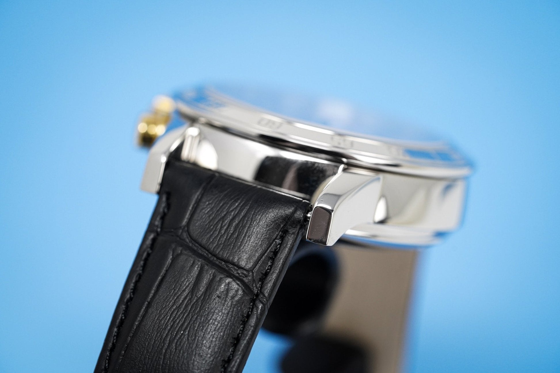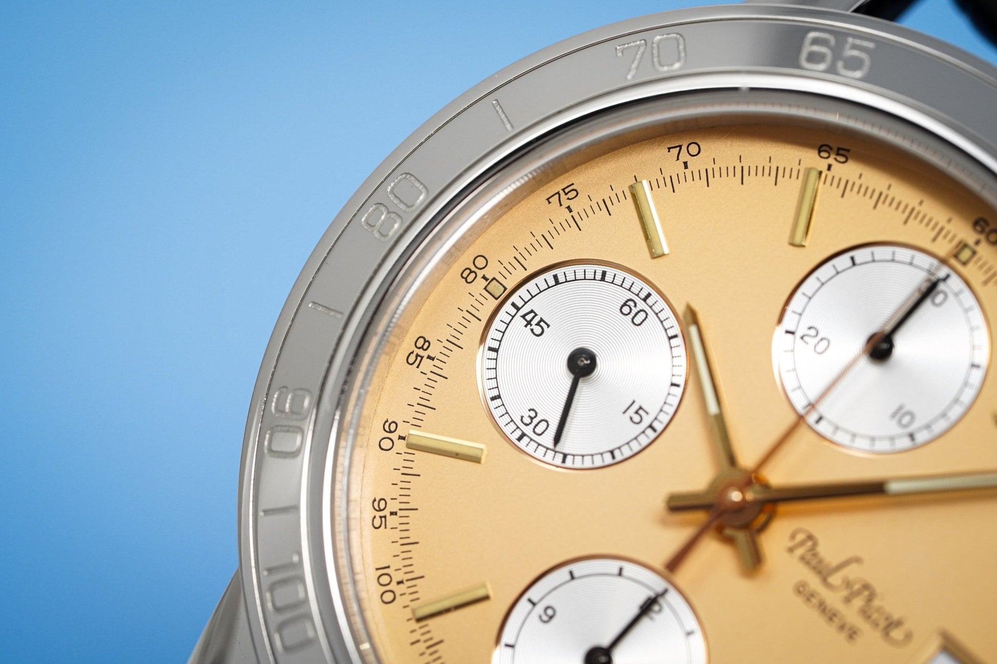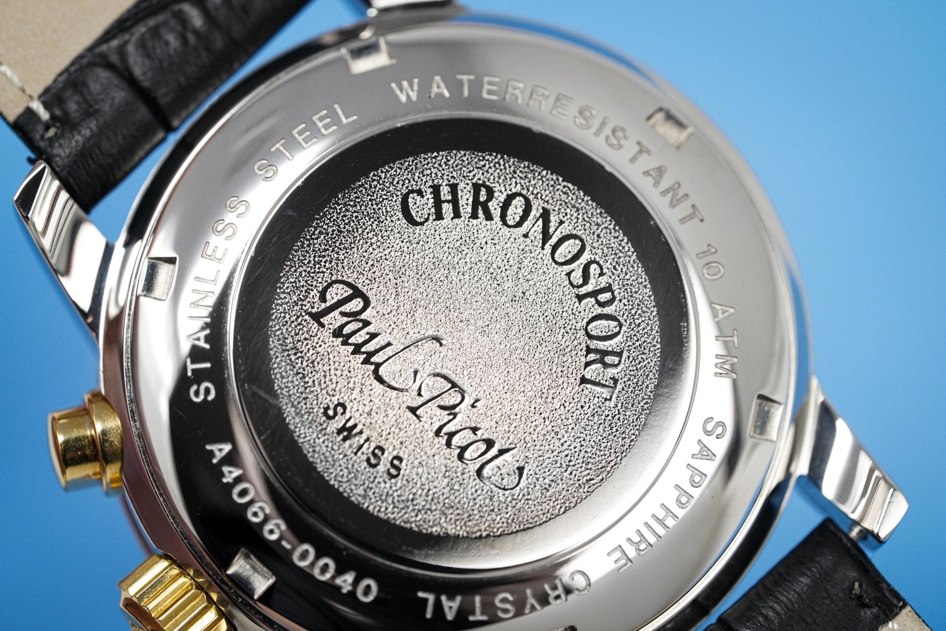 38mm x 14mm Polished 316L Stainless Steel Case. Stainless Steel Tachymeter Bezel. 18kt Yellow Gold Crown and Pushers. Screw Down Caseback