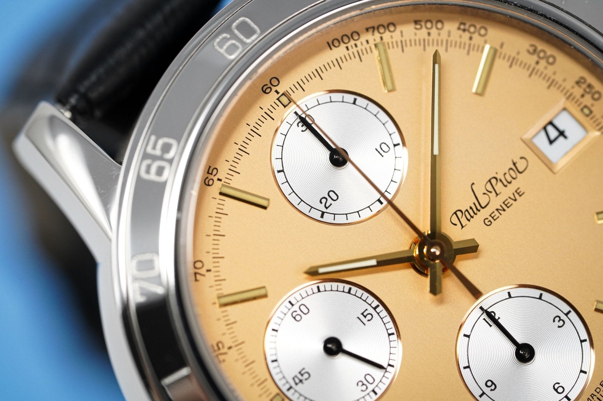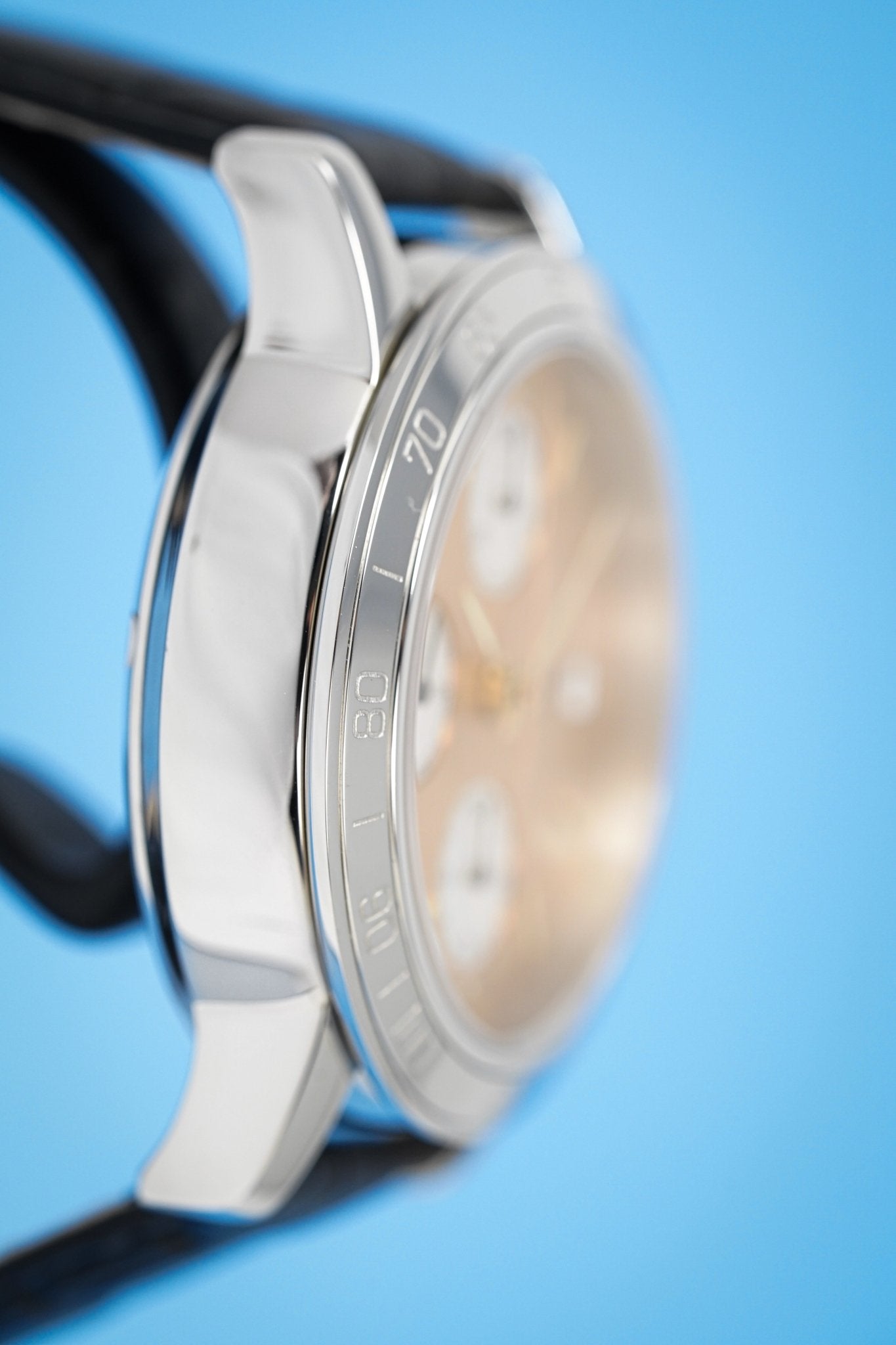 Salmon Dial. Applied Yellow Gold Luminous Stick Indexes. Polished Yellow Gold Hands. 30 Minute Counter at 12. Small Seconds at 9. 12 Hour Counter at 6. Date Window at 3.