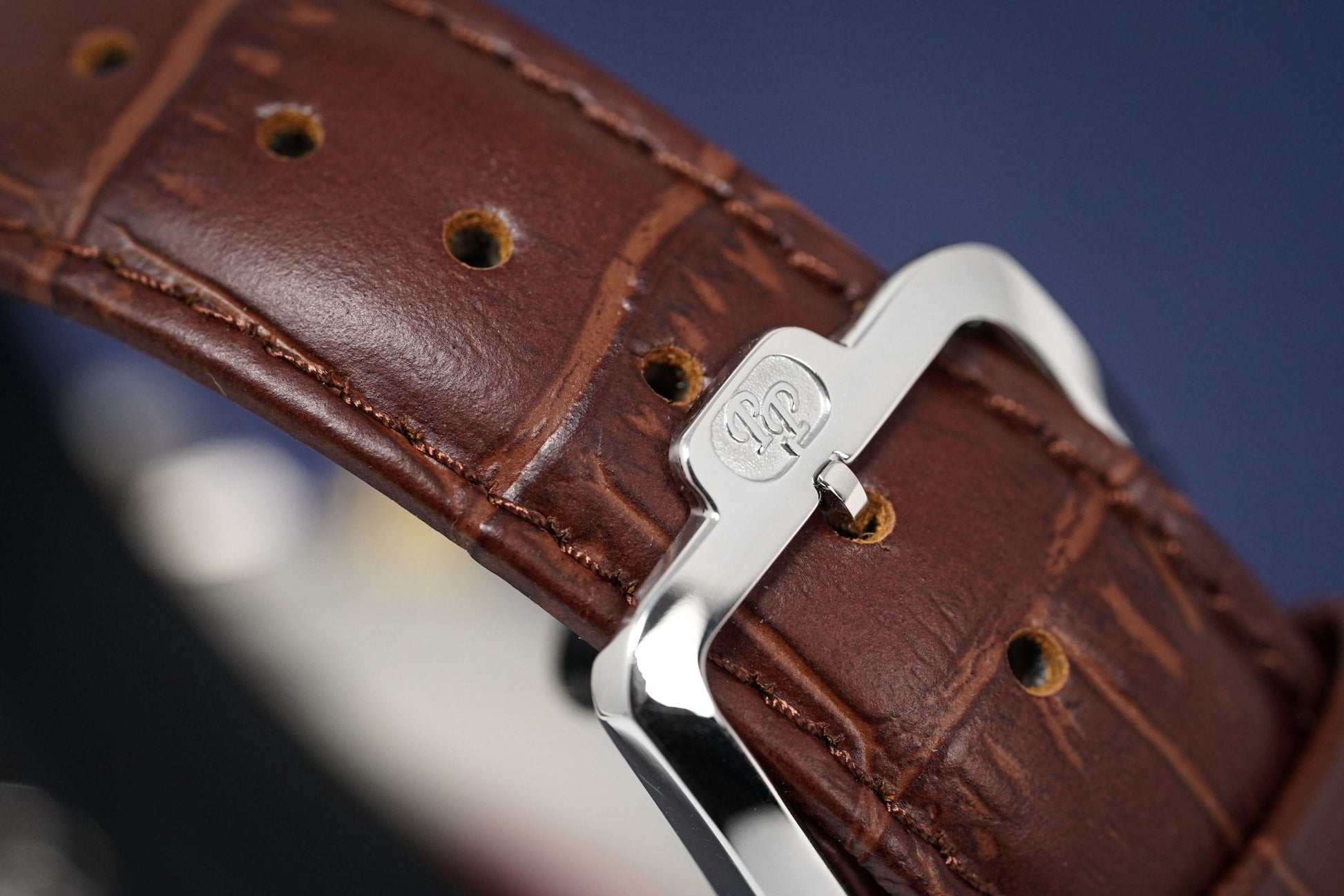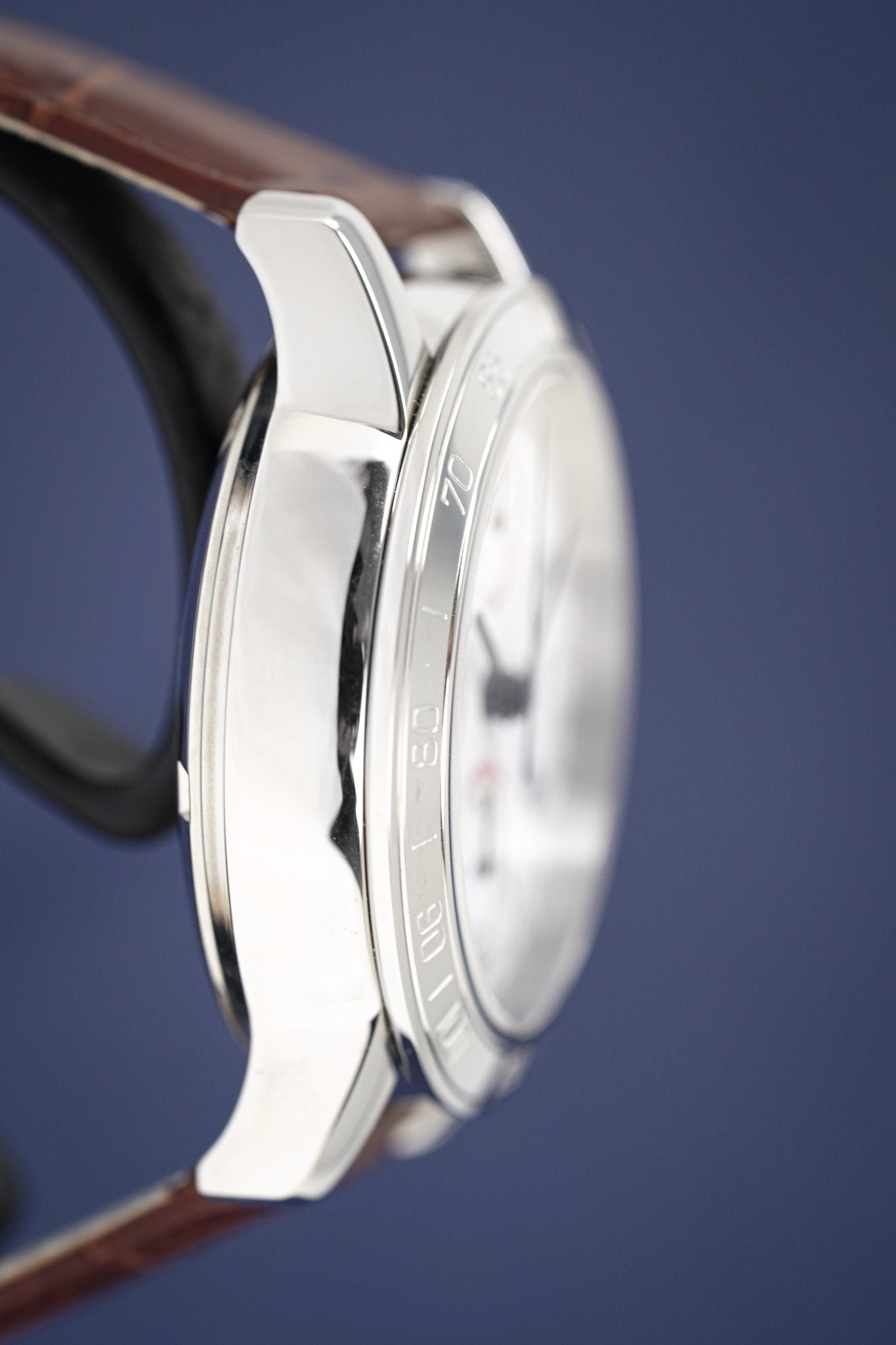 White Dial. Black Printed Roman Numeral Indexes. Black PVD Steel Hands. 30 Minute Counter at 12. Small Seconds at 9. 12 Hour Counter at 6. Date Window at 3.