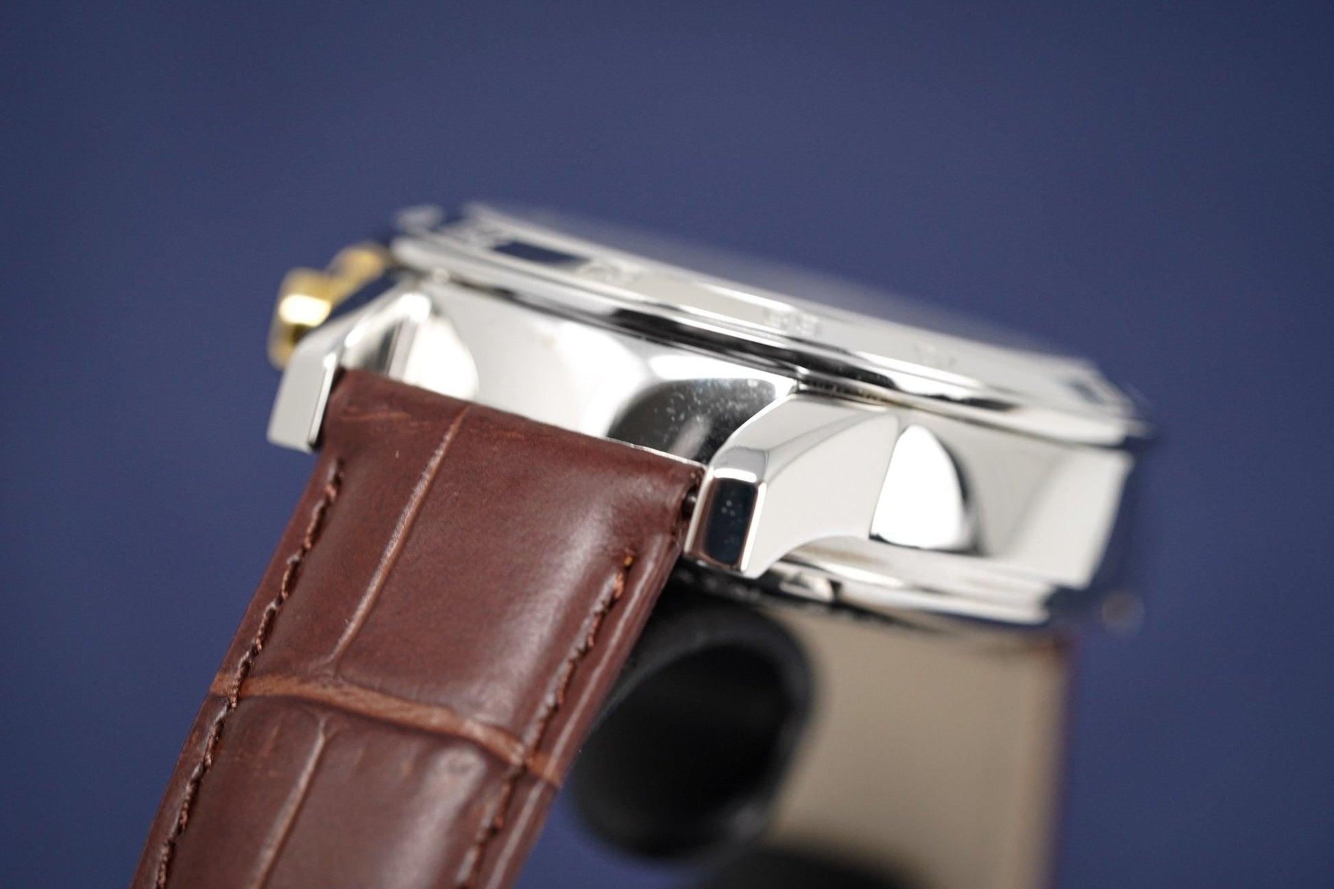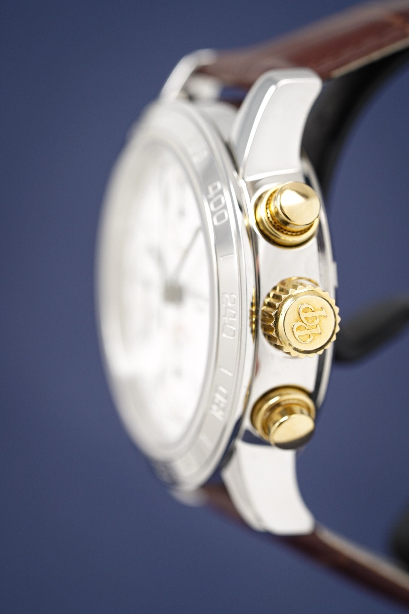 38mm x 14mm Polished 316L Stainless Steel Case. Stainless Steel Tachymeter Bezel. 18kt Yellow Gold Crown and Pushers. Screw Down Caseback