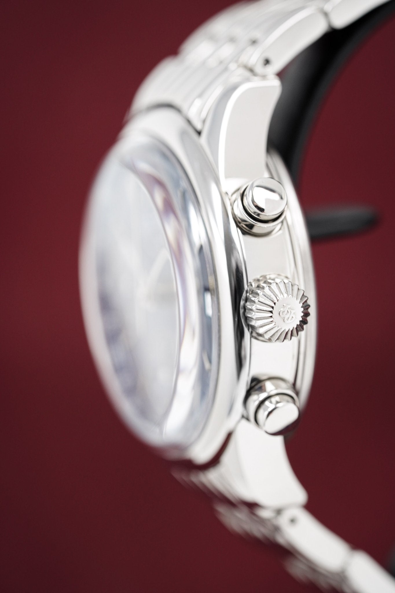 Blue Dial. Applied Stainless Steel Stick Indexes and Hands. Tachymeter Track. 30 Minute Counter at 12. Small Seconds at 9. 12 Hour Counter at 6. Date Window at 3.