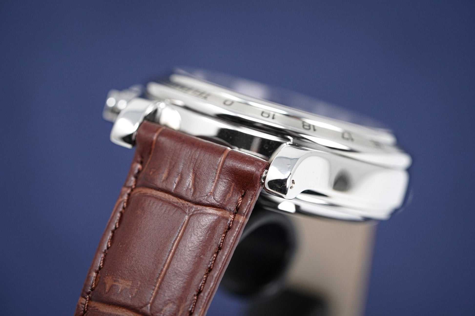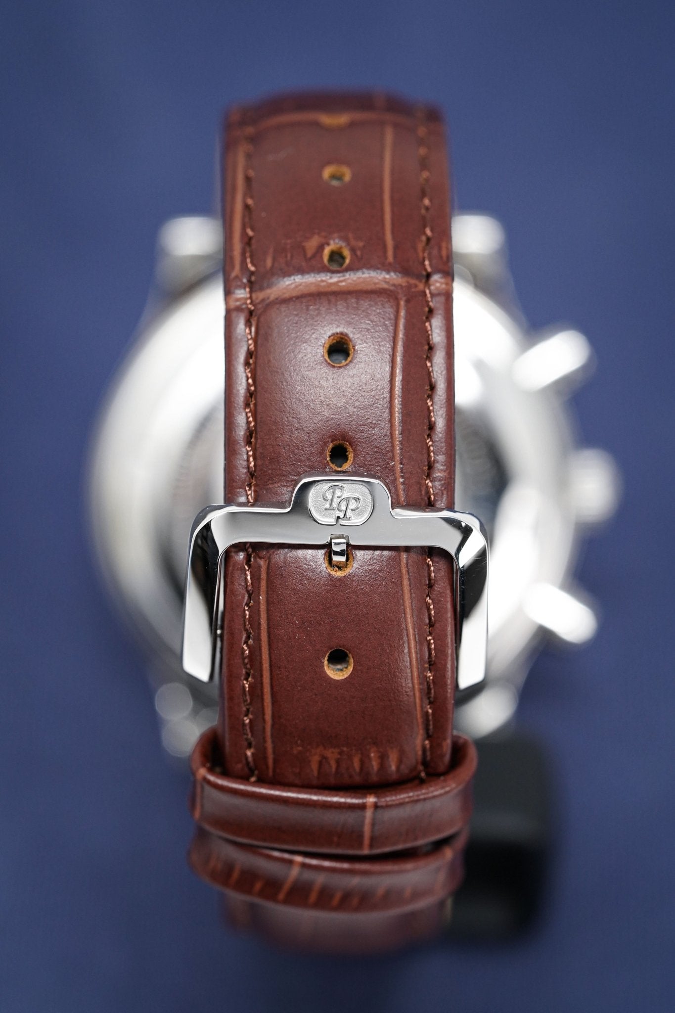 White Dial. Black Printed Roman Numeral Indexes. Black PVD Steel Hands. 30 Minute Counter at 12. Small Seconds at 9. 12 Hour Counter at 6. Date Window at 3.P