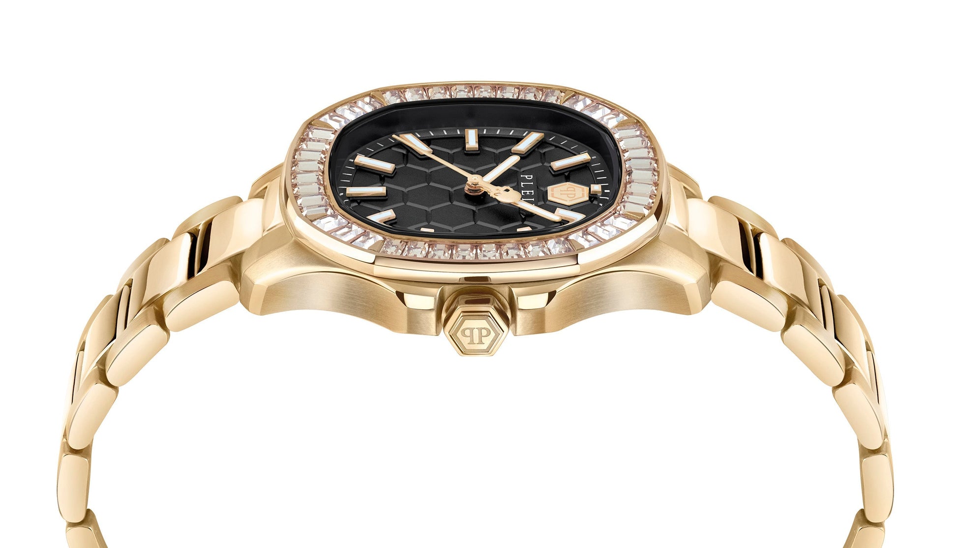 A strong and distinctive Plein DNA is conveyed by the iconic hexagonal pattern that is engraved all over the watch: on the background of the dial and on the silicon strap.