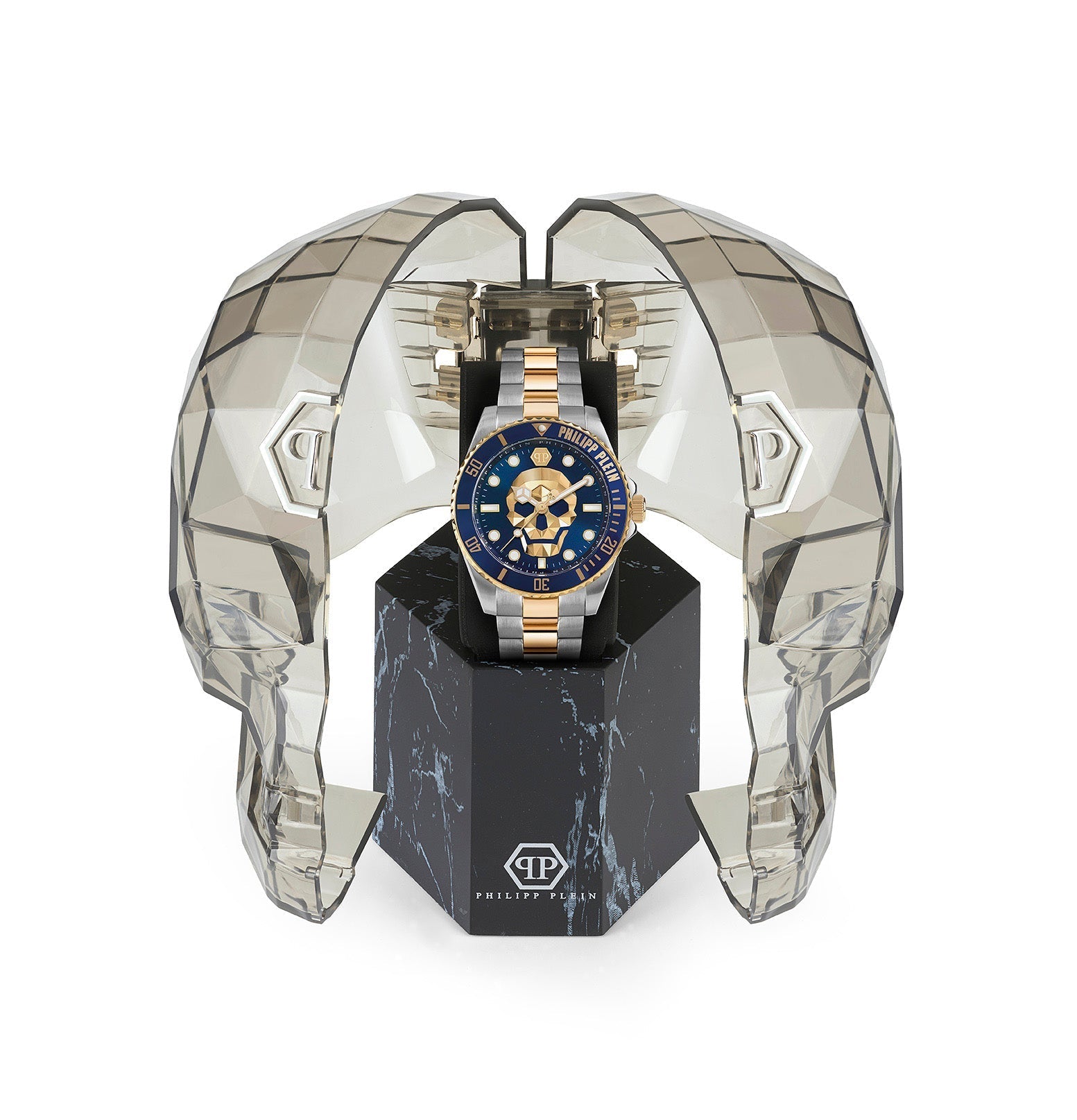 The iconography is reinforced by the embossing of the Philipp Plein lettering on the strap and the recall of it on the colored bezel with tachymeter.