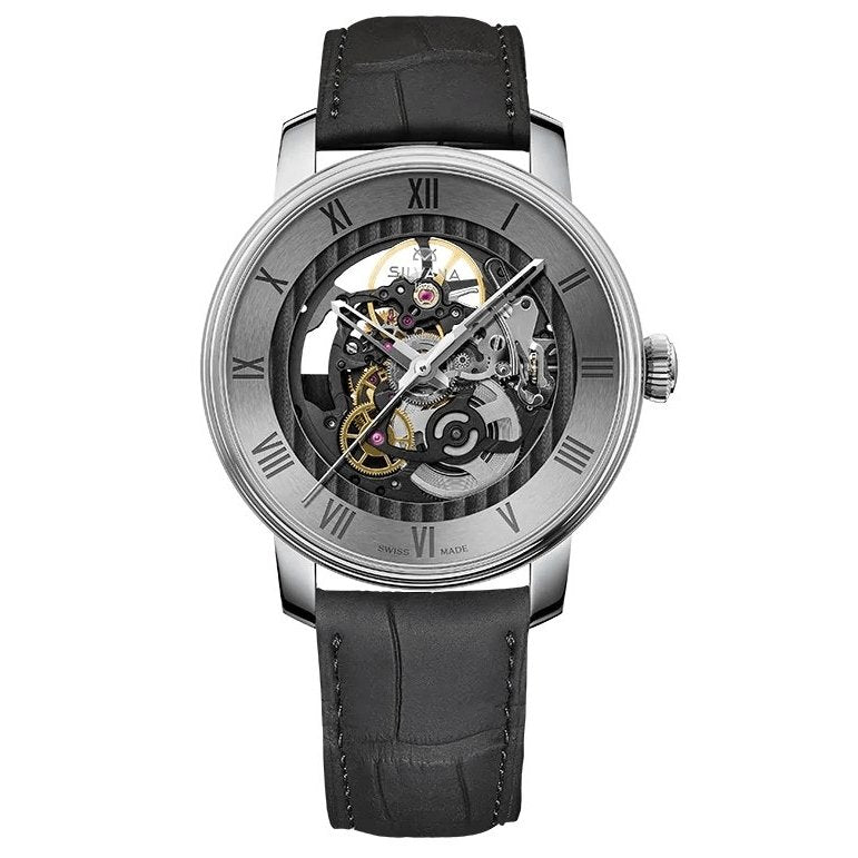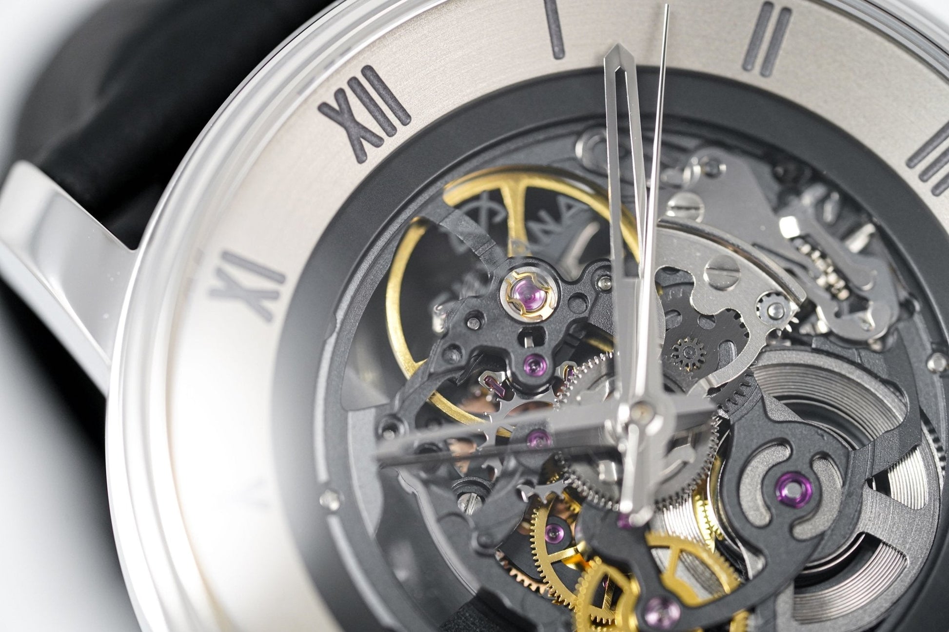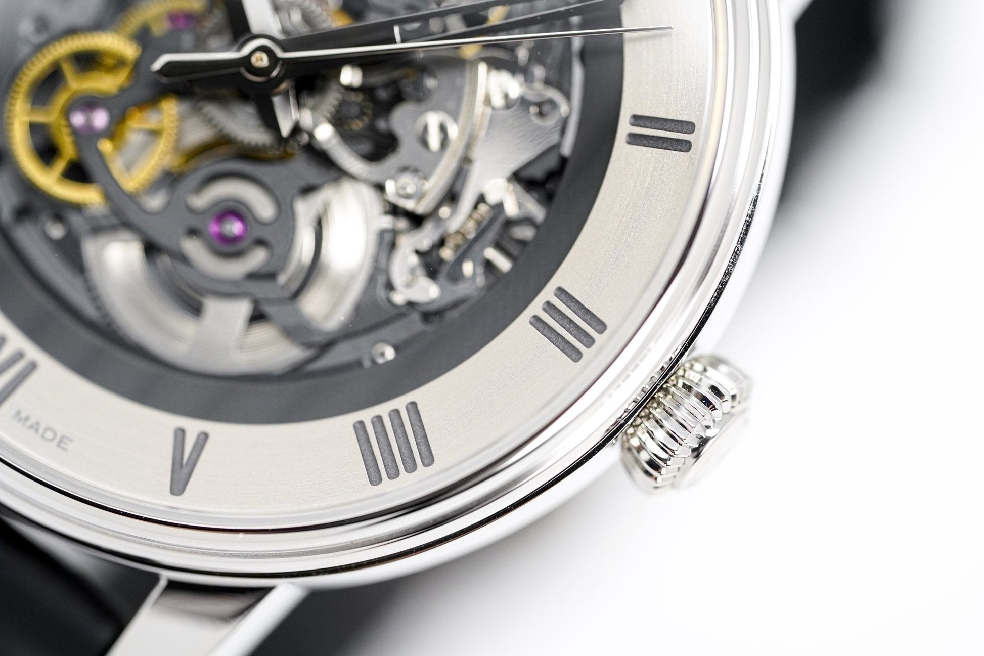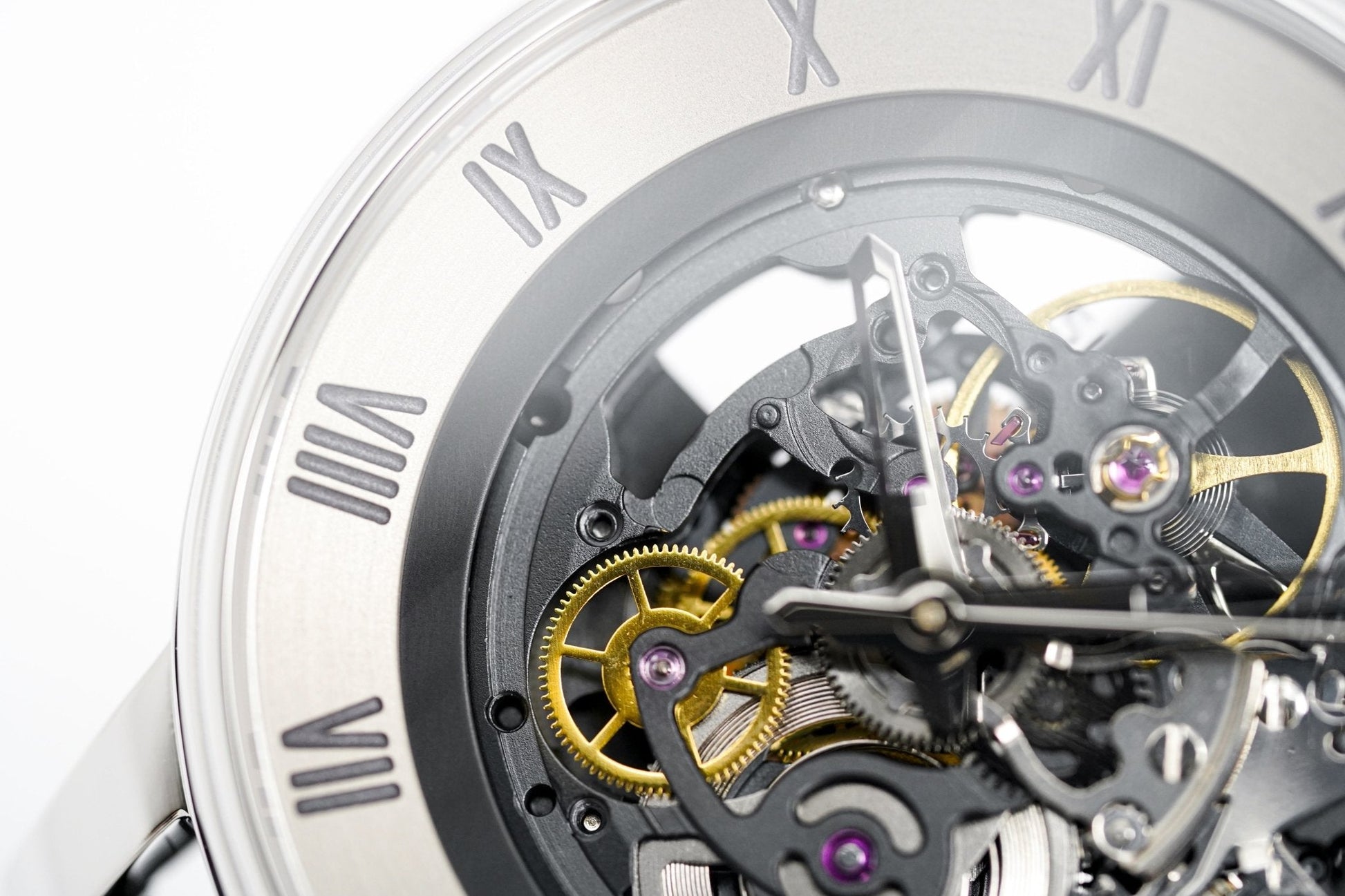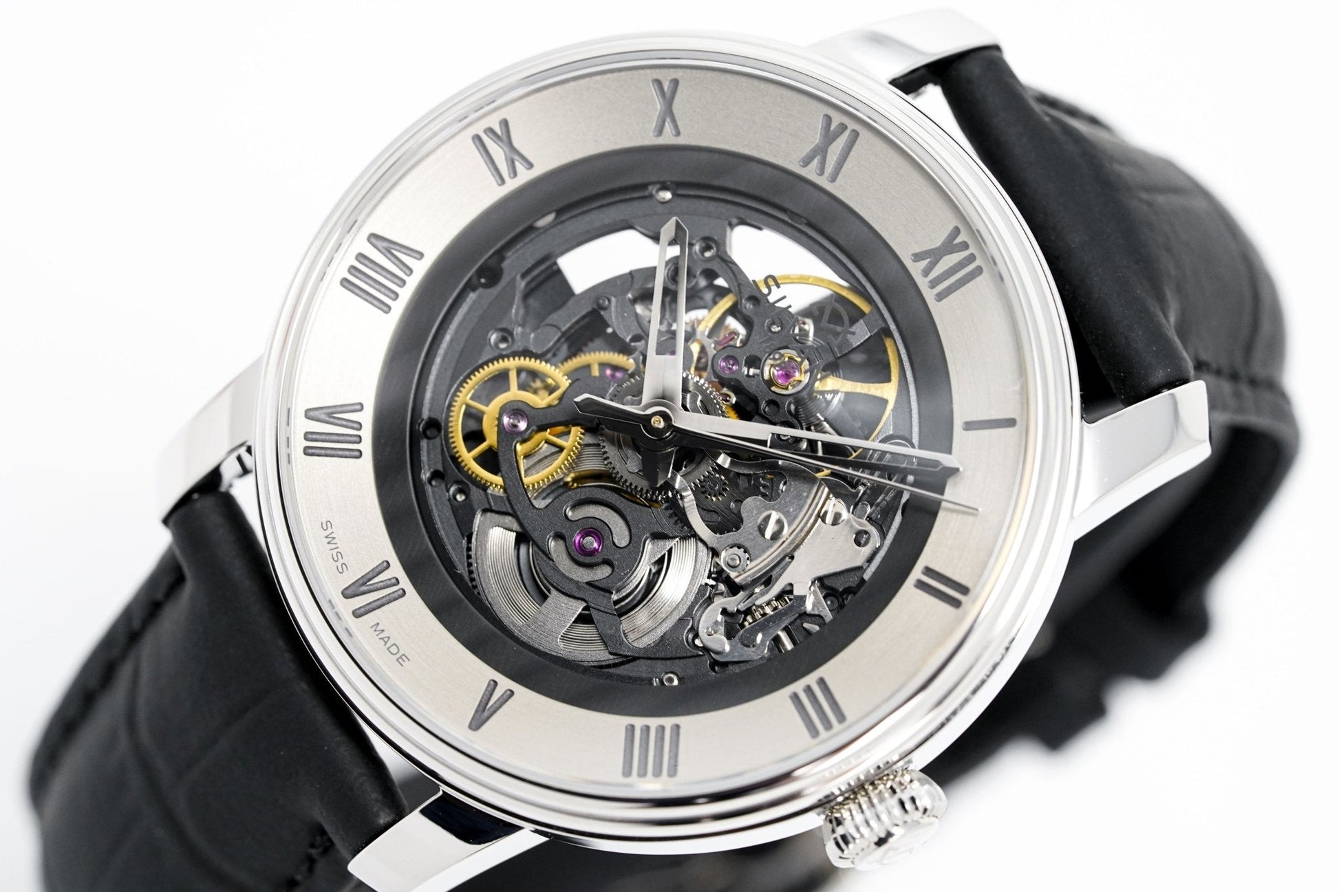 Skeleton Grey Dial. 316L Stainless Steel Skeleton Hands. Roman Numeral Indexes.