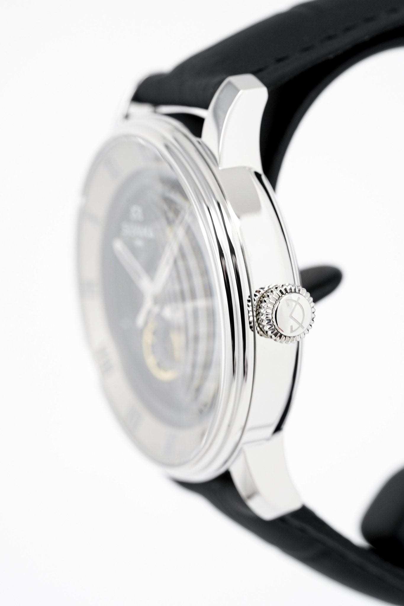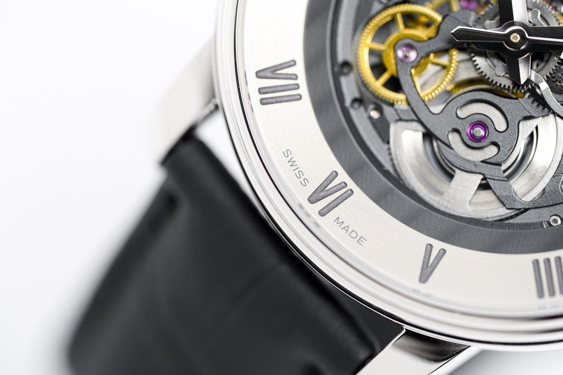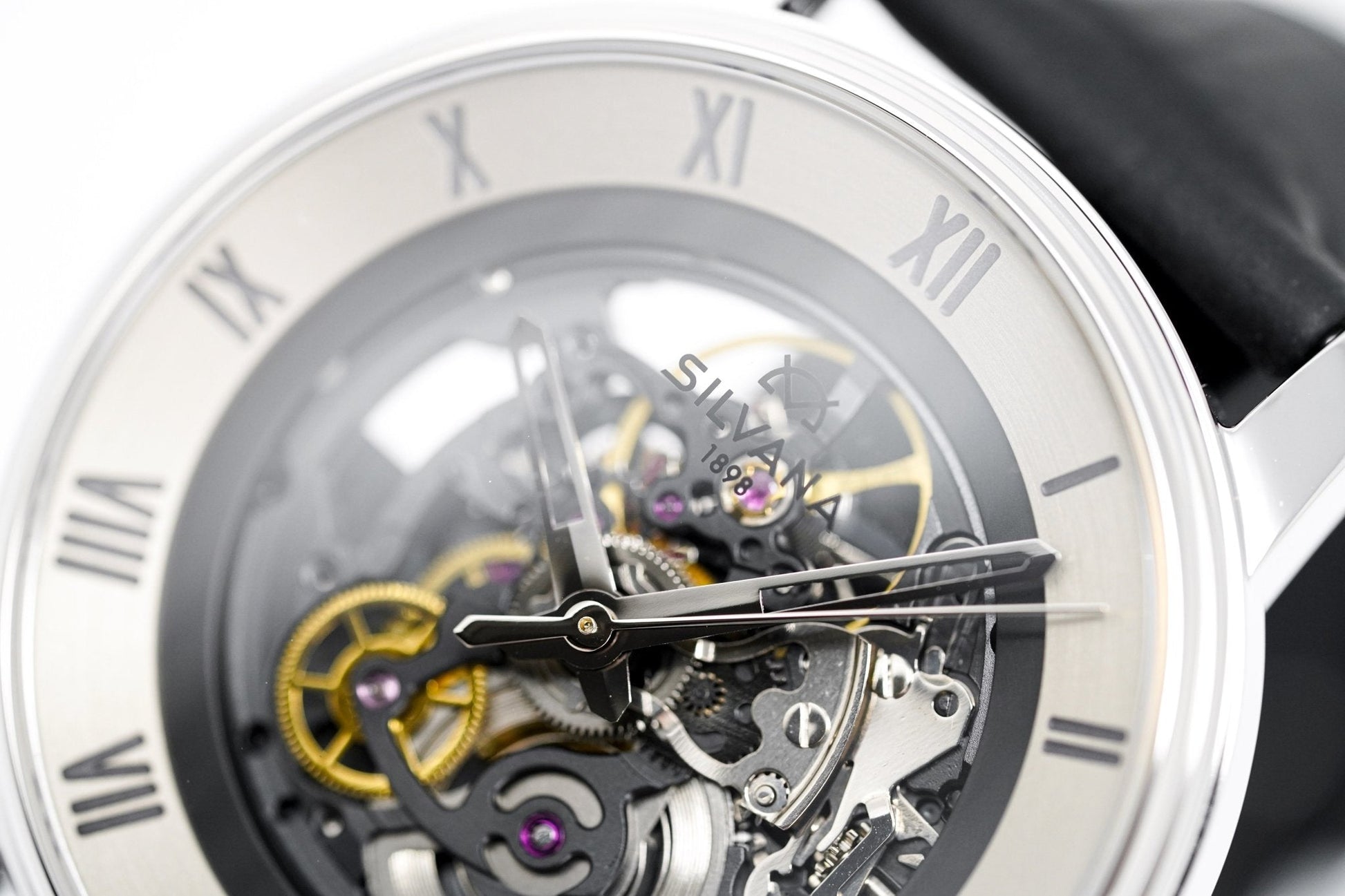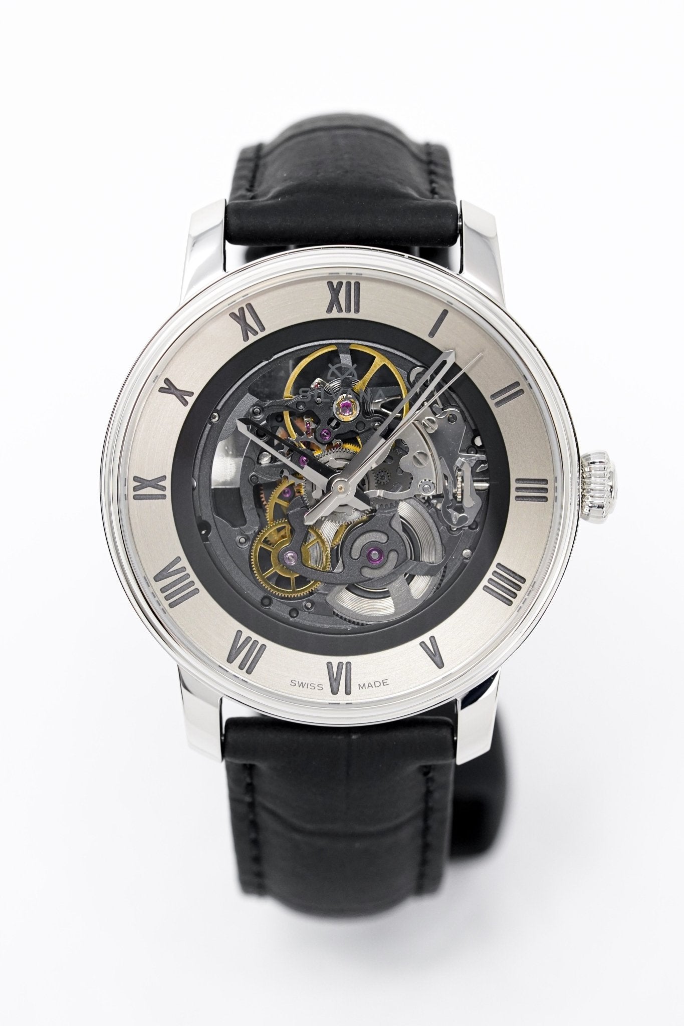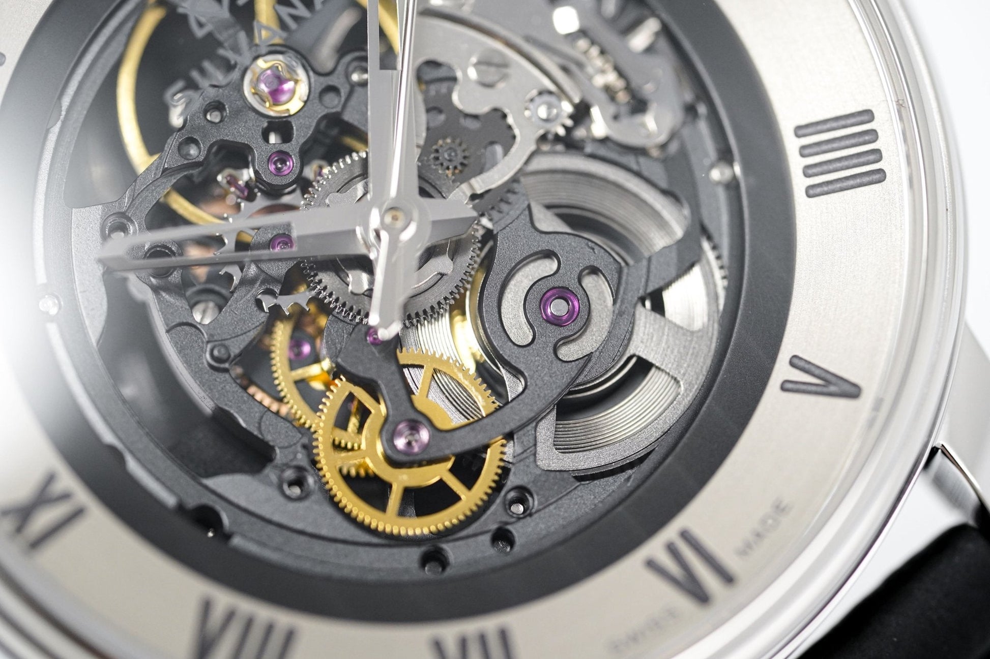 Skeleton Grey Dial. 316L Stainless Steel Skeleton Hands. Roman Numeral Indexes.