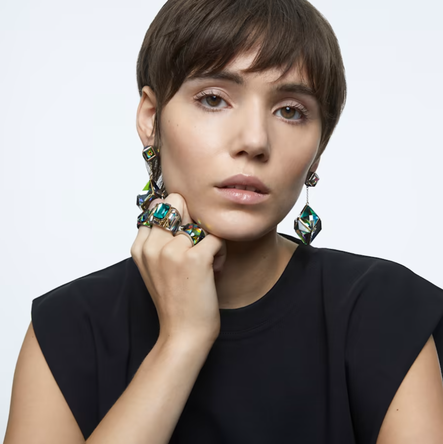 Inspired by the classic signet ring, this design will elevate every wardrobe. Full crystal cuts are layered to create a geometric pattern, and cradled within a gold-tone plated setting. Wear it solo with sharp monochromatic pieces to show off its vibrant emerald green hue, such as a crisp white shirt or a boxy blazer for evening.