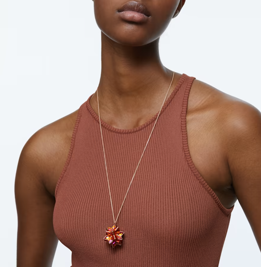 Suspended exquisitely from a rose-gold tone plated round link adjustable chain, this geometric astral pink crystal pendant celebrates the magic of engineering and mathematics in a showstopping starburst form crafted from triangle step cut crystals.