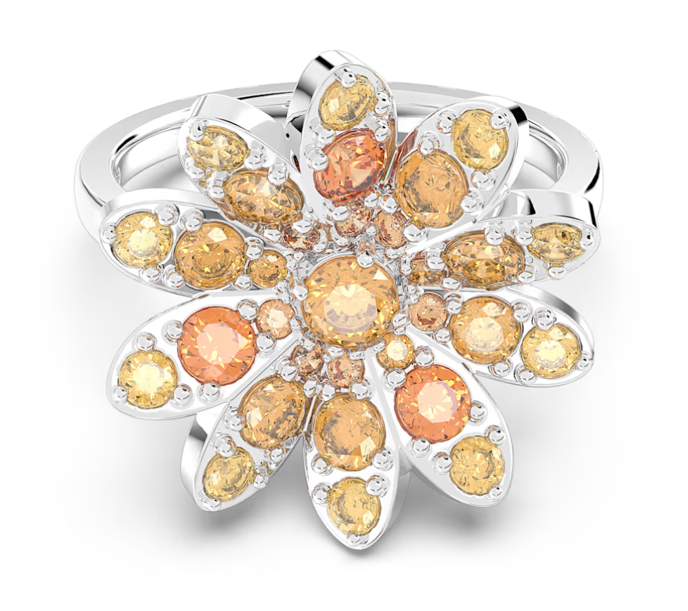 Meet your new everyday favourite. This striking ring features an elegant floral motif that shimmers with orange and amber stones. It is finished with mixed metal plating for contemporary appeal. A style to make you smile.