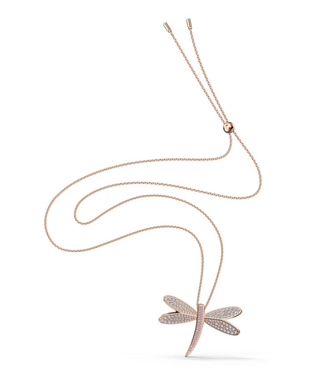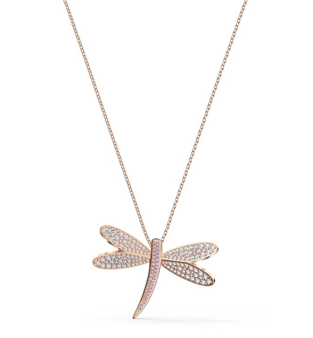 This Swarovski necklace with a rose-gold tone plated chain features a stylized dragonfly with many delightful details. Beautiful, brilliant white and pink stones adorn the insect's wings and body to create an especially glamorous look.