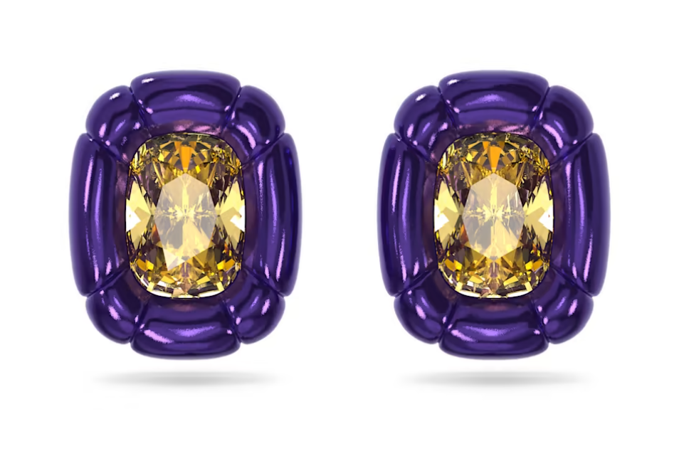 These statement clip earrings will add a playful touch to any look. Featuring light topaz cushion cut crystals encased within a metallic purple Pop-Art inspired setting, this pair is the jewelry equivalent of wearable candy.