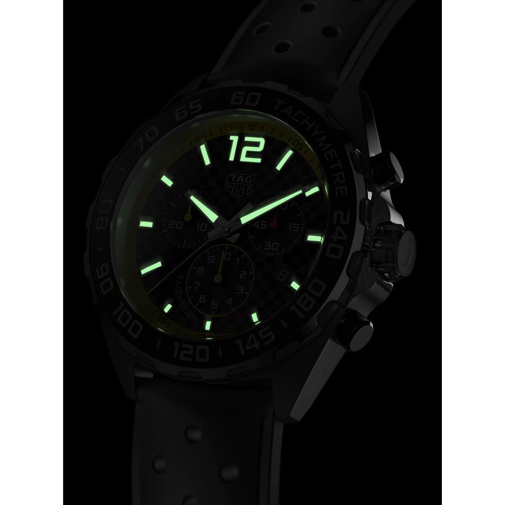 Black Carbon Fibre Textured Dial. Applied Luminous Stainless Steel Stick Indexes. Luminous Stainless Steel Hands. Textured Subdials. Date at 4.