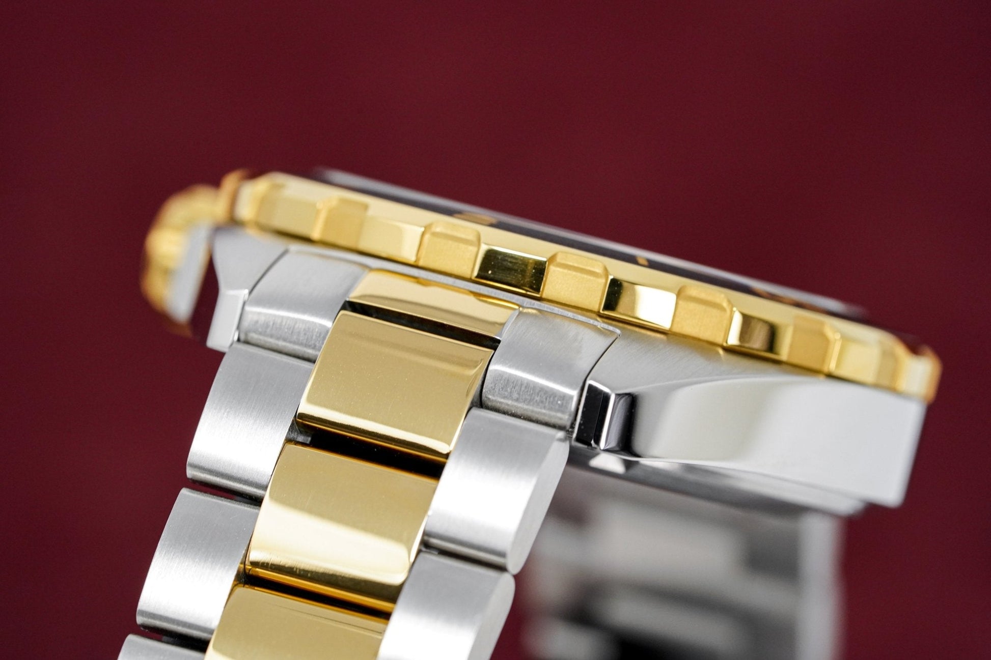 41mm x 11.65mm Brushed & Polished Stainless Steel Case. Sapphire Crystal Glass. 2N Gold Plated Unidirectional Bezel. Screw Down Case Back.