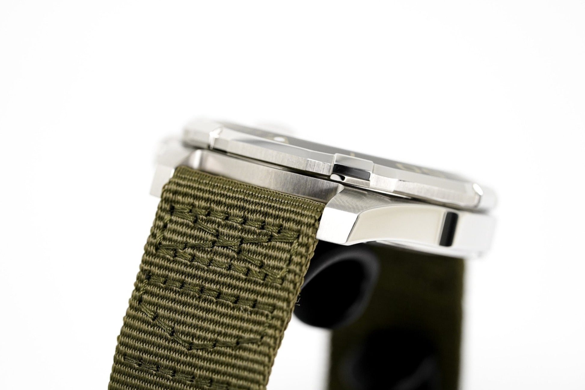 20.5mm x 18cm Khaki Nylon Strap with Stainless Steel Pin Buckle.