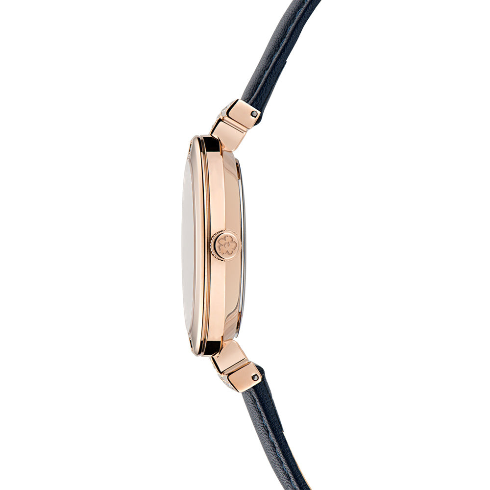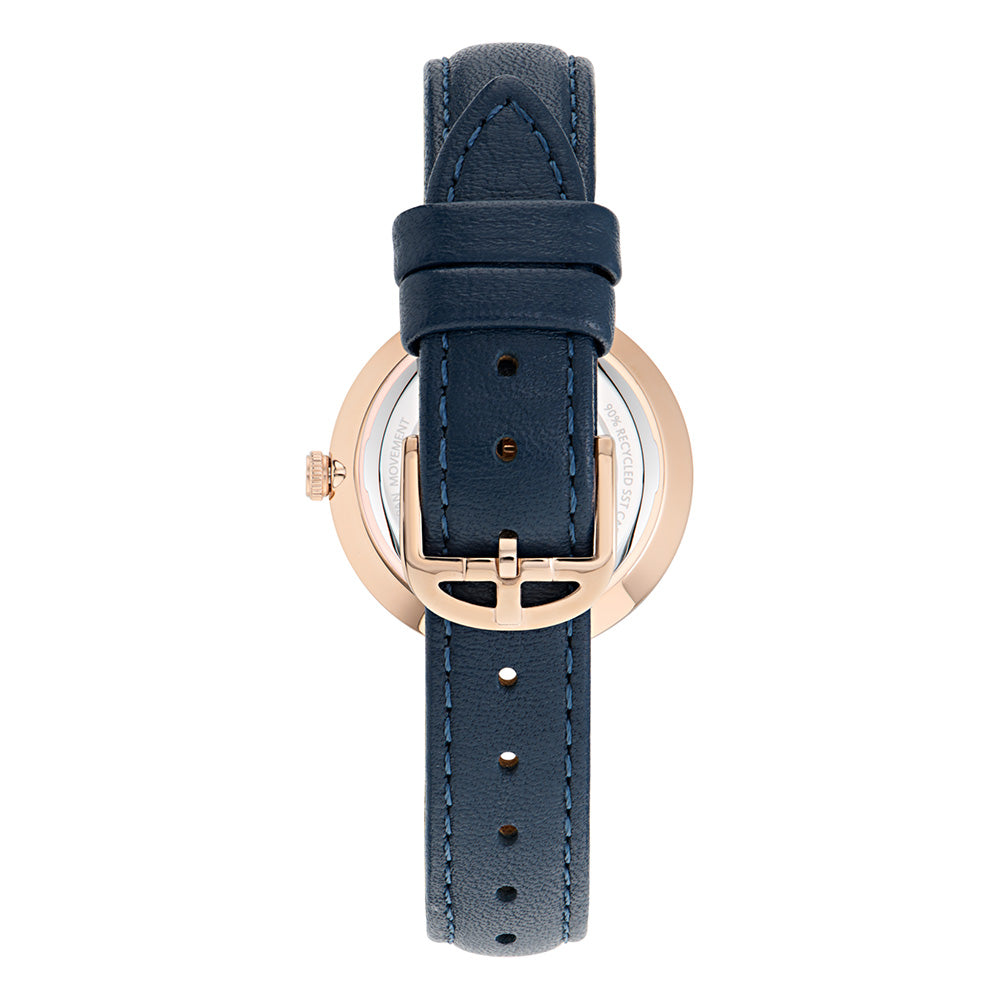 Add a pop of color to your ensemble with this vibrant watch featuring a rose gold recycled stainless steel case and a blue dial. The blue vegan leather strap completes the look, making it a stylish accessory for any occasion.