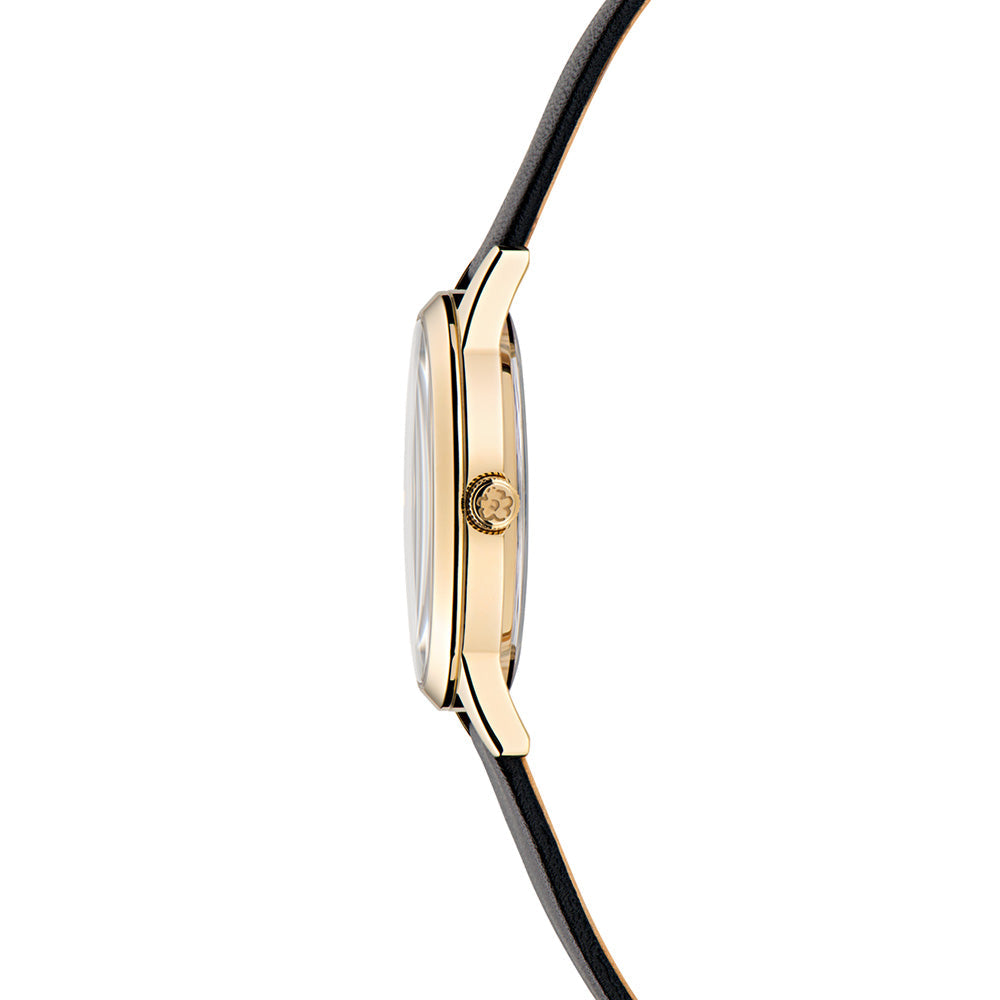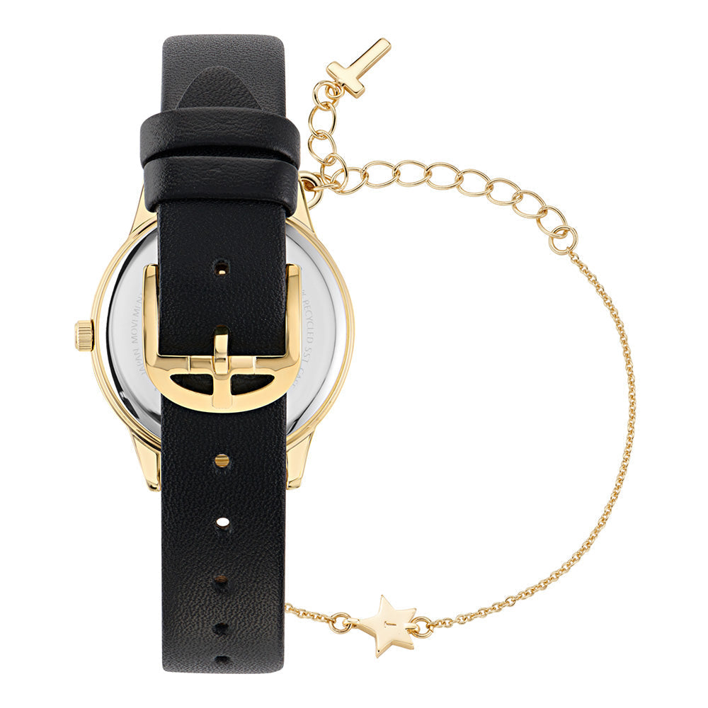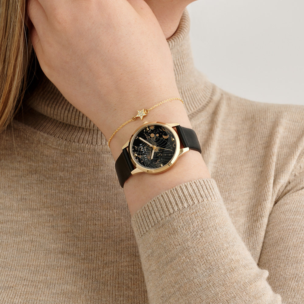 Make a celestial statement with this unique watch featuring a yellow gold stainless steel case and a black dial adorned with a constellation pattern. The black leather strap with star detailing adds a touch of cosmic charm, making it a standout accessory.