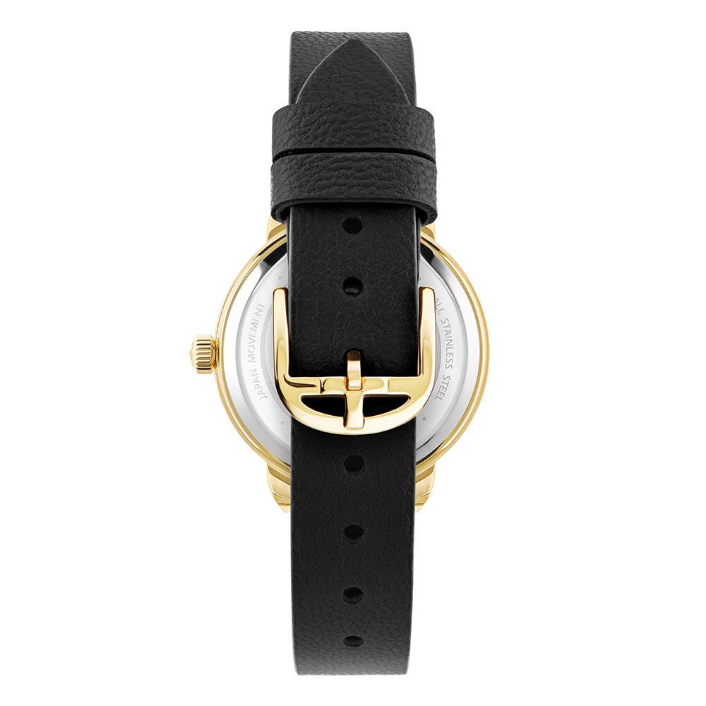 Elevate your look with this eco-friendly watch featuring a recycled stainless steel case in a luxurious yellow gold tone. The black dial and vegan leather strap add a touch of sophistication, making it the perfect accessory for any occasion.