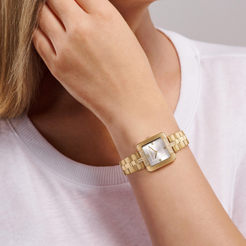 Make a sustainable statement with this eco-friendly watch featuring a recycled stainless steel case in a radiant yellow gold tone. The silver dial and matching yellow gold bracelet add a touch of elegance, making it the perfect accessory for any occasion.