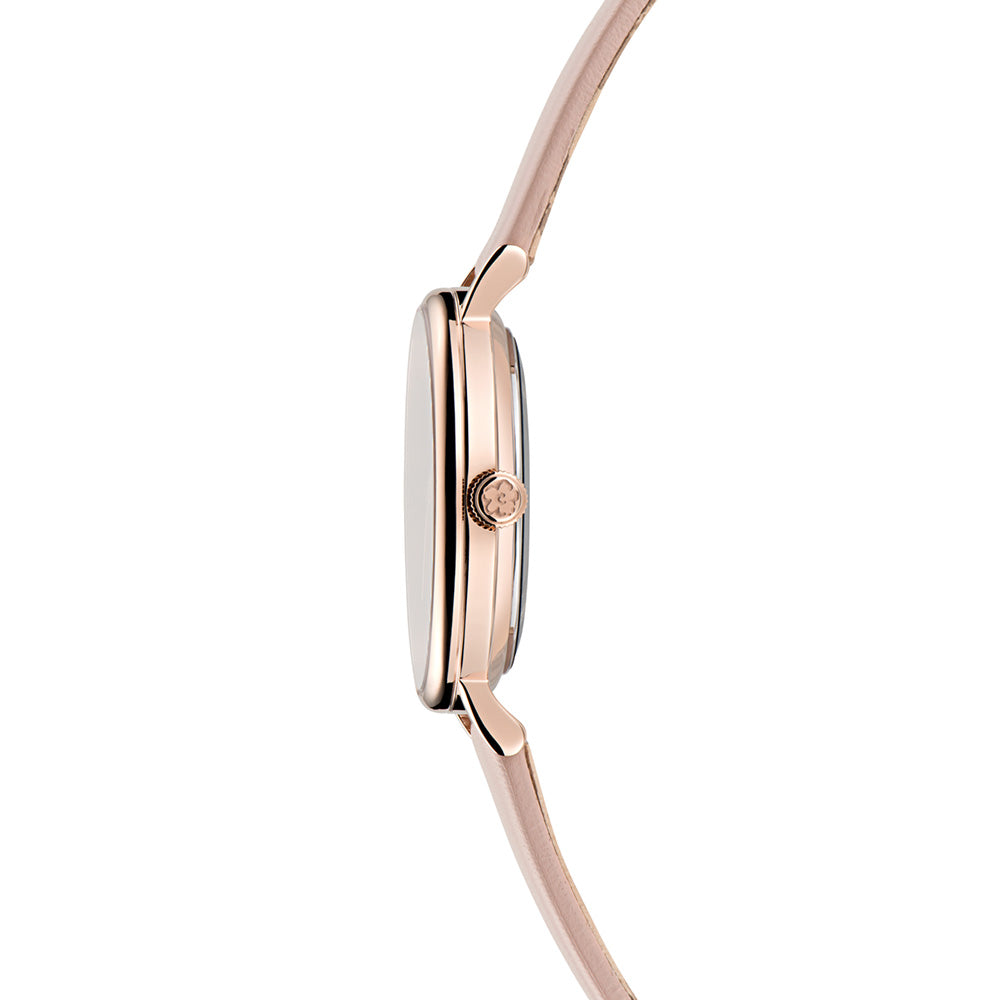 Add a pop of color to your ensemble with this vibrant watch featuring a rose gold recycled stainless steel case and a printed dial. The pink eco genuine leather strap adds a touch of luxury, making it the perfect accessory for fashion-forward individuals.