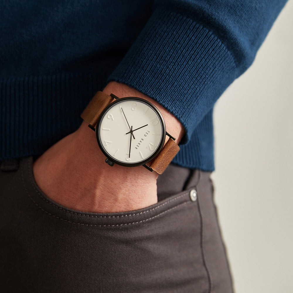Elevate your style with this timeless watch featuring a black case and a cream dial paired with a tan leather strap. The classic color combination adds a touch of refinement to any ensemble.