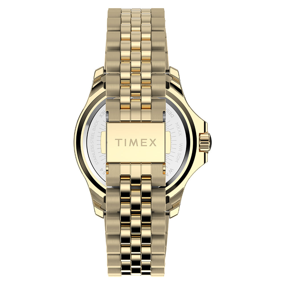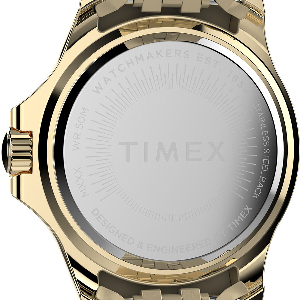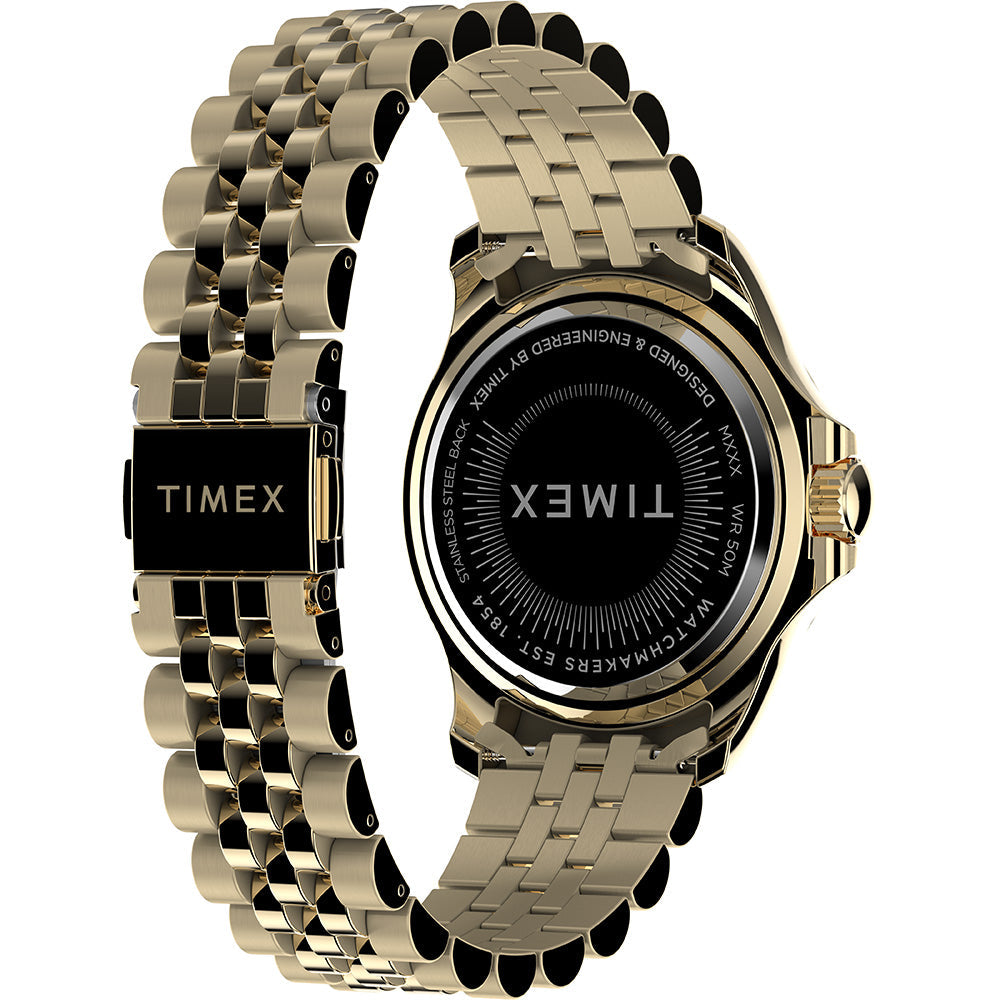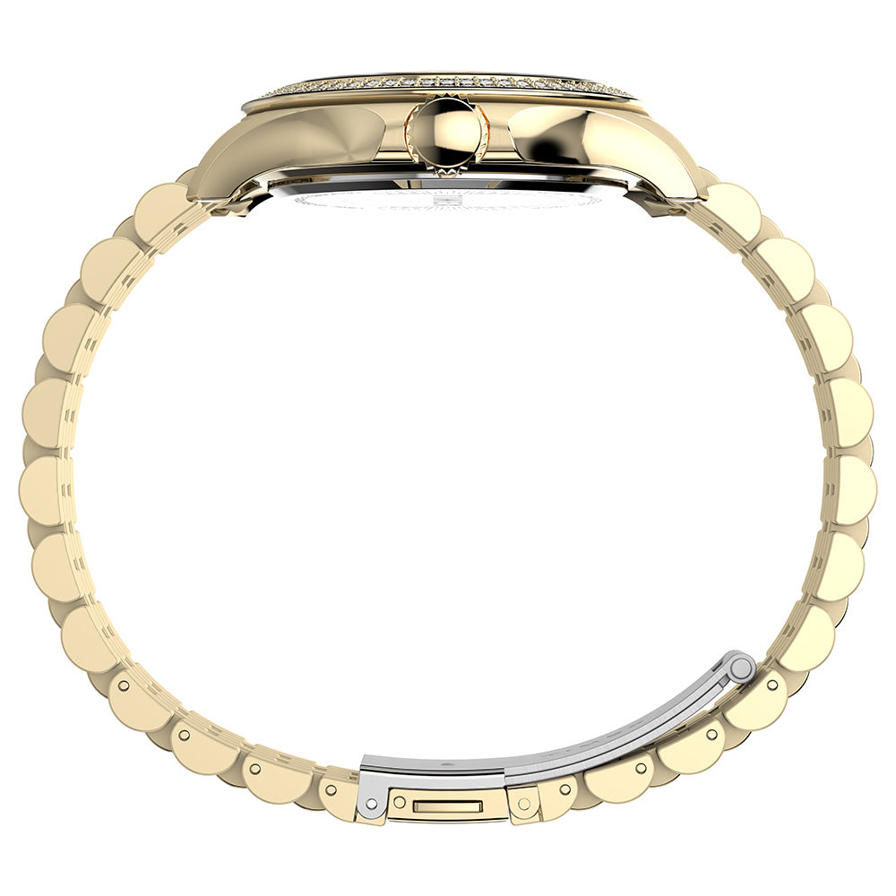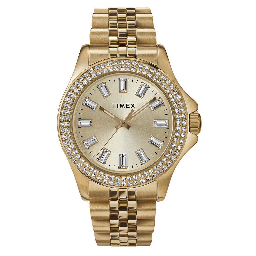 Everything is better with a little sparkle and our Kaia certainly does the trick. A 38mm case and sleek stainless-steel bracelet appear in polished tones of gold on this chic timepiece, with silver crystal indices illuminating the dial and two rows of crystals lining the bezel. Our Kaia’s eye-catching luster and slightly large silhouette carry a bold confidence that’ll have you walking a little taller and holding your head a little higher.