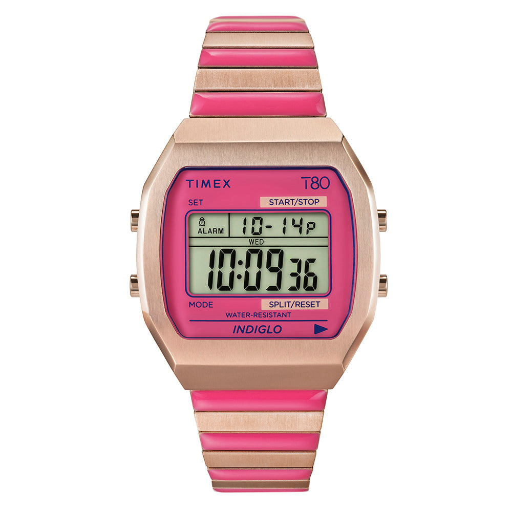 Dive into a world of color and luxe. Our Timex T80 transports you to sun-soaked days on faraway shores with a lens and stainless-steel Perfect Fit™ expansion band in captivating colorways that brighten up all your vacation looks. Other details include all you’d expect from our T80 – a chronograph function, daily alarm, INDIGLO® backlight, and date display. So, claim a sunny spot and surrender to the peaceful rhythm of the tides...you’re on island time now.