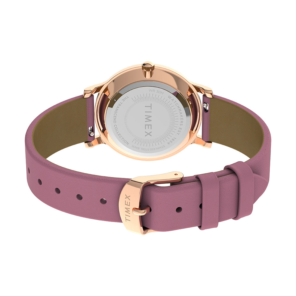 A minimalist wristwatch for lovers of contemporary style, Transcend is a staple collection known for its thin case profile and classically feminine aesthetic. A textured rose gold-tone dial featuring a unique handset is the pièce de résistance of this glamorous update, while a 34mm case gleams with striking hour markers. A natural leather strap with quick-release spring bars in pink not only offers a versatile wearing experience, but also a touch of sophistication to an otherwise understated design.
