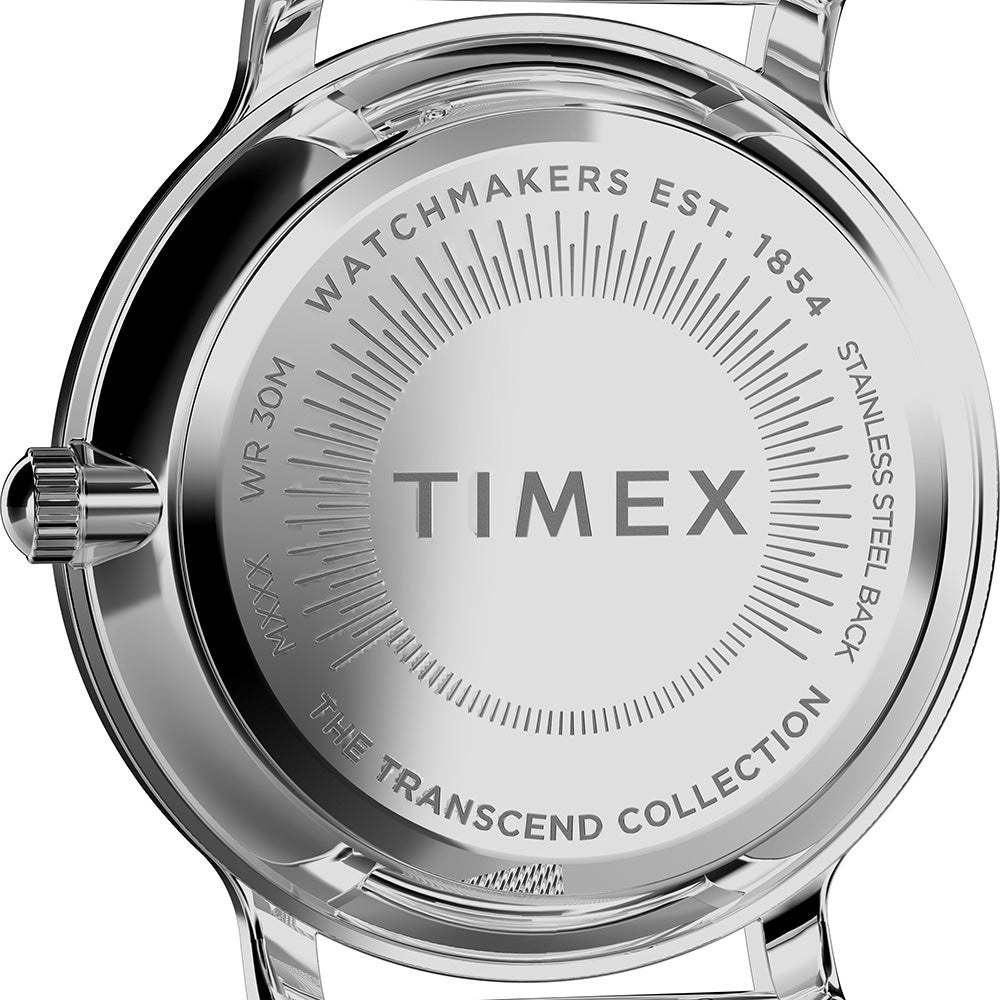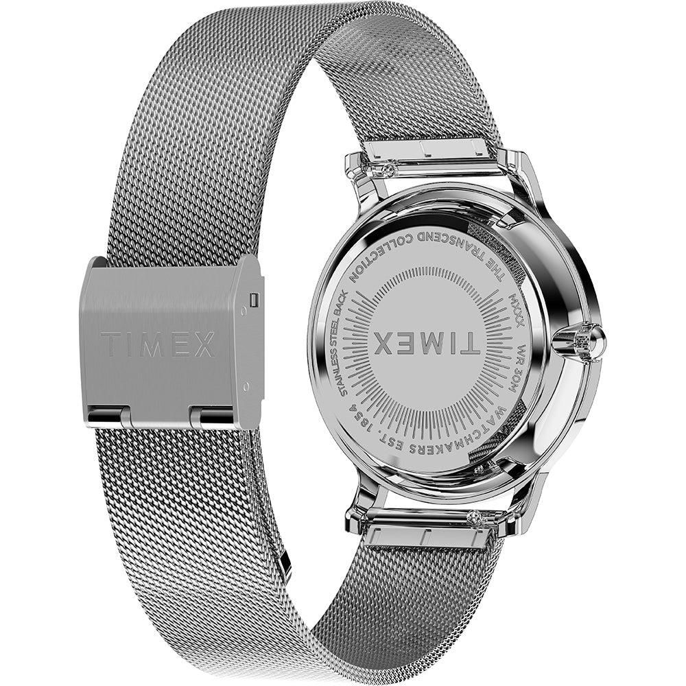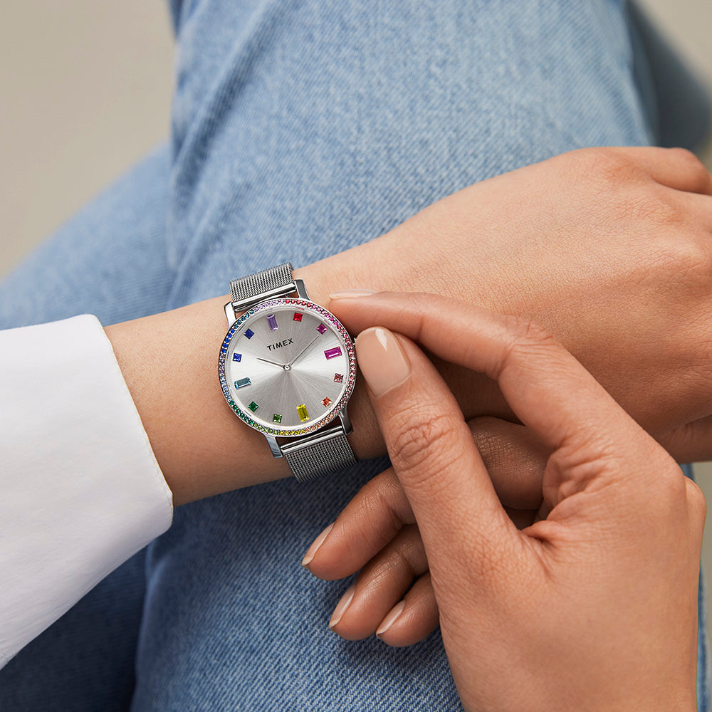 With its elegant sunray dial, dimensional crystal markers, and crystal encrusted bezel, our slim 34mm Transcend™ offers a touch of sophistication to your look. The silver-tone stainless-steel mesh band features quick release spring bars and a sliding buckle for easy adjustment, giving you a well-rounded watch with understated style and class.