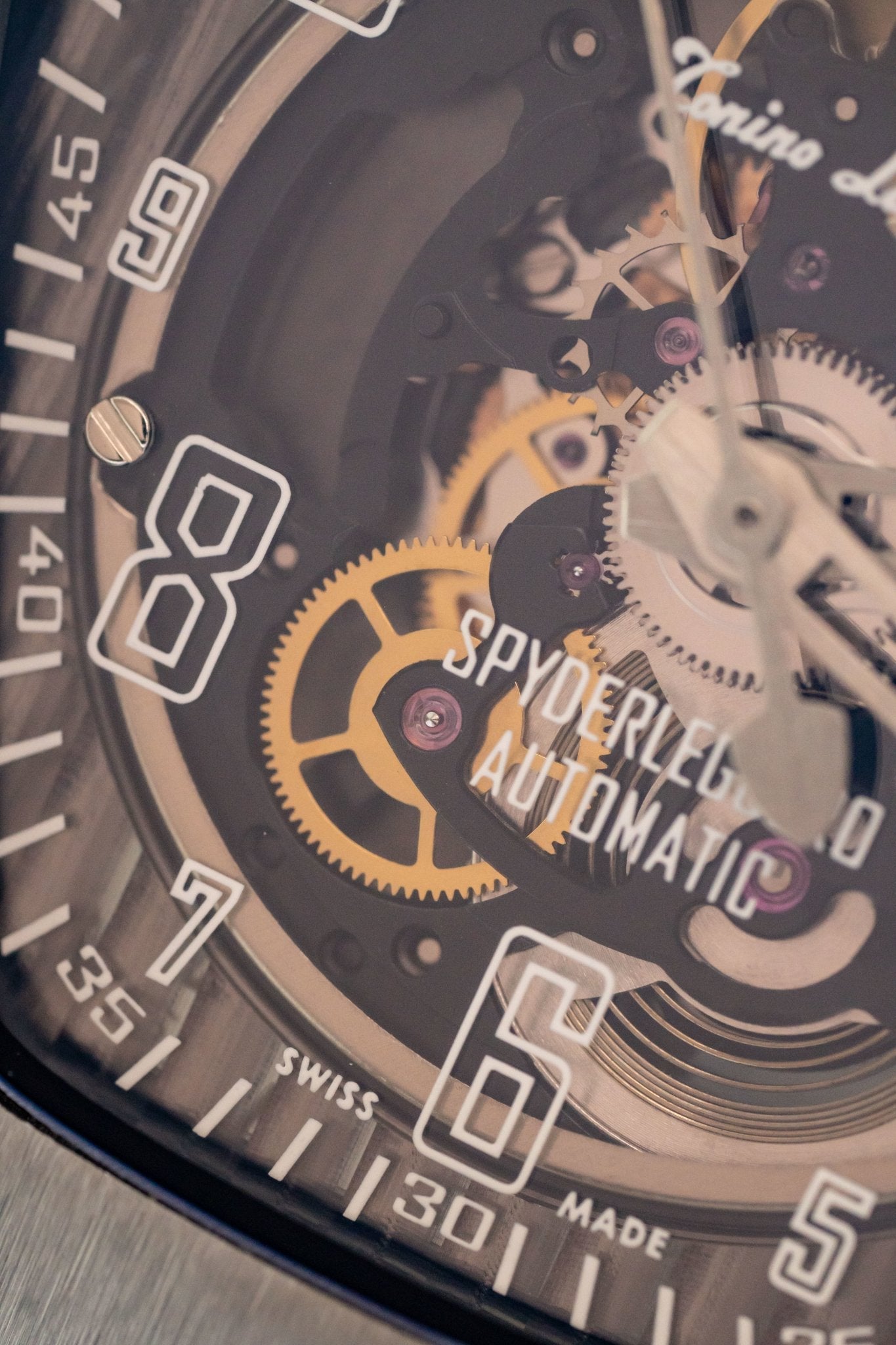 Skeleton Dial with Fumé Sapphire Glass and Luminous Stainless Steel Hands and Markers. Côte de Genève detailing. Tonino Lamborghini Shield at 12 O'Clock.