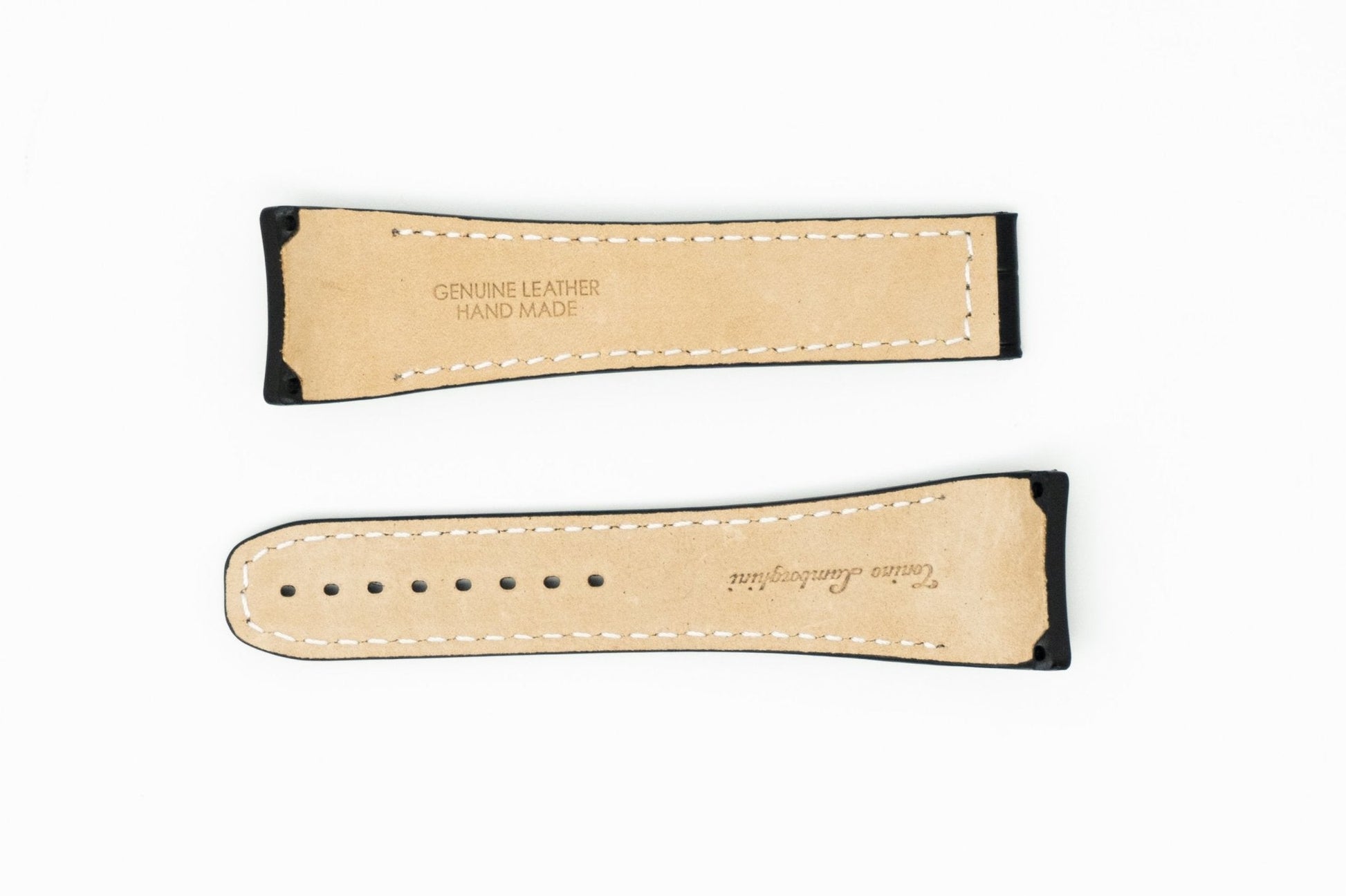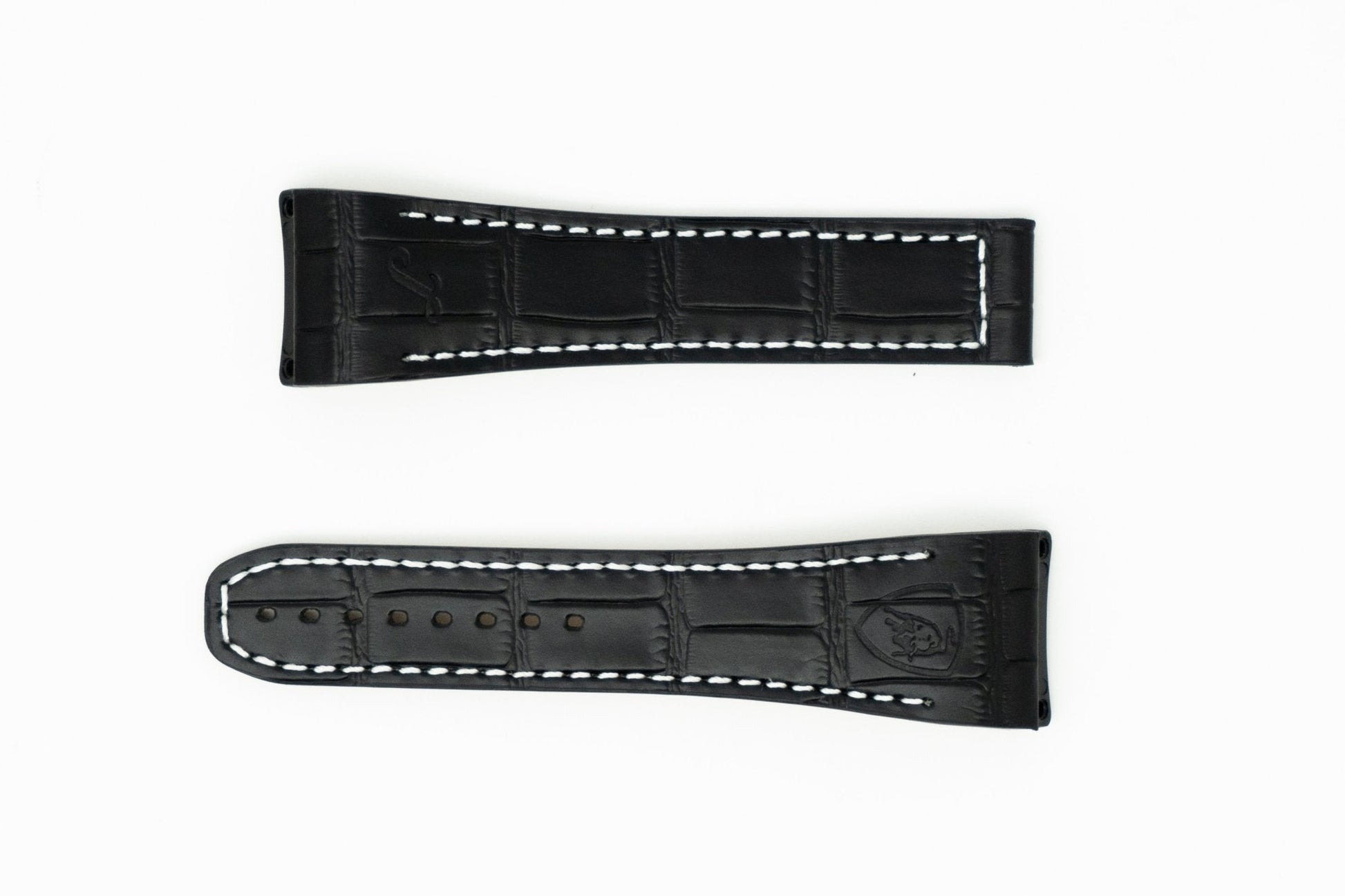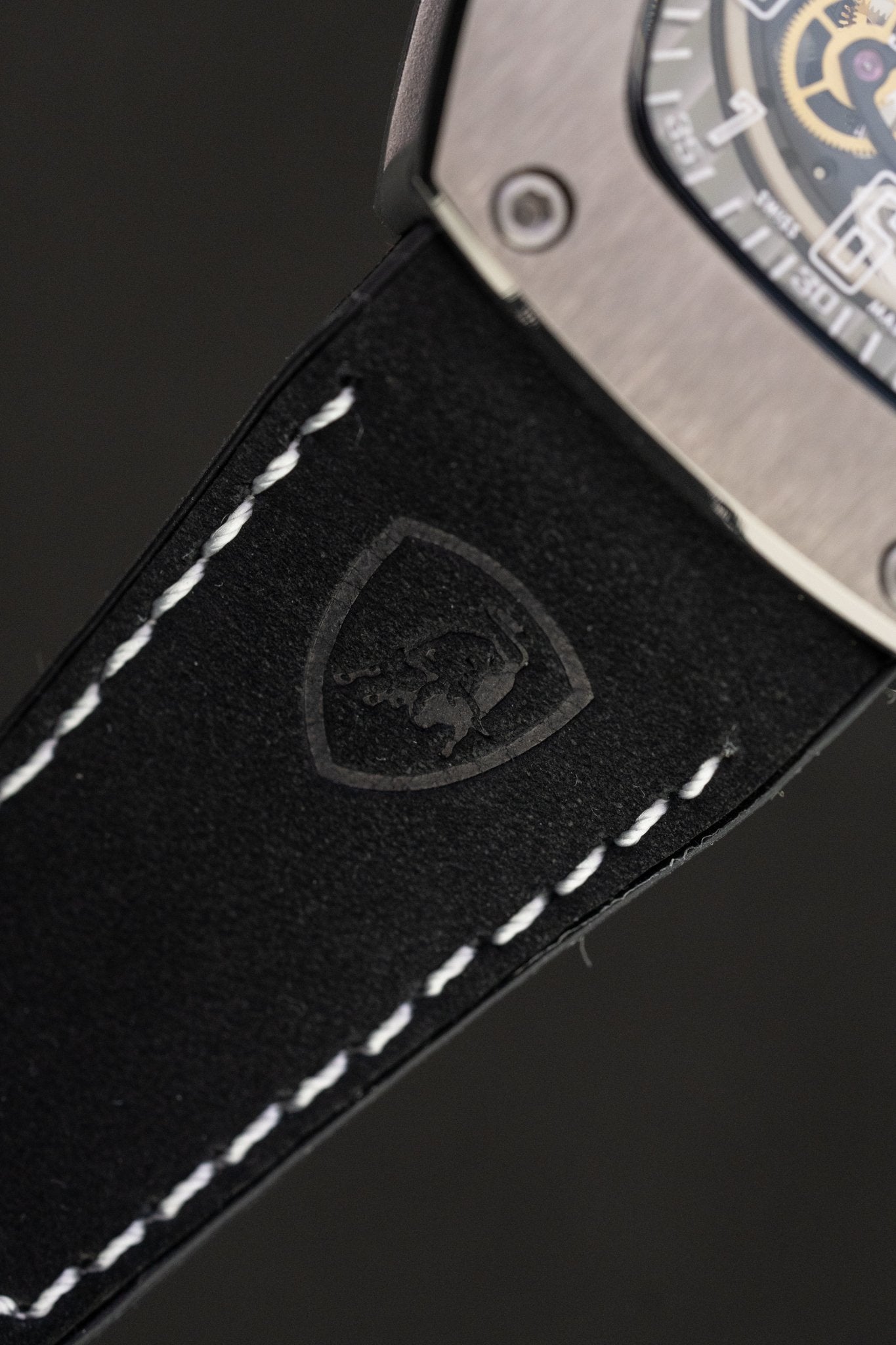 22mm x 20cm Black Rubber Basis Leather Strap with White Stitching. Titanium Deployment Buckle. Tonino Lamborghini Engraved on the Buckle