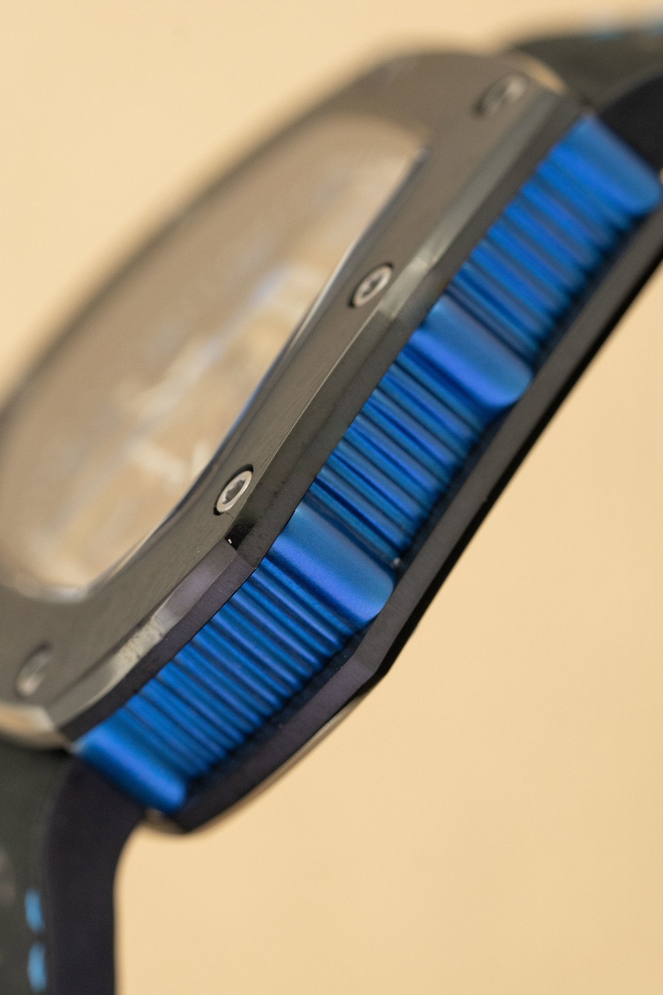51.5mm x 46mm x 12mm Black DLC Titanium Base and Bezel with a Blue Anti-Corodal Aluminium Centre held together with 8 Torx Screws. Anti-Reflective Sapphire Crystal. Titanium Crown. Open Sapphire Crystal Case Back