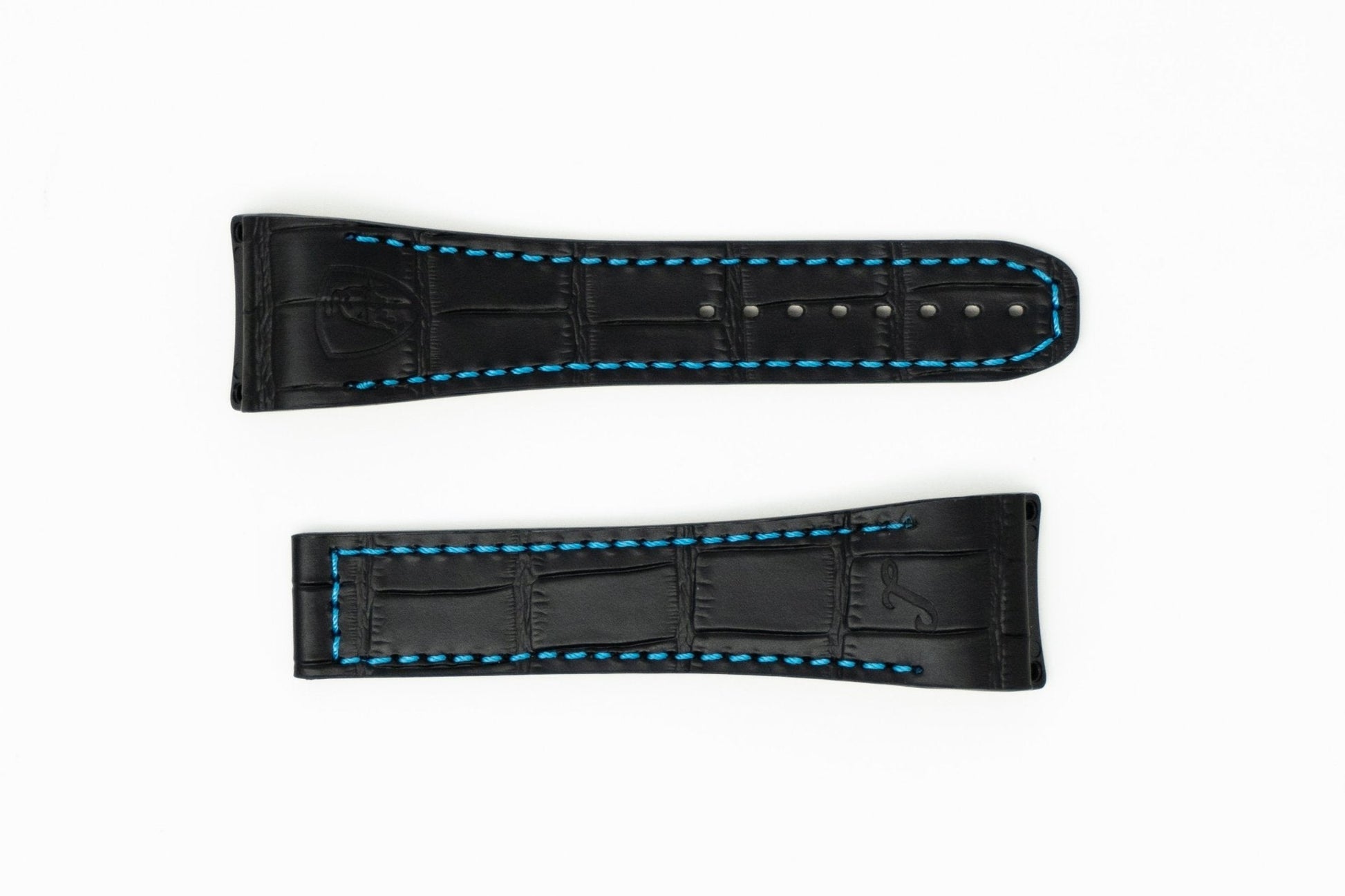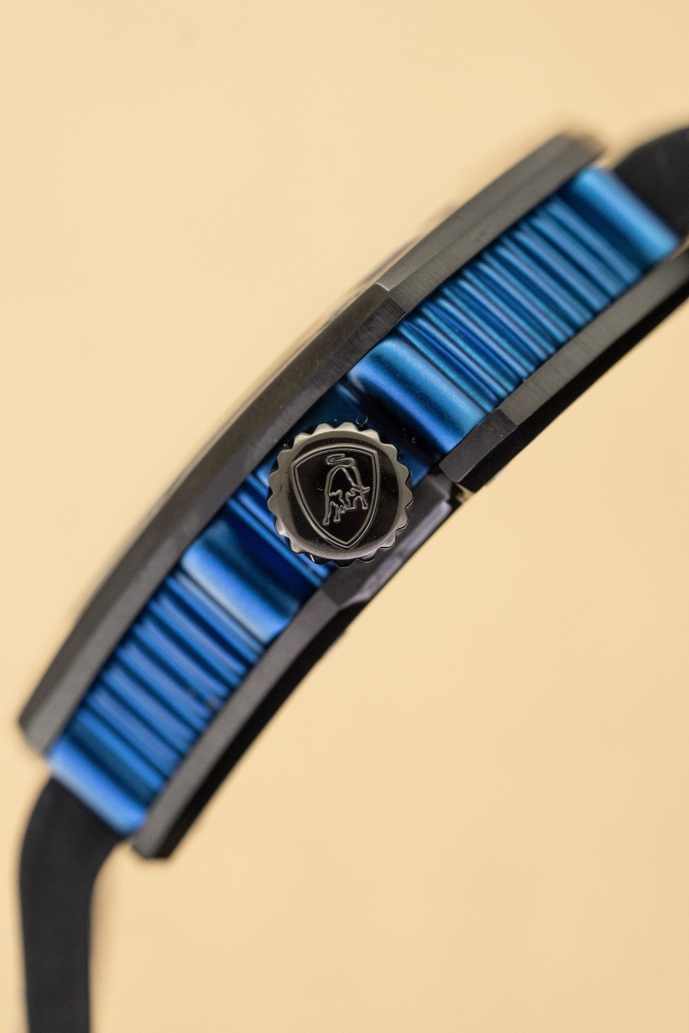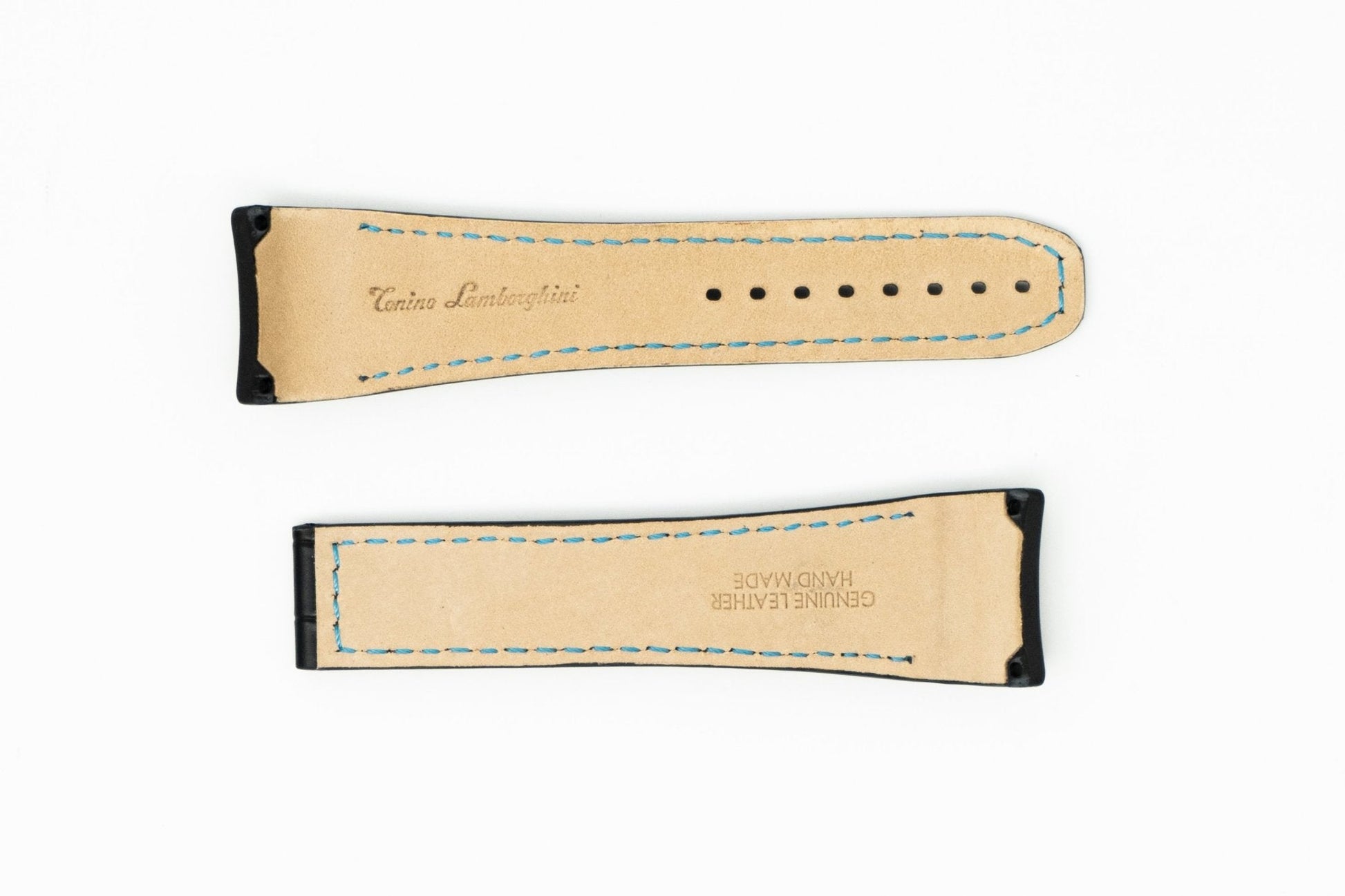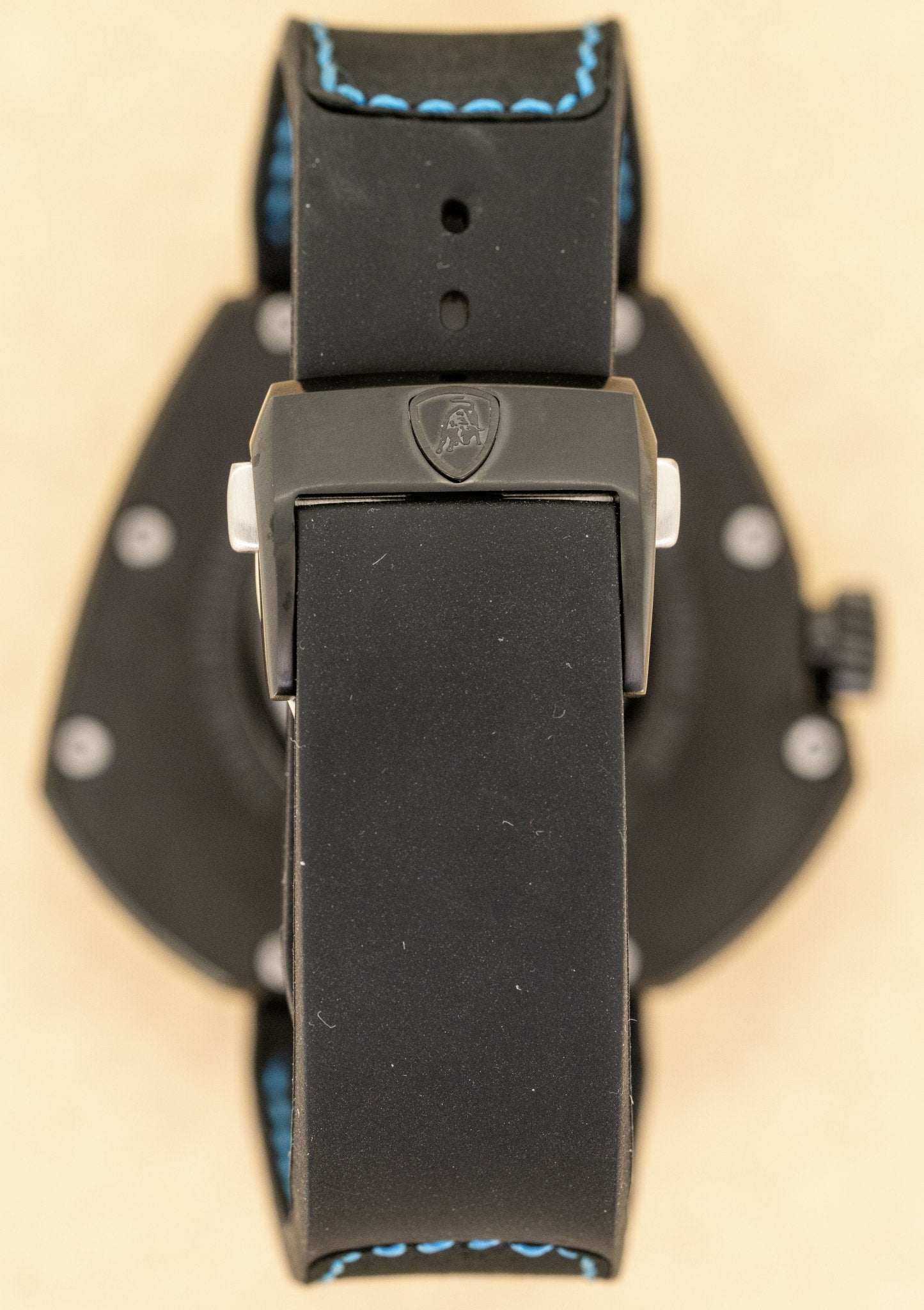 22mm x 20cm Black Rubber Basis Leather Strap with Blue Stitching. Black DLC Titanium Deployment Buckle. Tonino Lamborghini Engraved on the Buckle