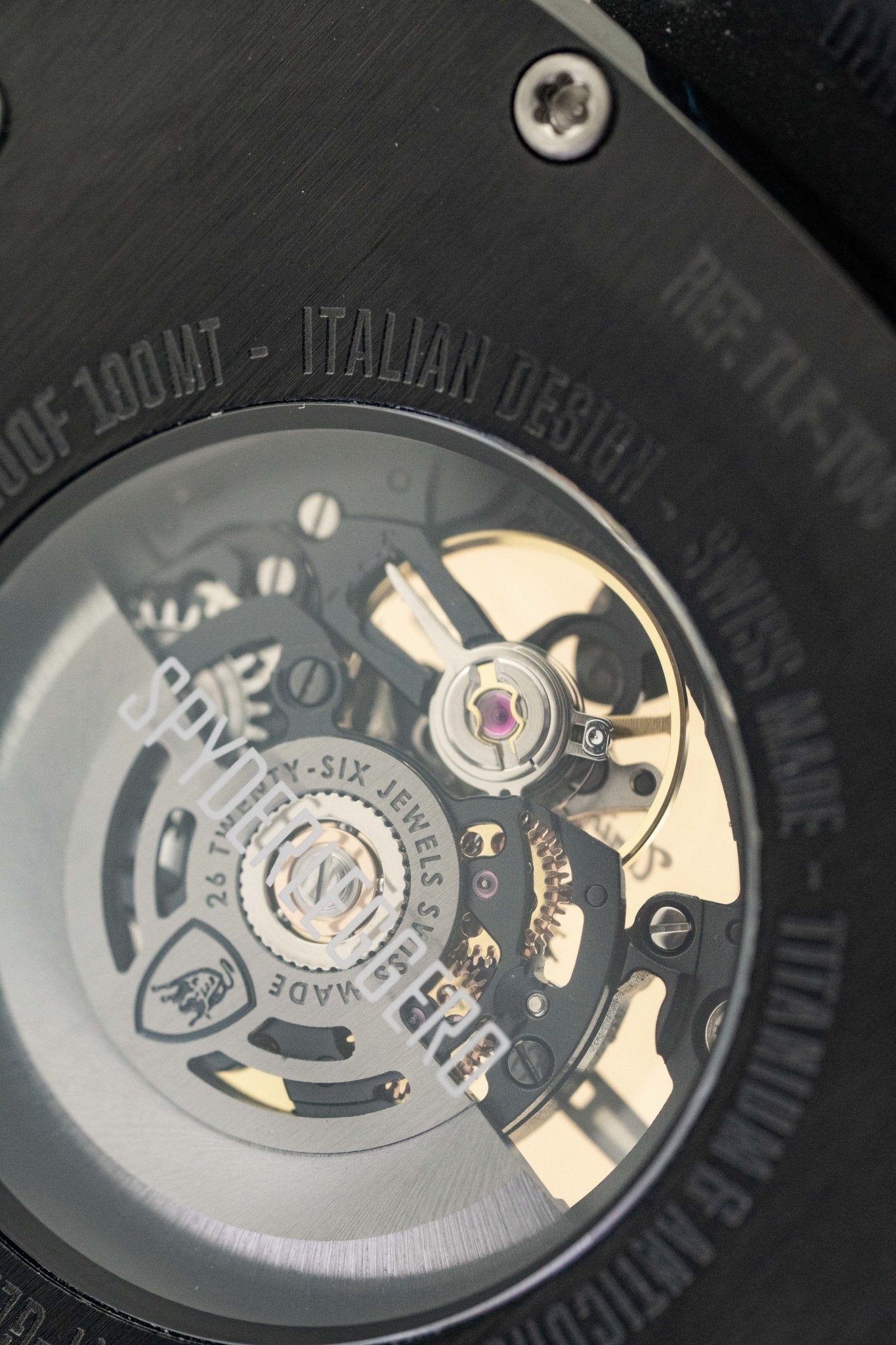 Skeleton Dial with Fumé Sapphire Glass and Luminous Stainless Steel Hands and Markers. Côte de Genève detailing. Tonino Lamborghini Shield at 12 O'Clock.