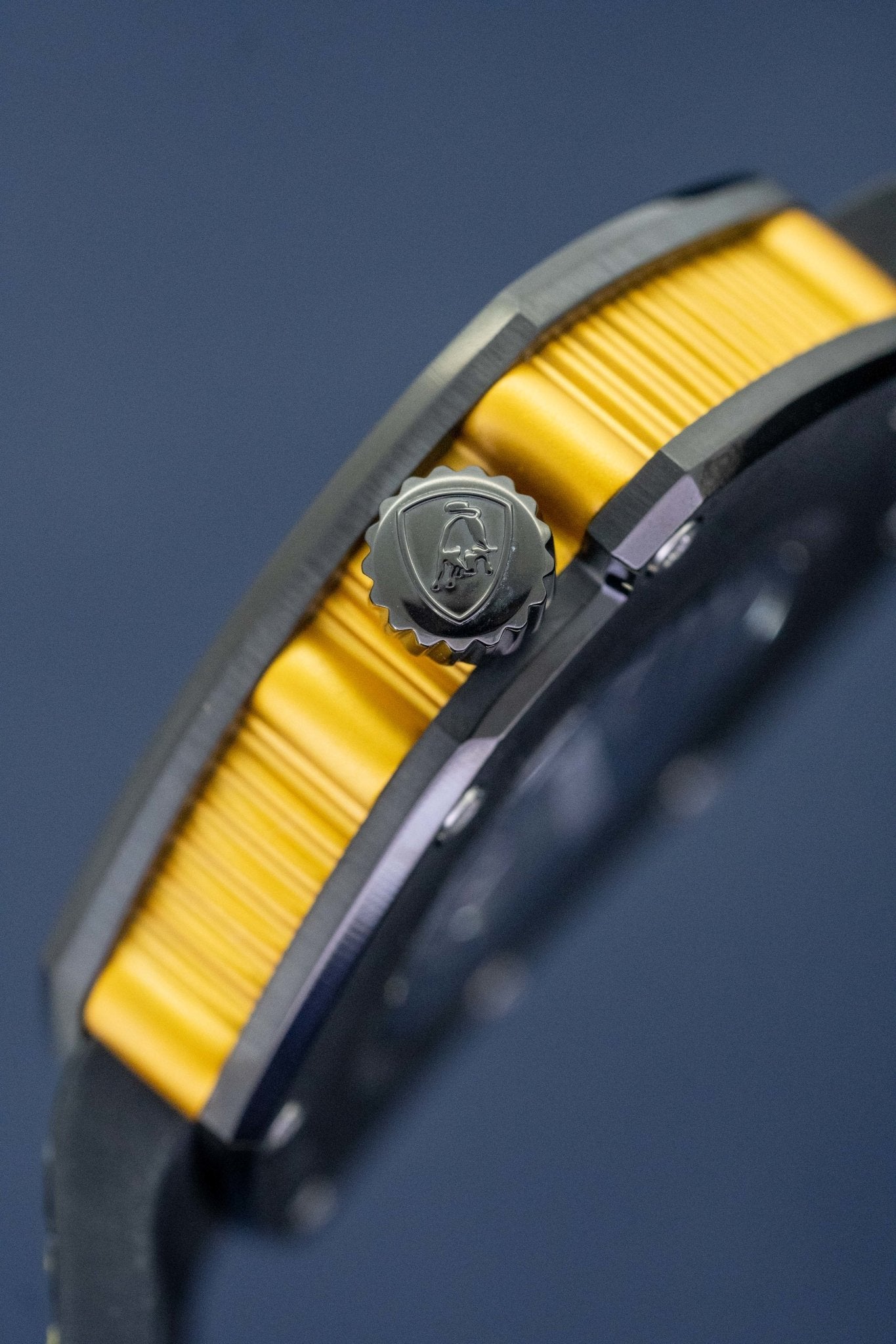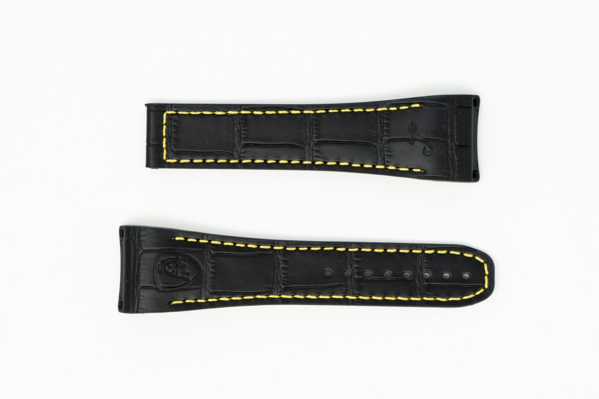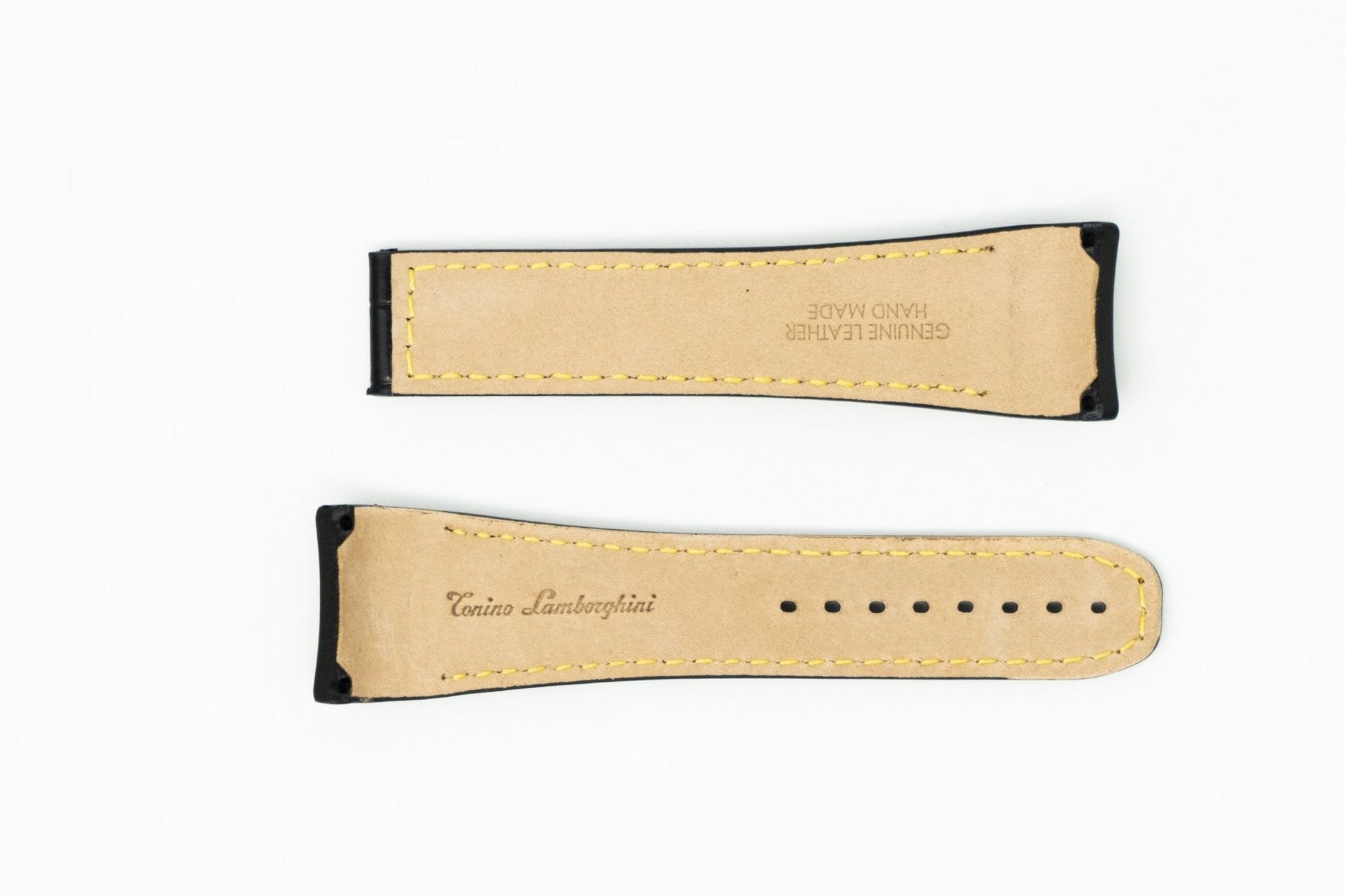22mm x 20cm Black Rubber Basis Leather Strap with Yellow Stitching. Black DLC Titanium Deployment Buckle. Tonino Lamborghini Engraved on the Buckle