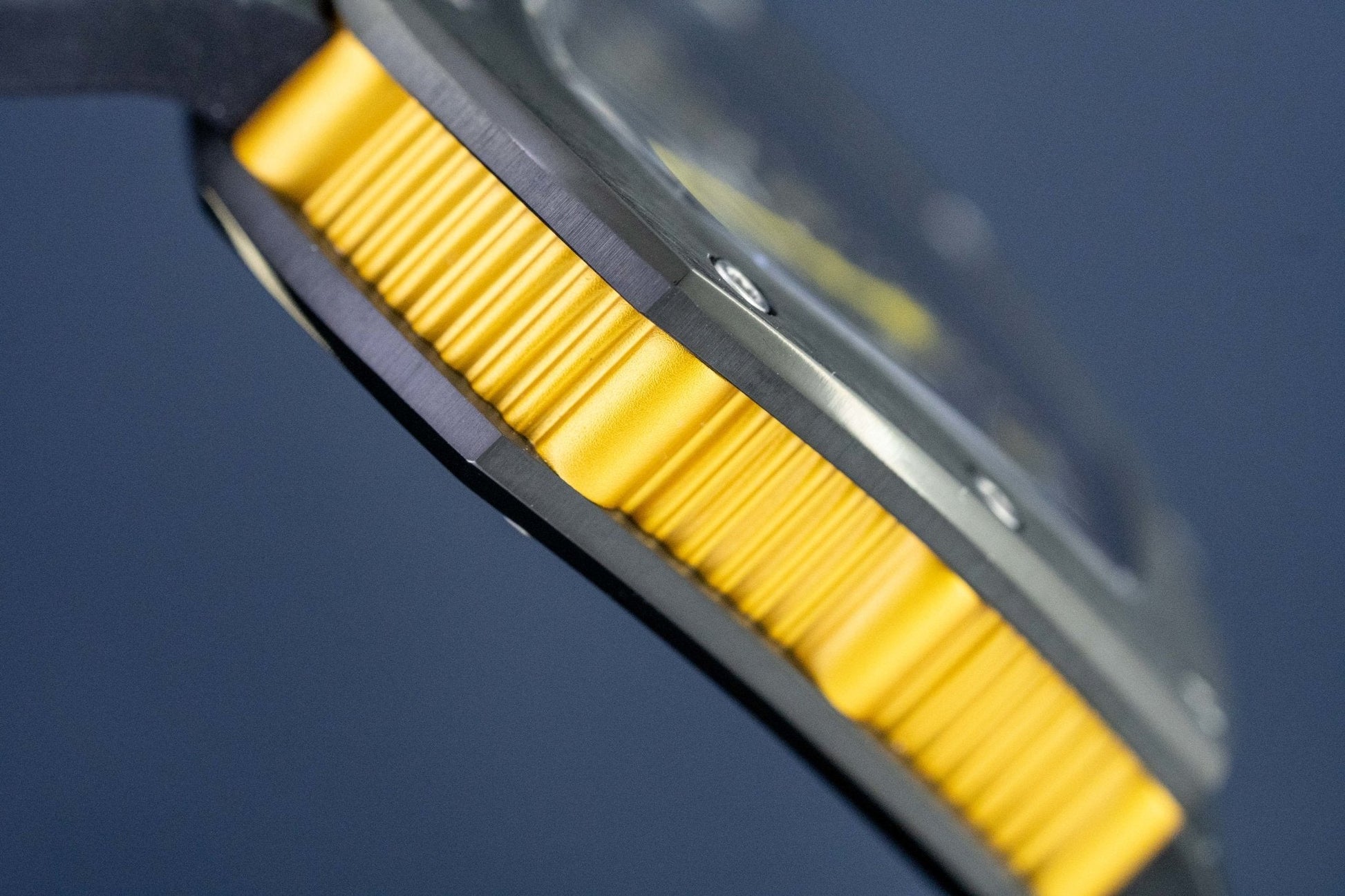 51.5mm x 46mm x 12mm Black DLC Titanium Base and Bezel with a Yellow Anti-Corodal Aluminium Centre held together with 8 Torx Screws. Anti-Reflective Sapphire Crystal. Titanium Crown. Open Sapphire Crystal Case Back