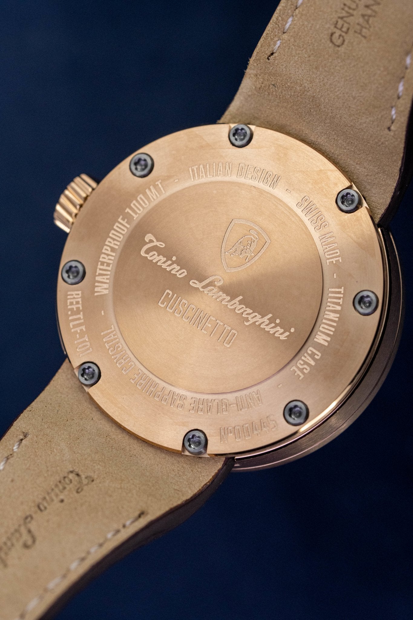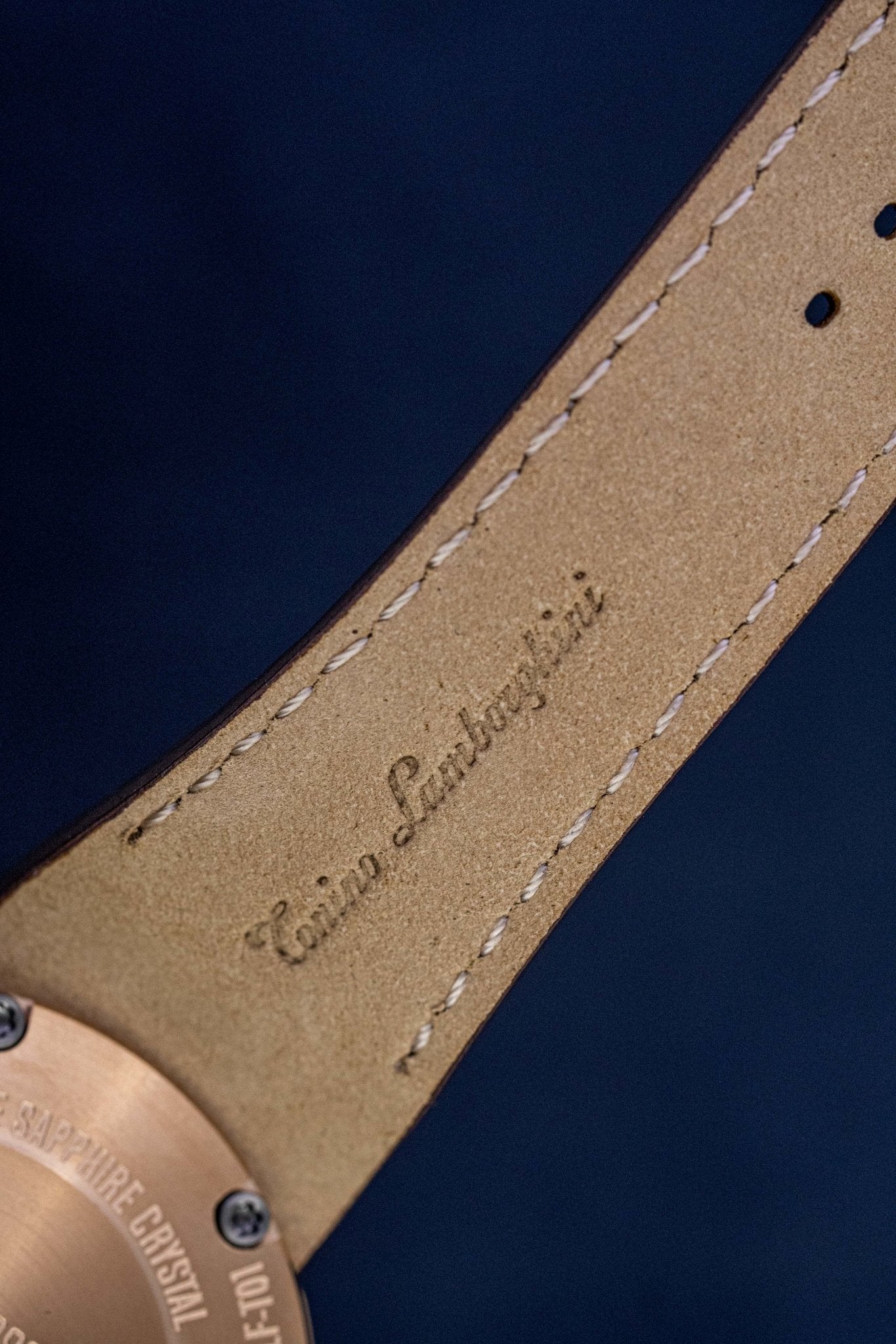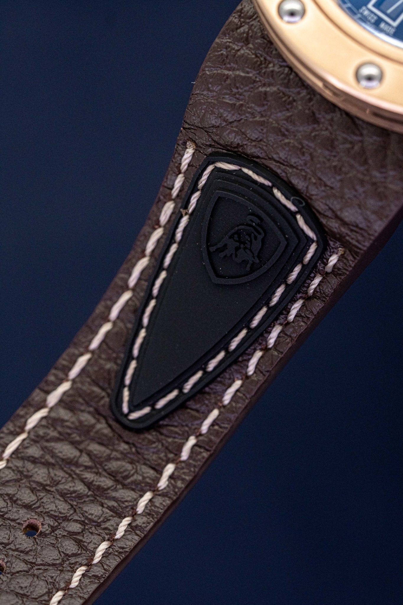 22mm x 20cm Brown Italian Leather Strap with White Stitching and Rubber Inserts. Rose Gold PVD Titanium Deployment Buckle. Tonino Lamborghini Engraved on the Buckle