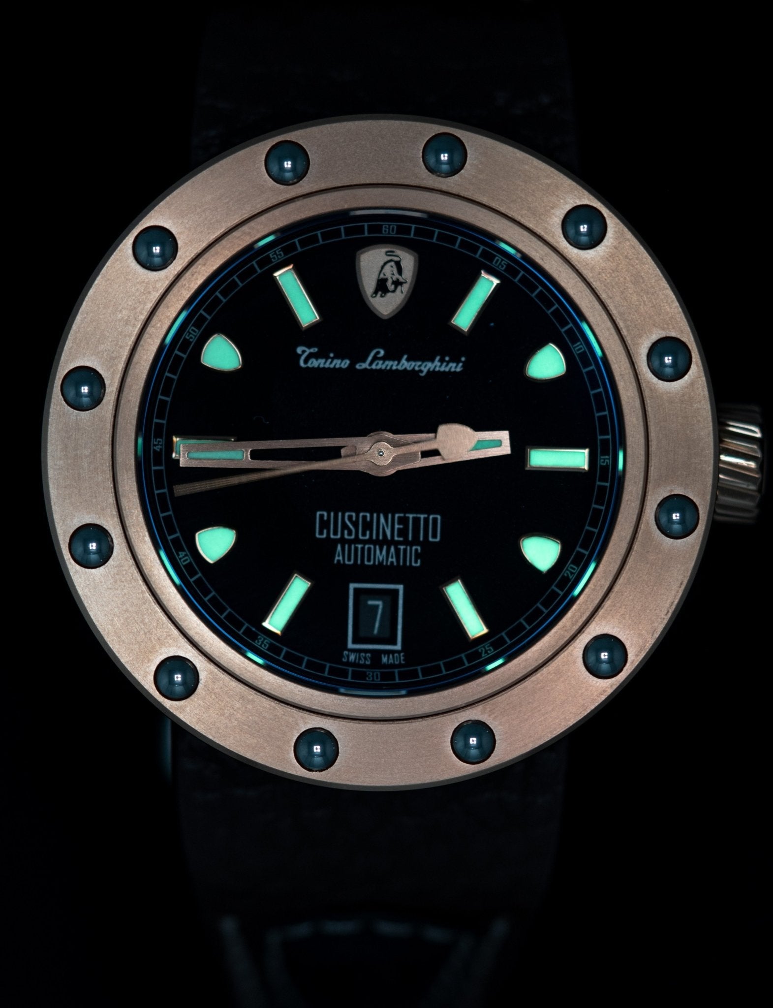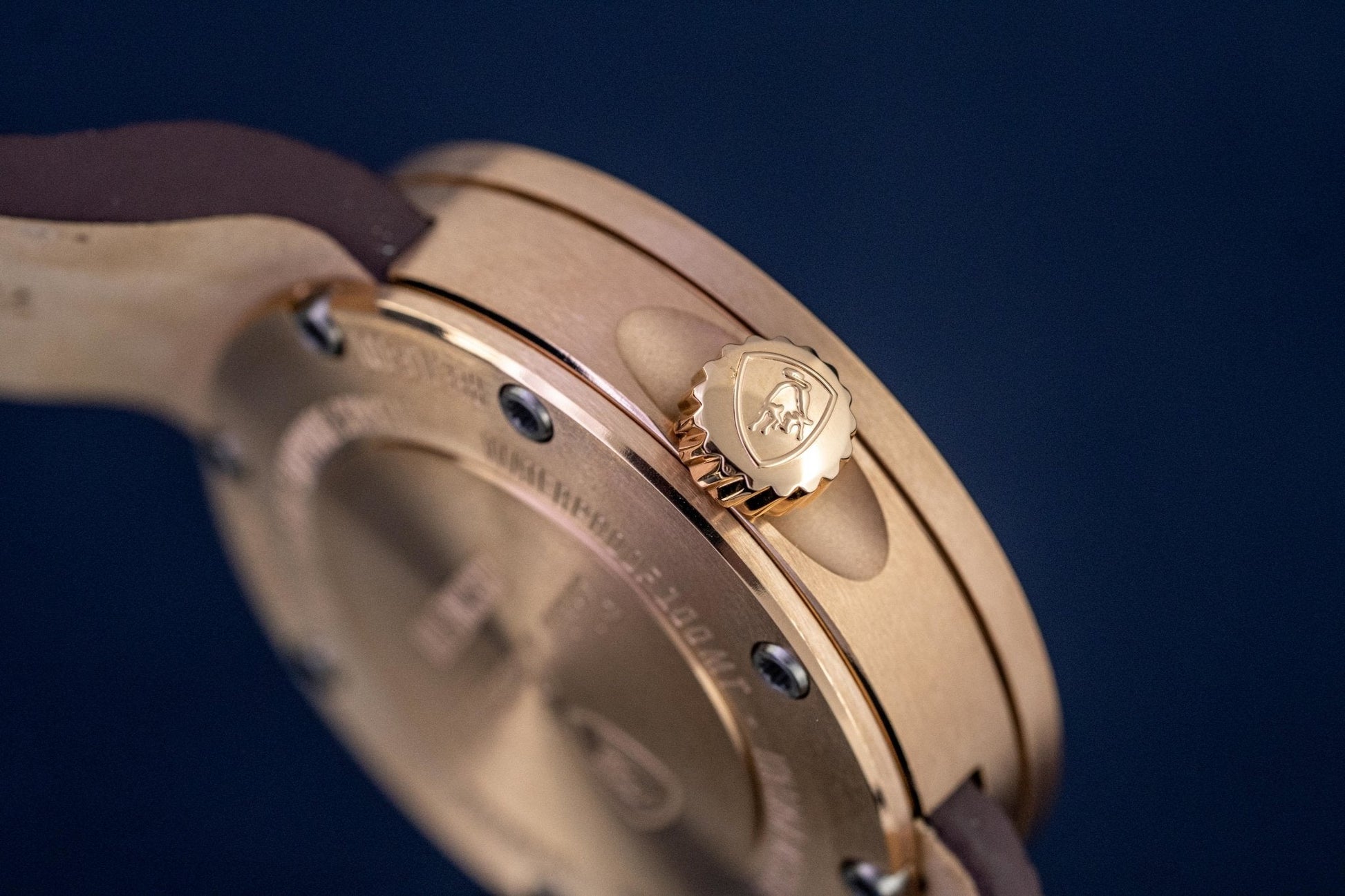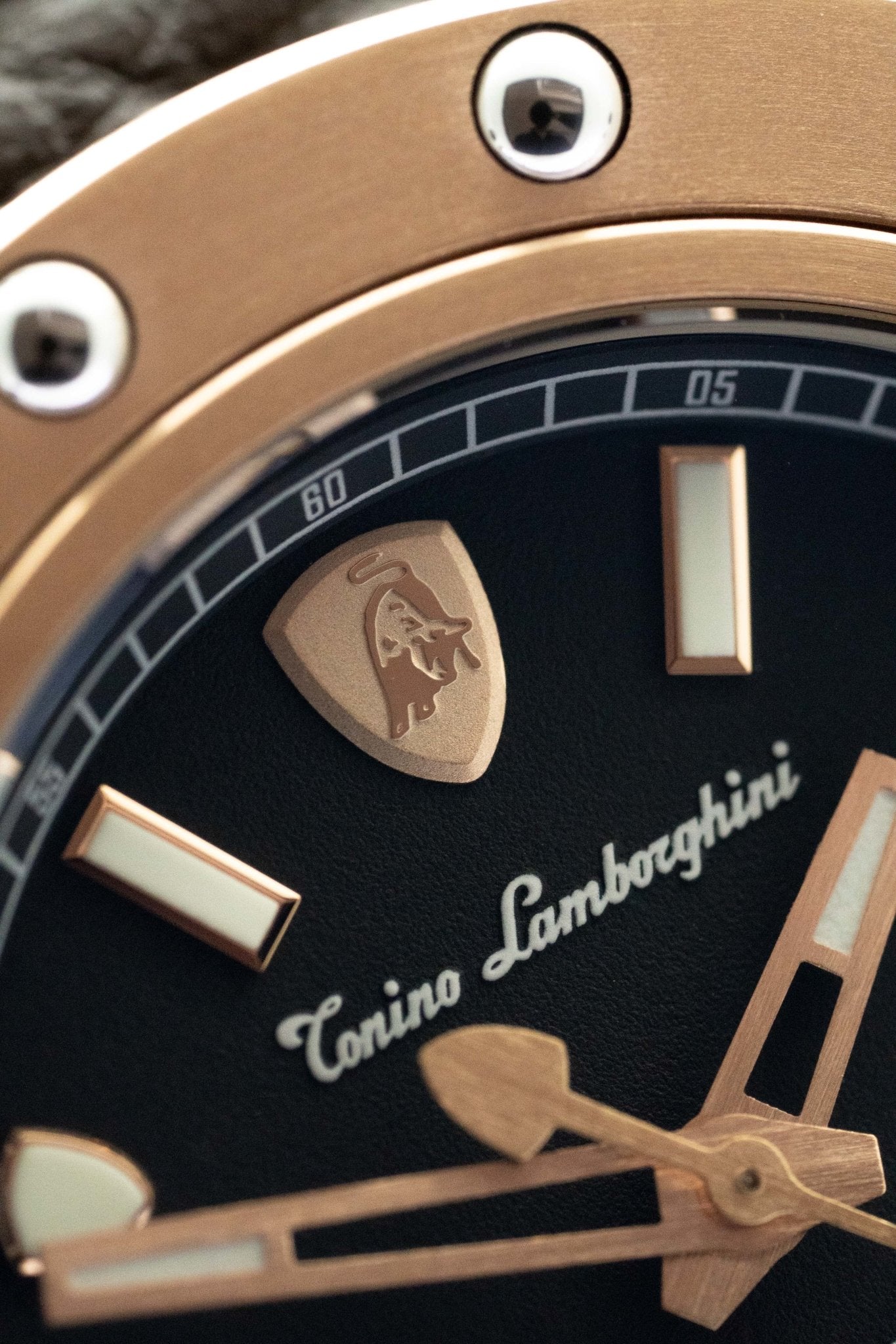 Black Monochrome Dial with Rose Gold Details and Luminous Rose Gold Stainless Steel Hands and Markers. Tonino Lamborghini Shield at 12 O'Clock. Date Window at 6 O'Clock