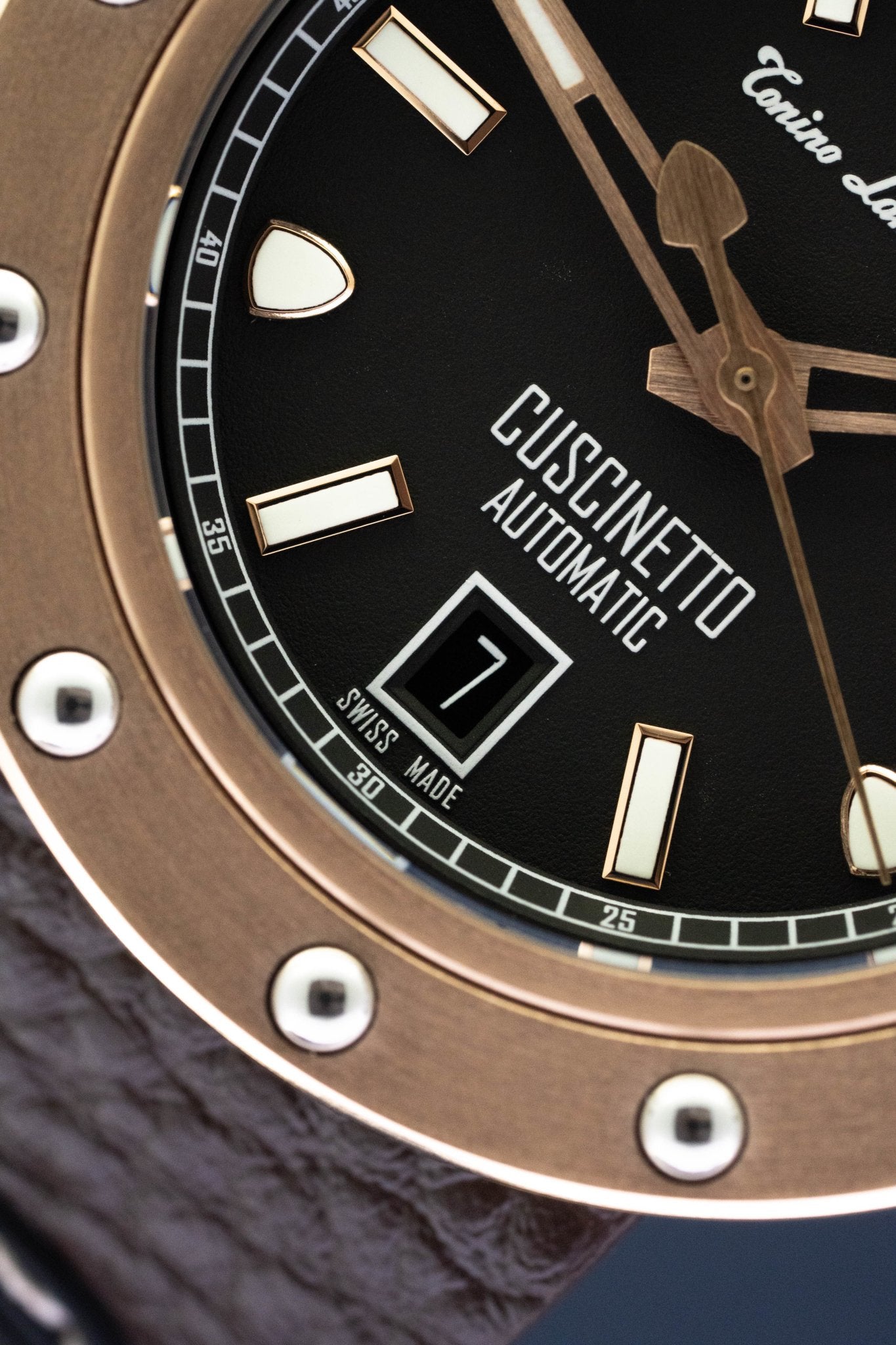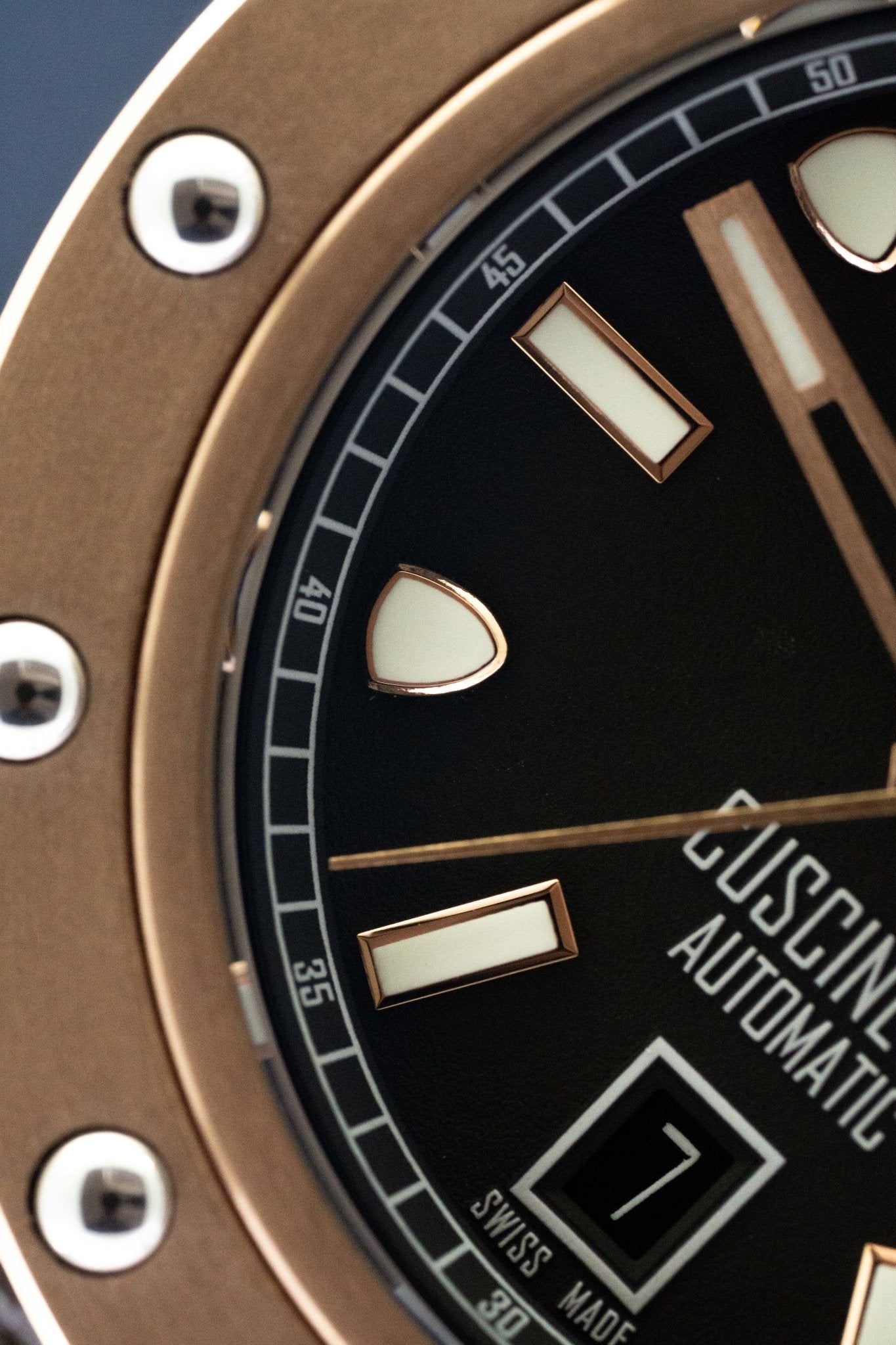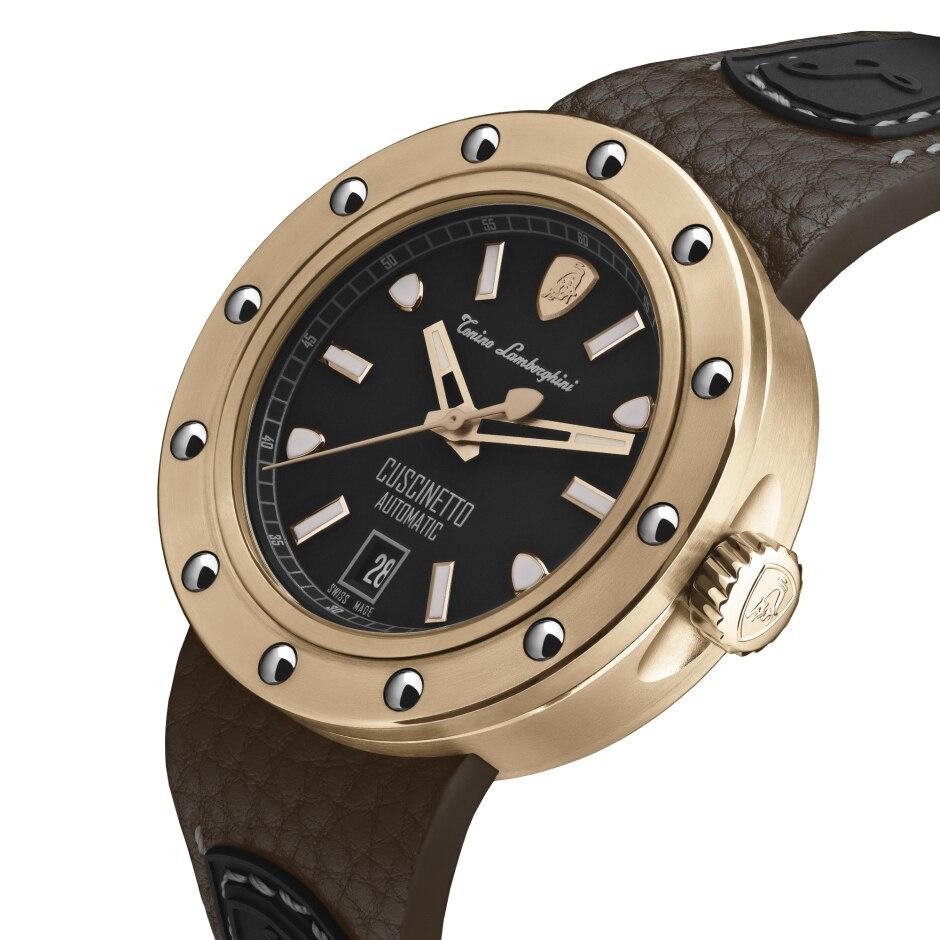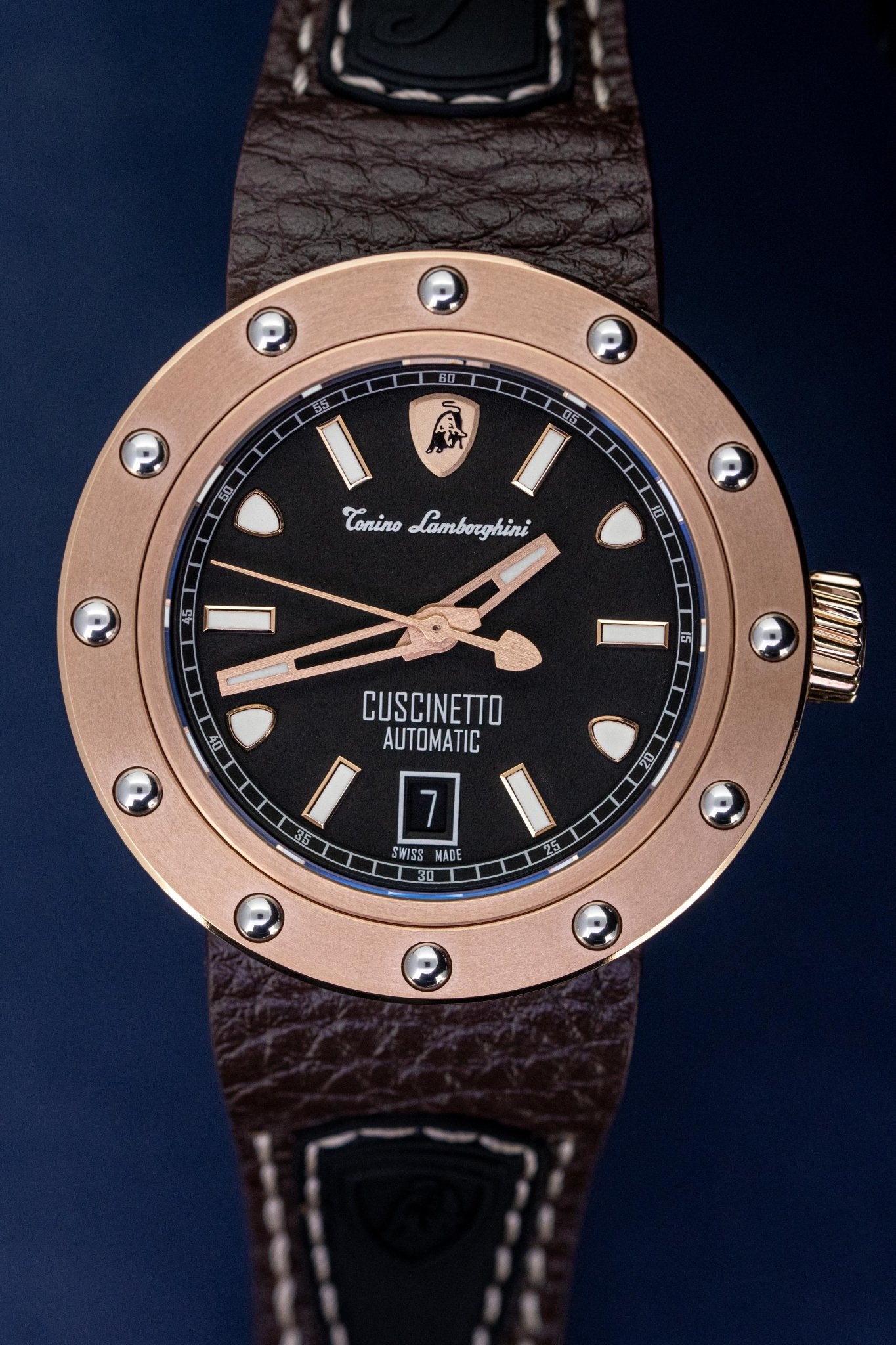 Black Monochrome Dial with Rose Gold Details and Luminous Rose Gold Stainless Steel Hands and Markers. Tonino Lamborghini Shield at 12 O'Clock. Date Window at 6 O'Clock