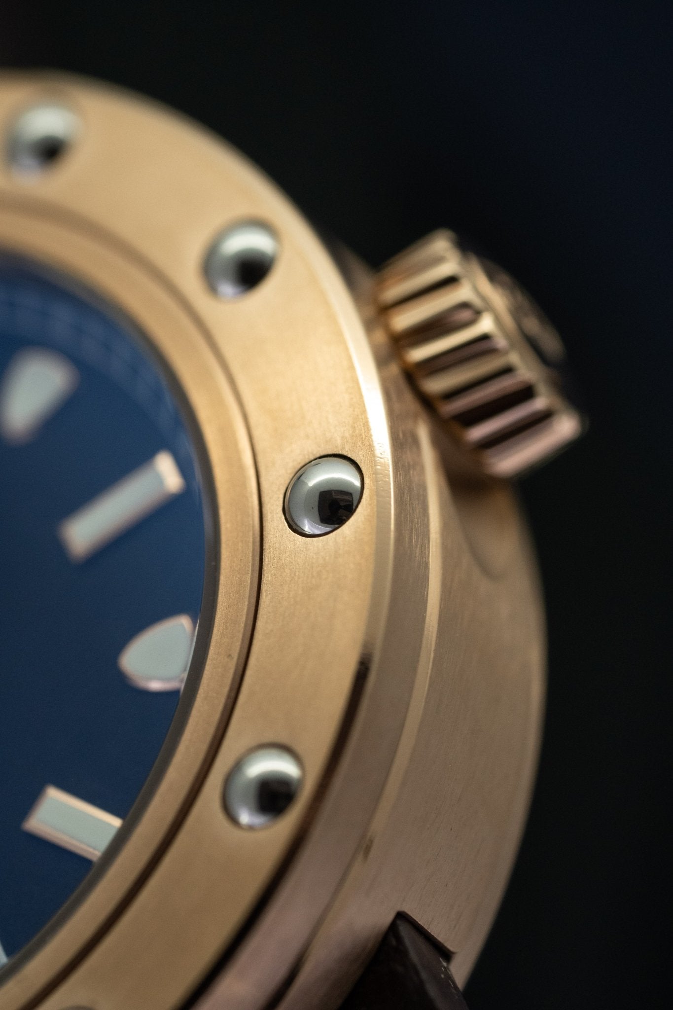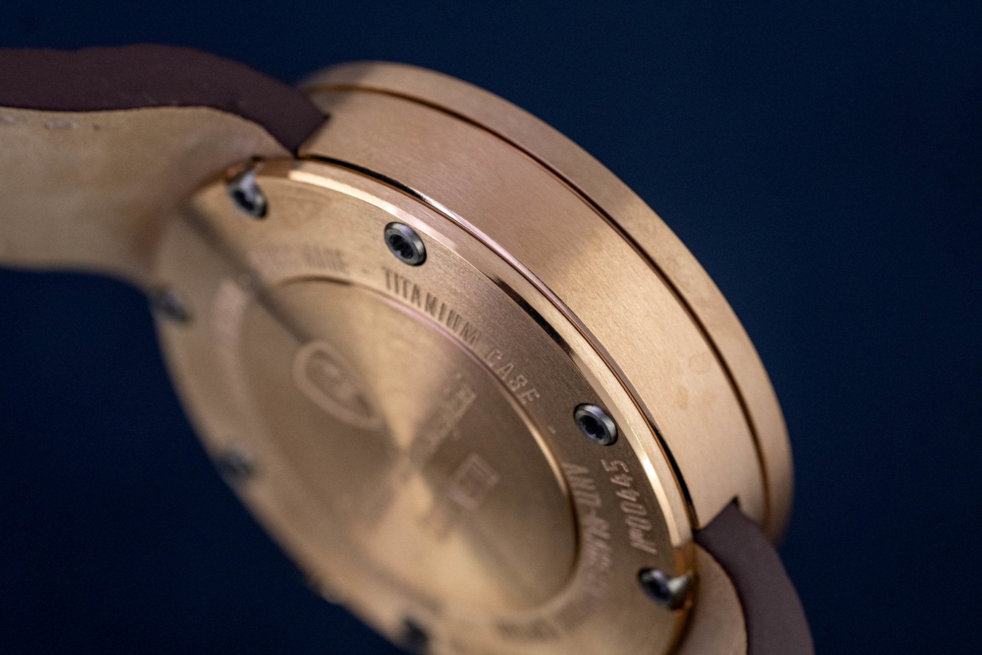 42mm x 12mm Rose Gold PVD Titanium Case with Satin Finish. Anti-Reflective Sapphire Crystal. Screw Down, Double Seal, Titanium Crown. Bi-Directional Rose Gold PVD Titanium Bezel with Applied Ball Bearings.