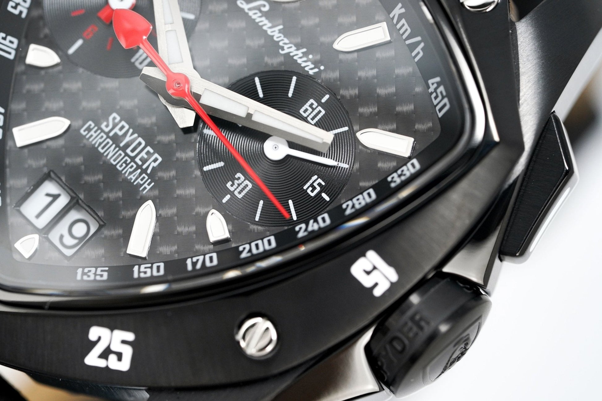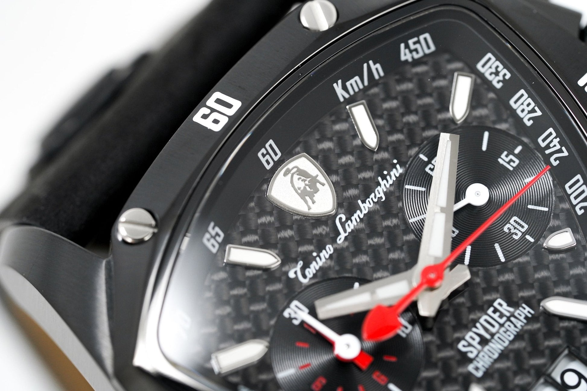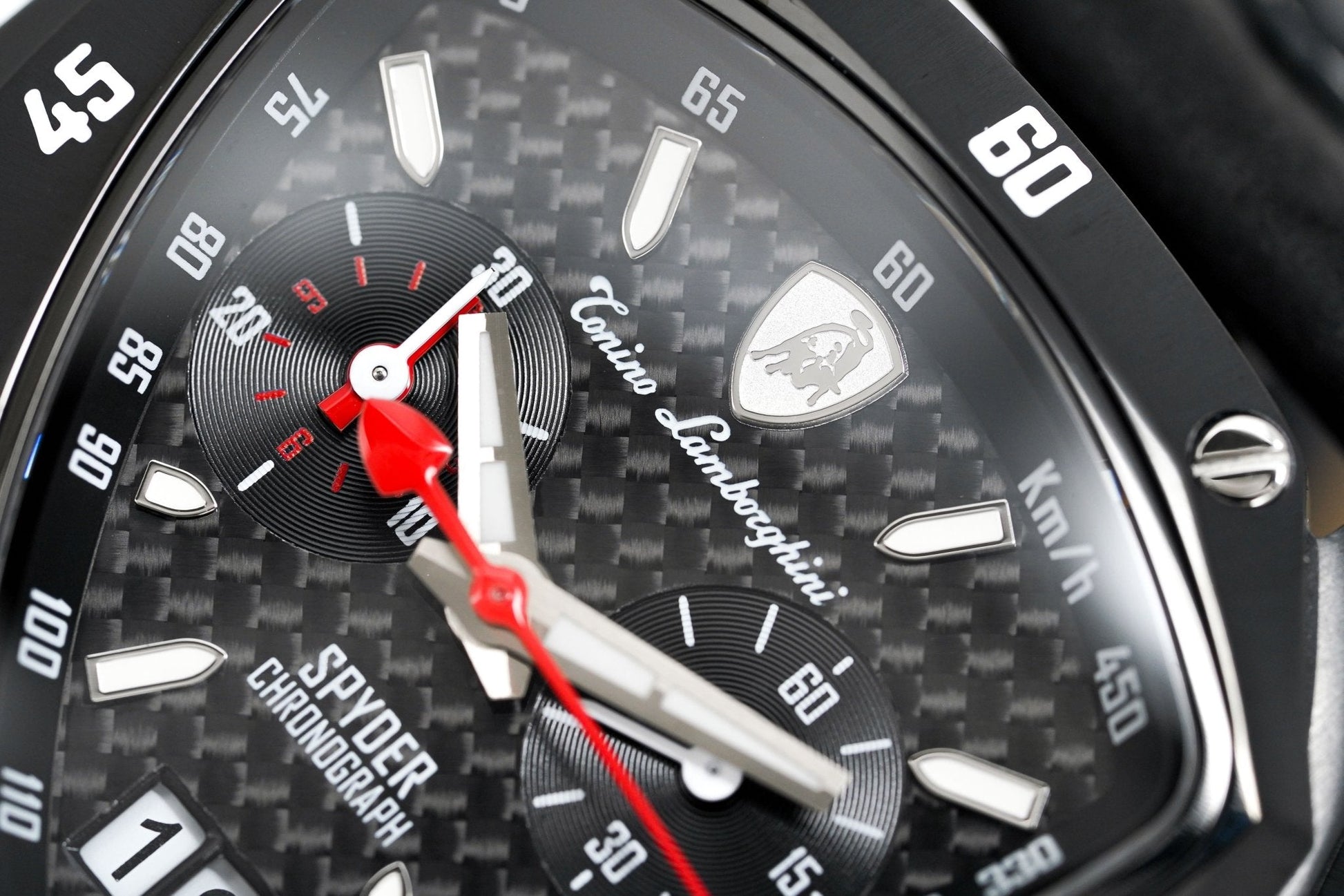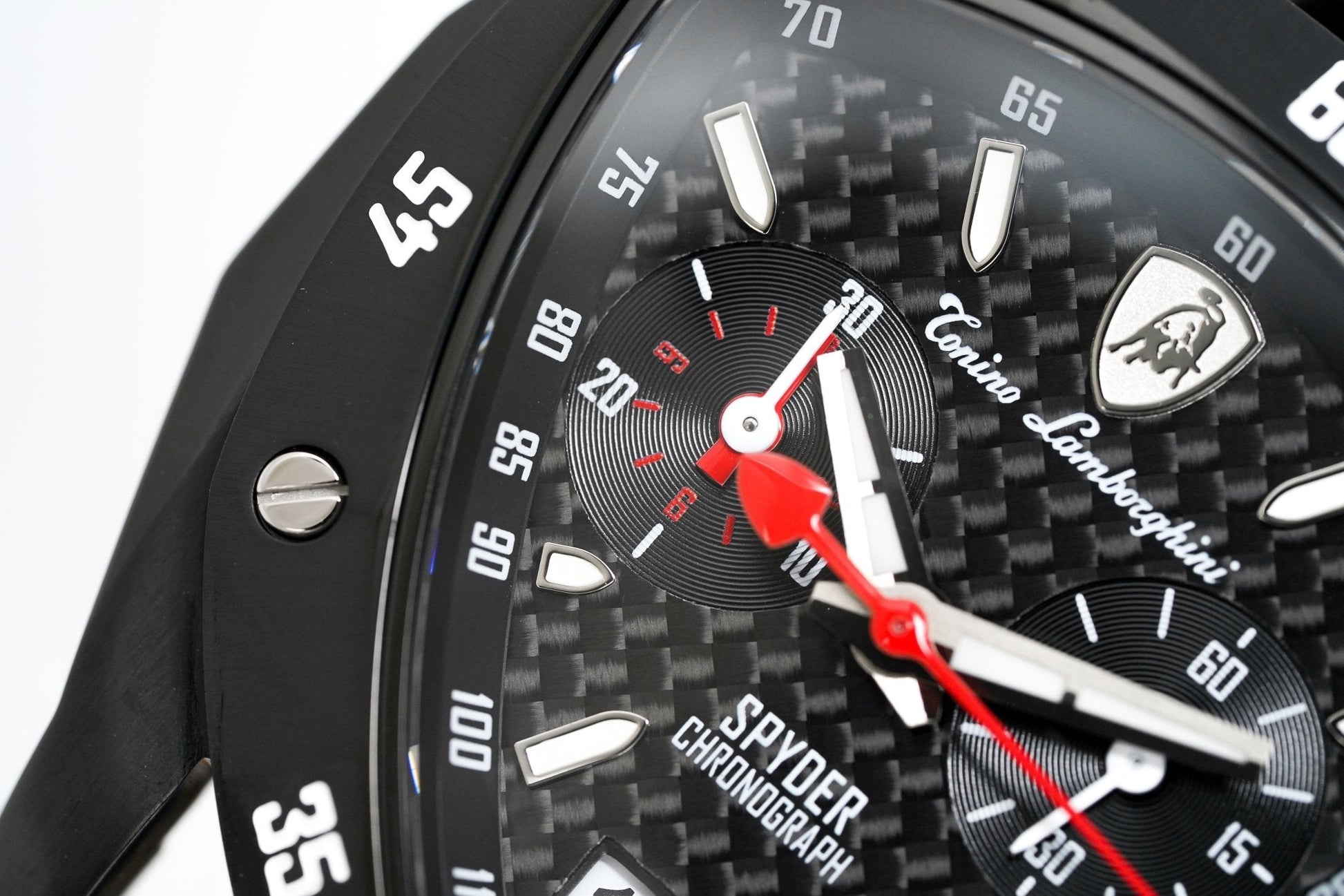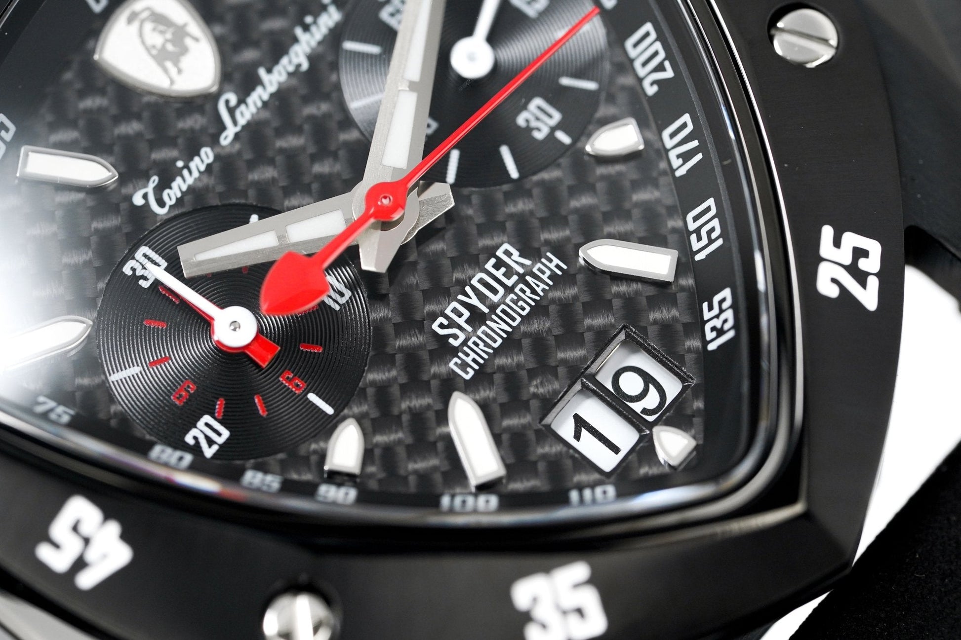 Black Carbon Fibre Textured Dial - Luminous Stainless Steel Hands and White Hour Markers - Tonino Lamborghini Shield at 12 O'Clock - Date at 6 O'Clock - 2 Sub-Dials.