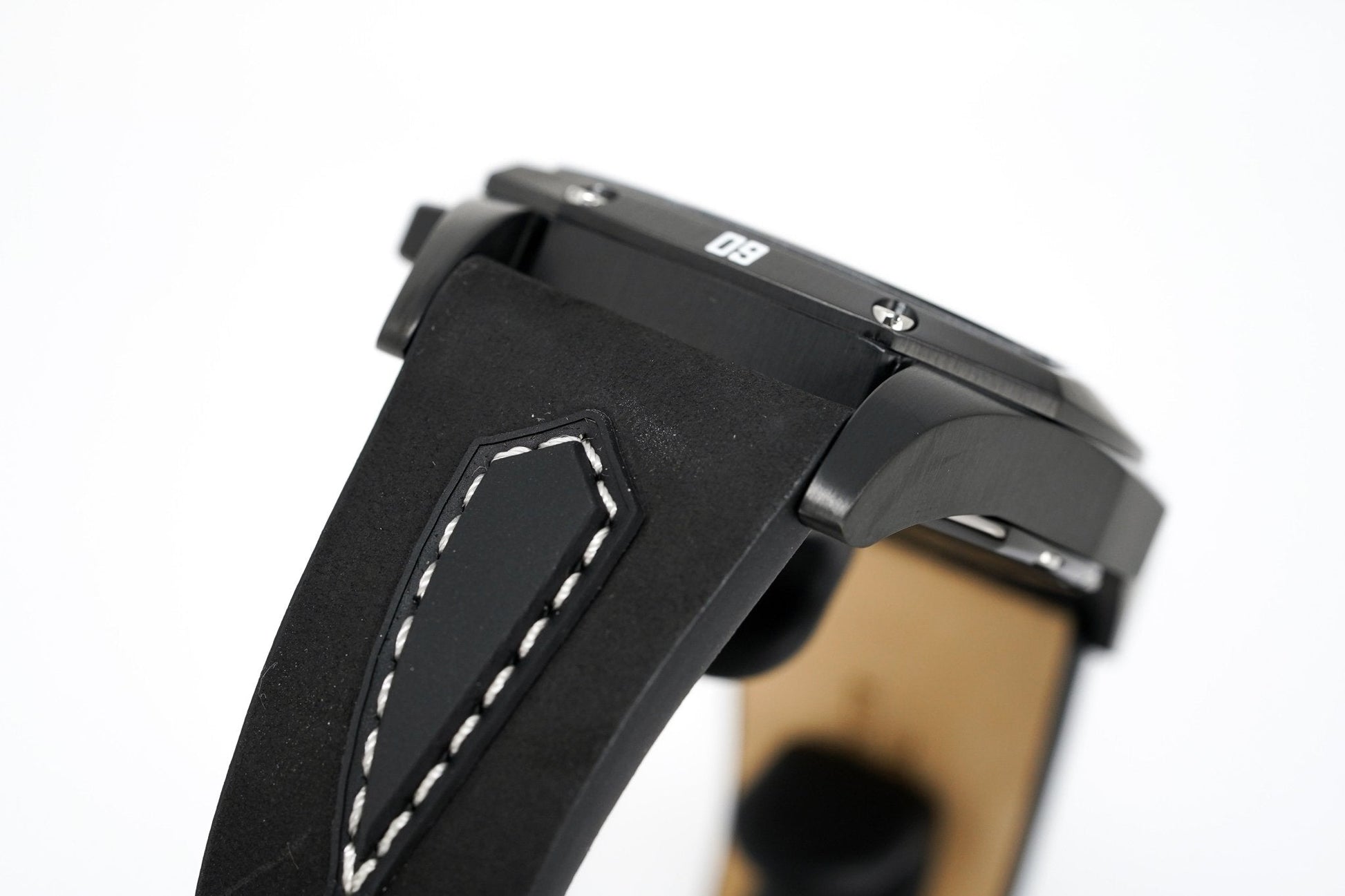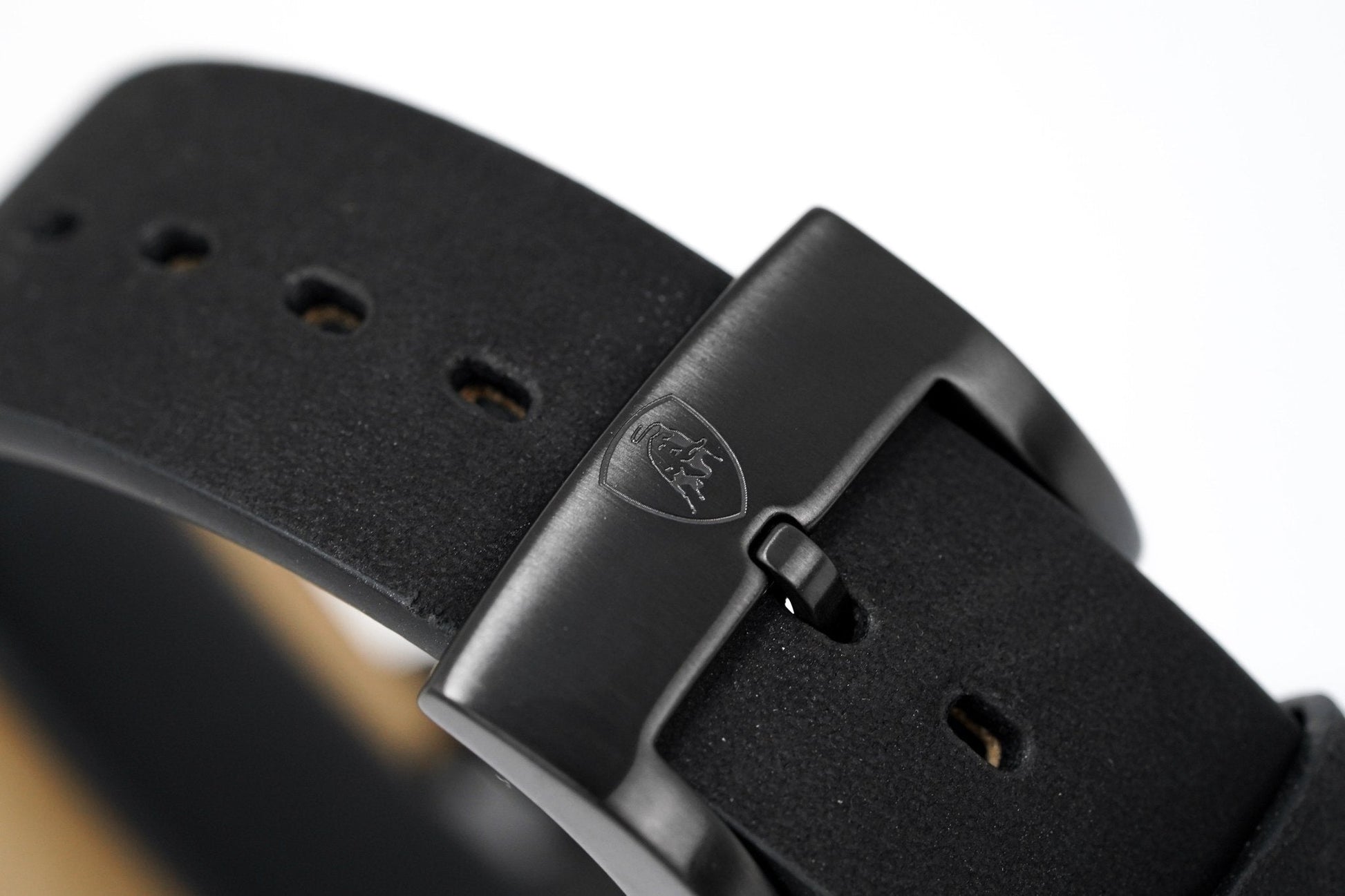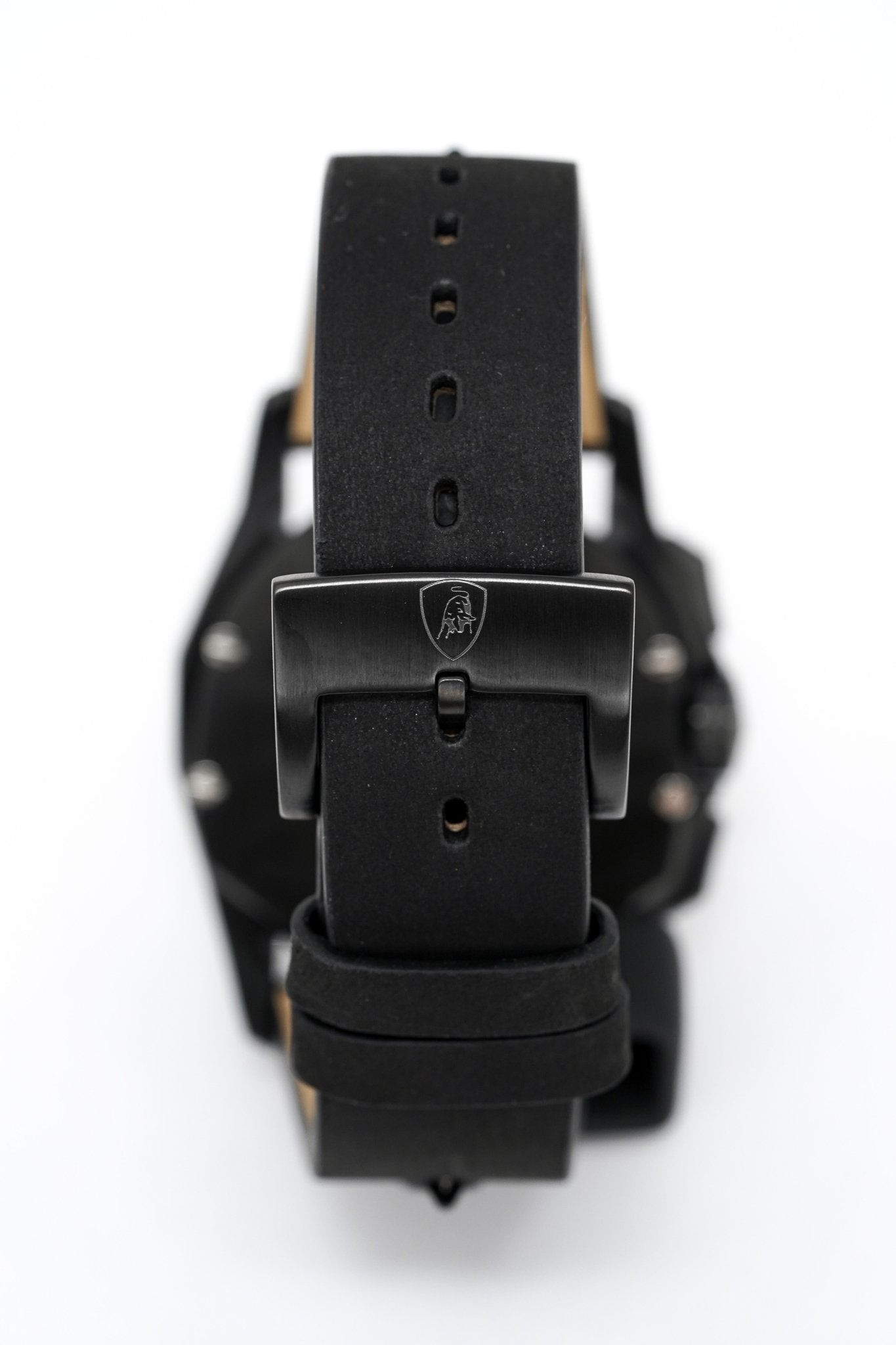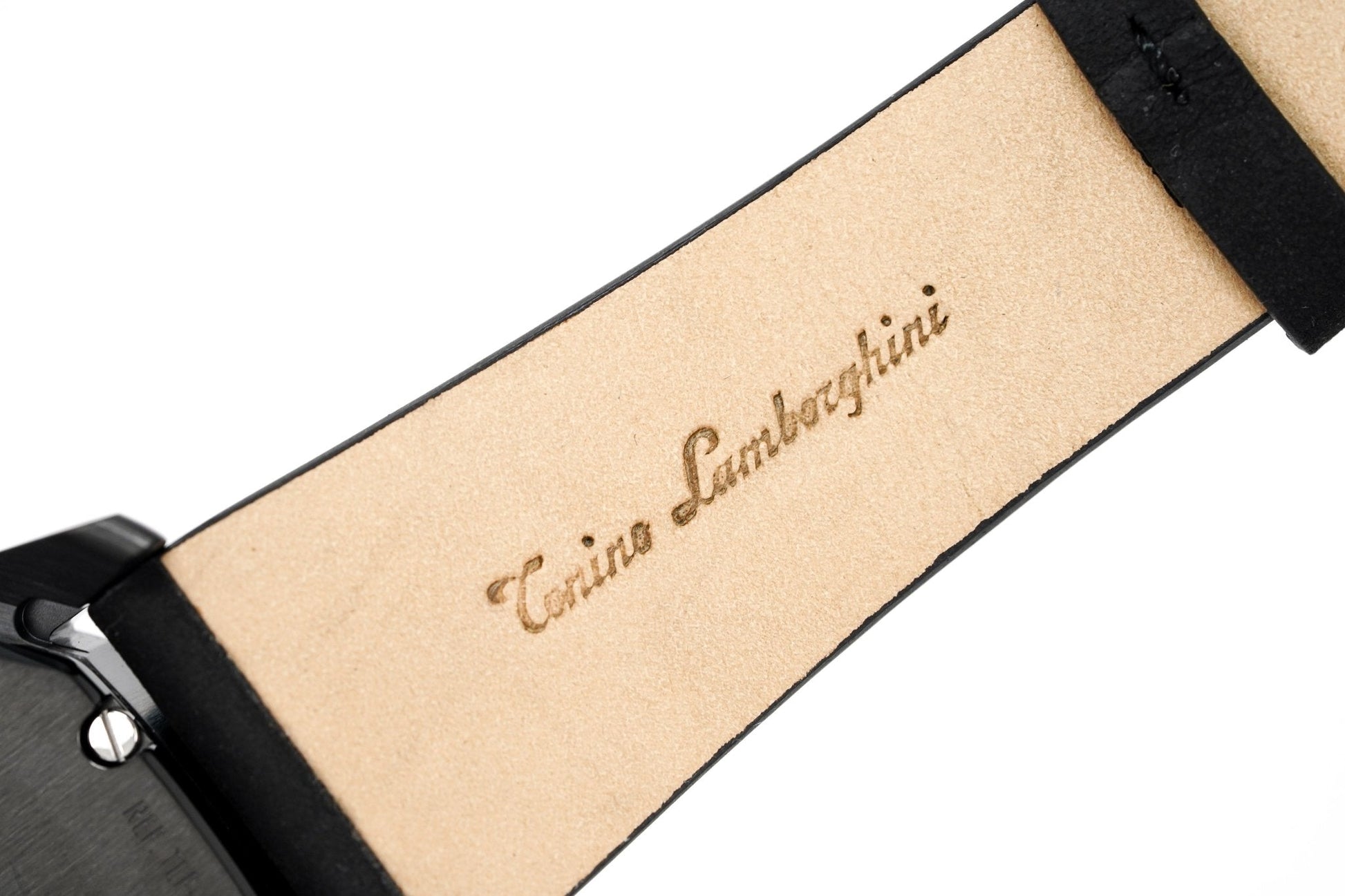 24/18mm x 18cm Black Suede Leather Strap with White Stitching and Black Rubber Inserts - Black PVD 316L Stainless Steel Tang Buckle with Tonino Lamborghini Engraved on the Buckle.